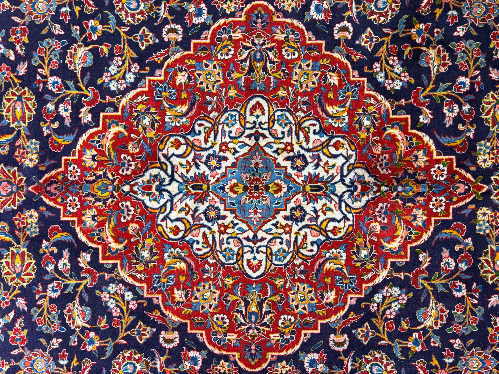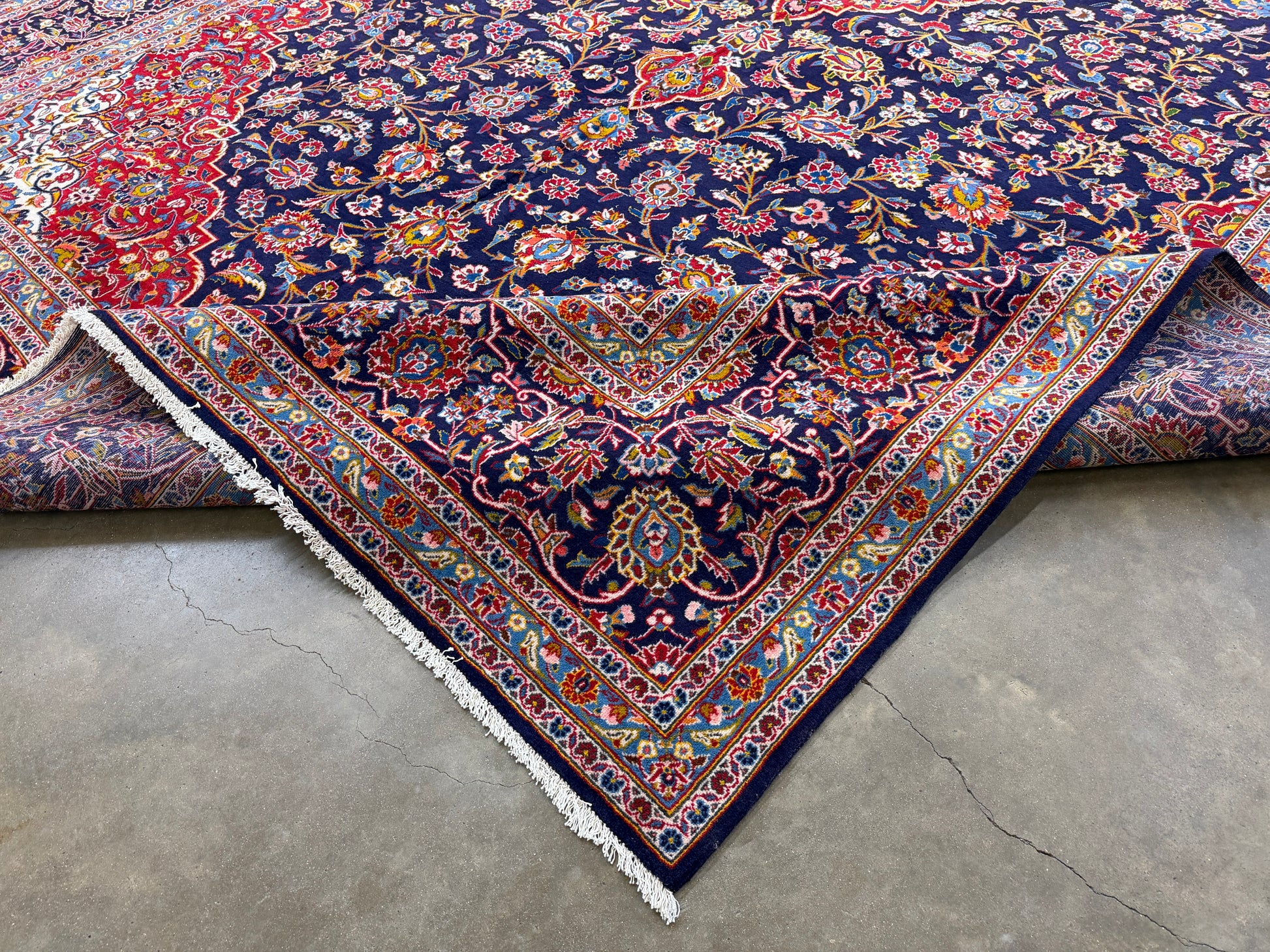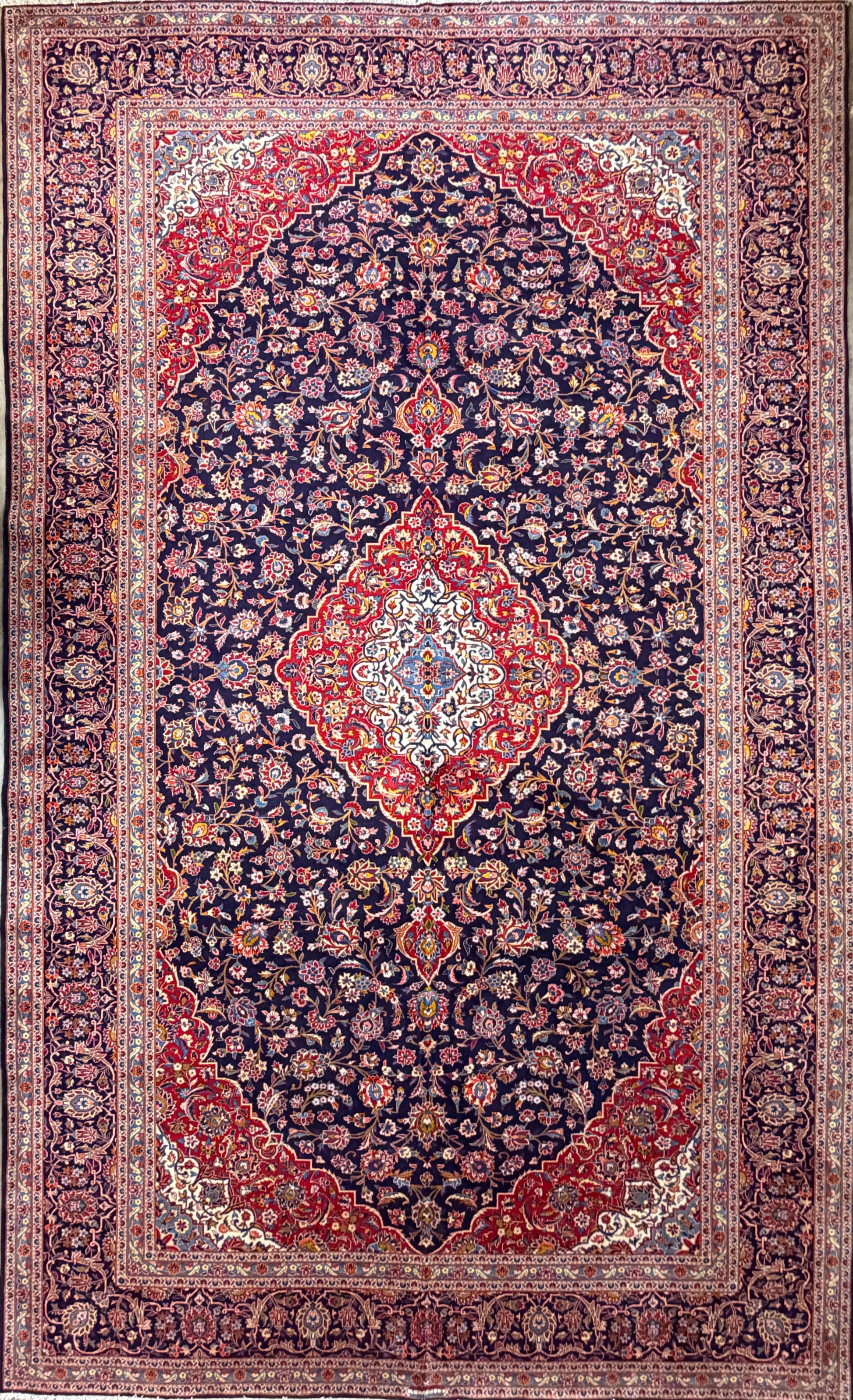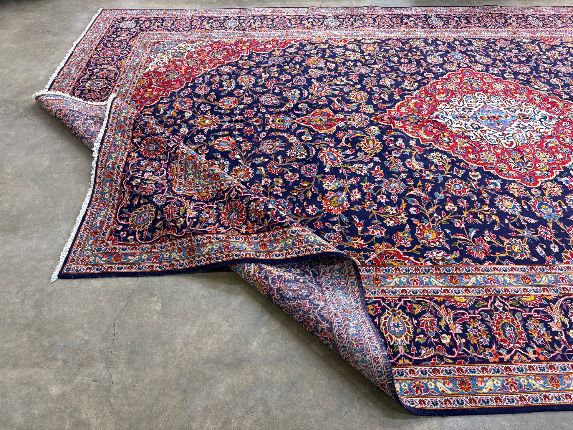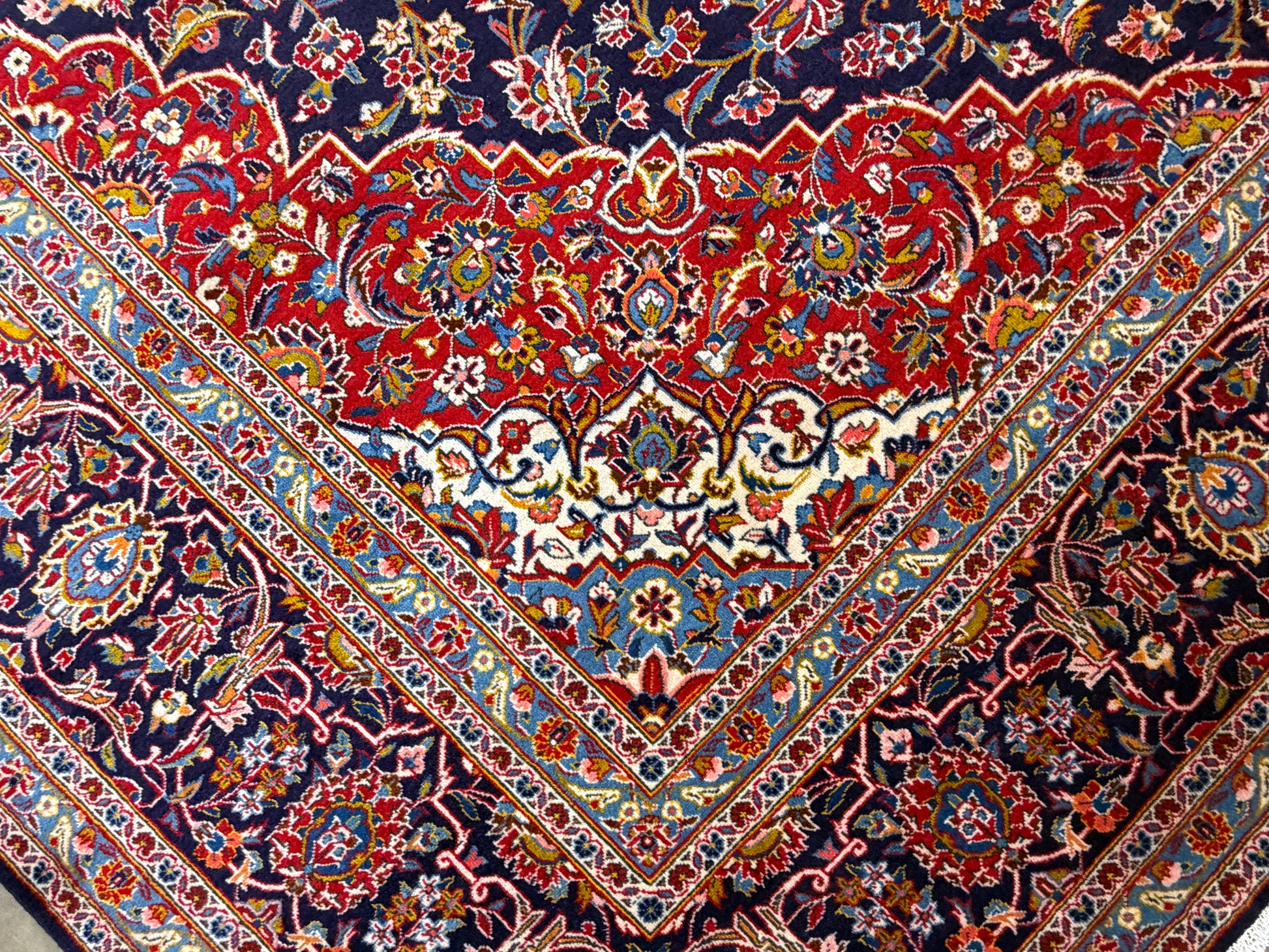 This 10’3” x 16’8” hand-knotted Persian Kashan area rug is a remarkable example of traditional craftsmanship, showcasing a finely detailed central medallion set against a rich navy field. The intricate floral motifs, rendered in shades of red, ivory, and gold, reflect the signature elegance of Kashan weaving, while the surrounding borders feature complex arabesque patterns that frame the design with symmetry and depth. Woven entirely from soft, durable wool, this rug not only offers luxurious texture but also ensures long-lasting beauty for high-traffic or formal spaces.