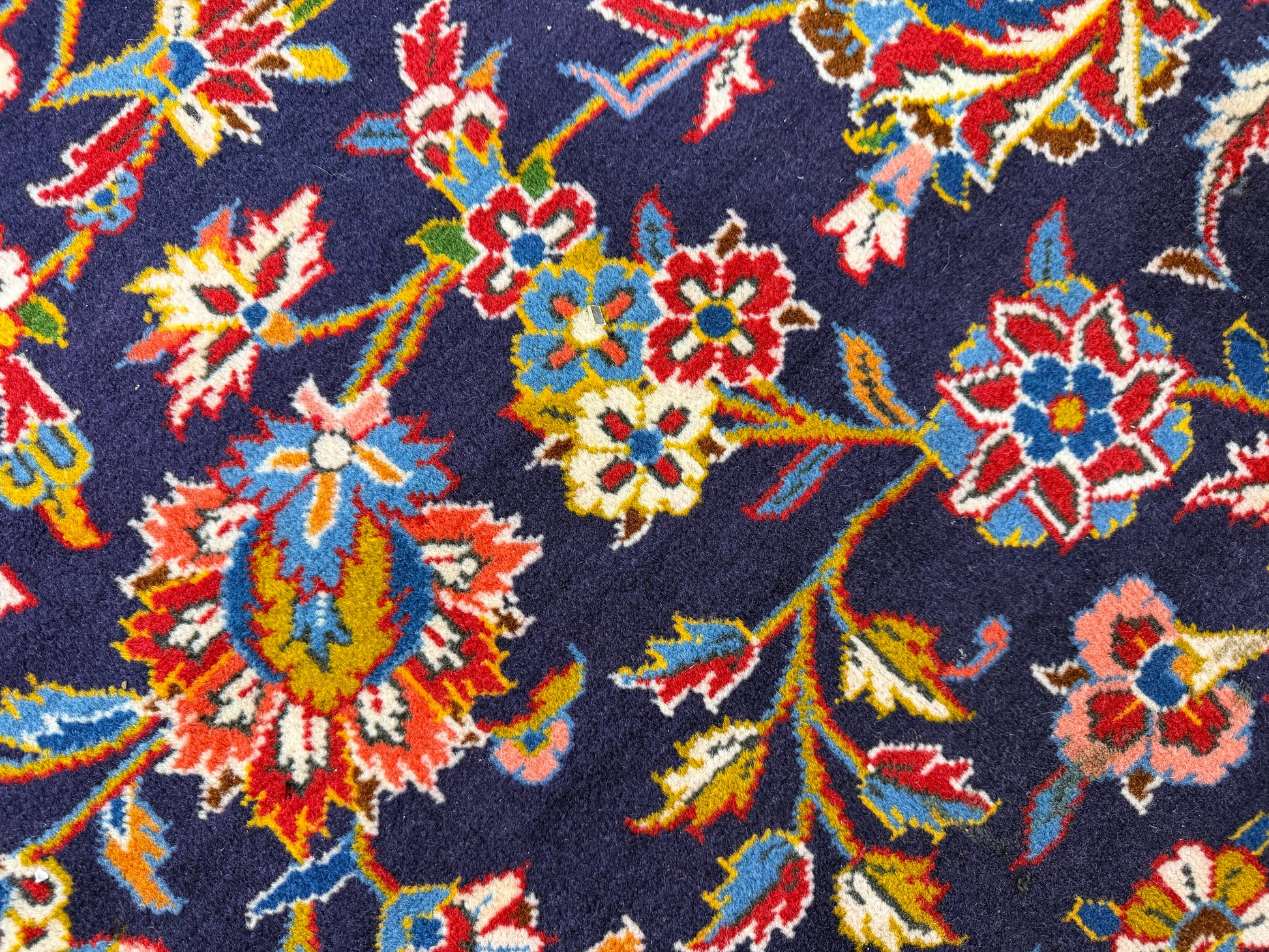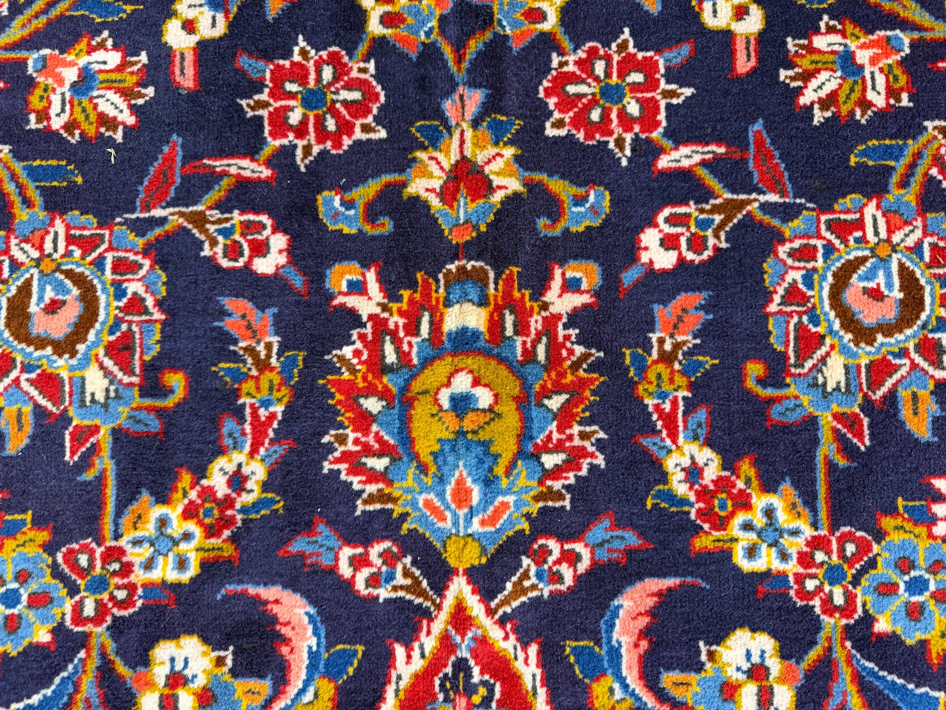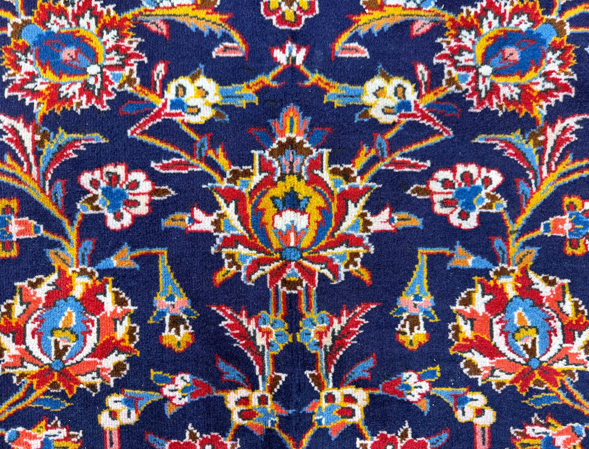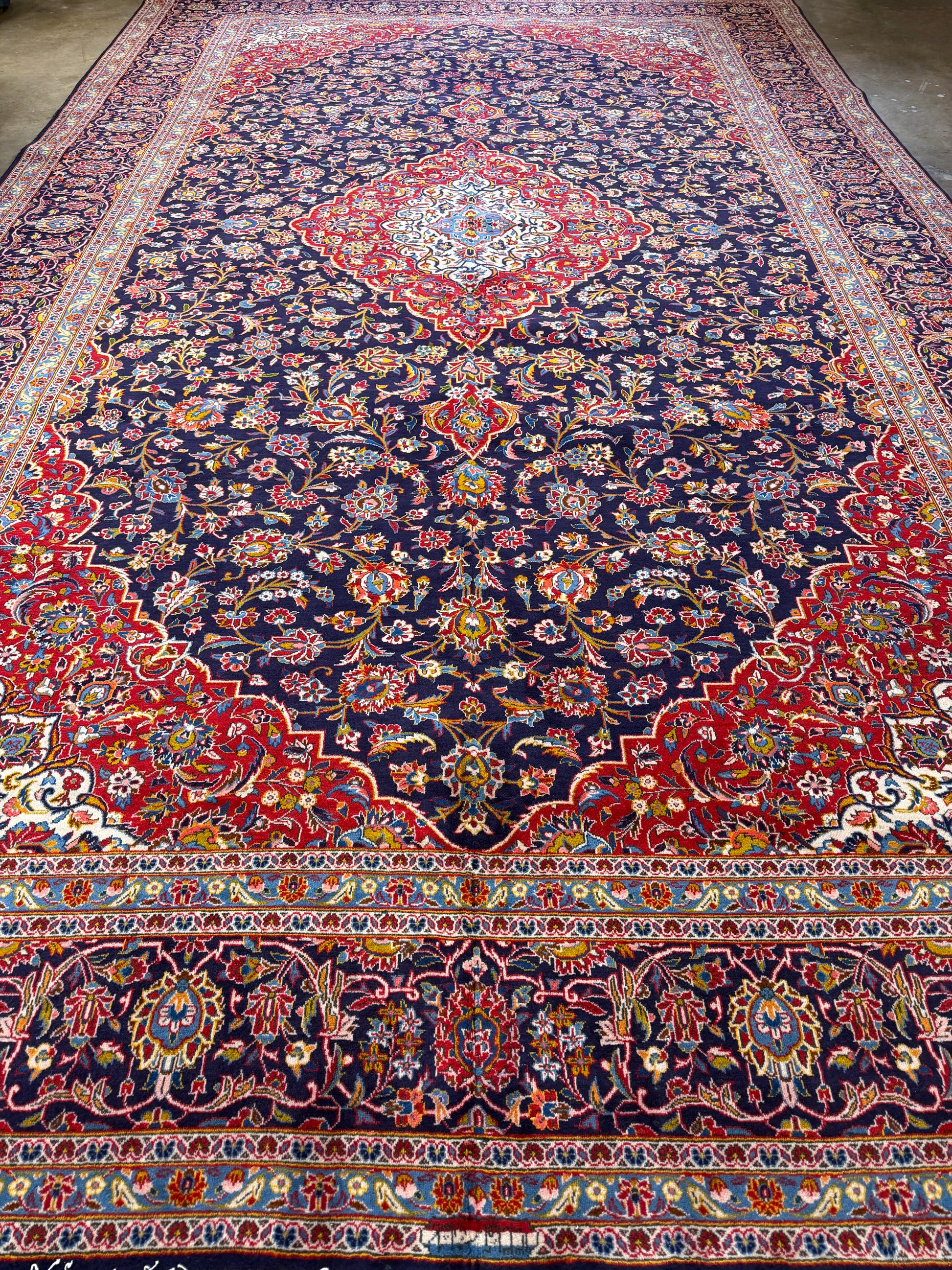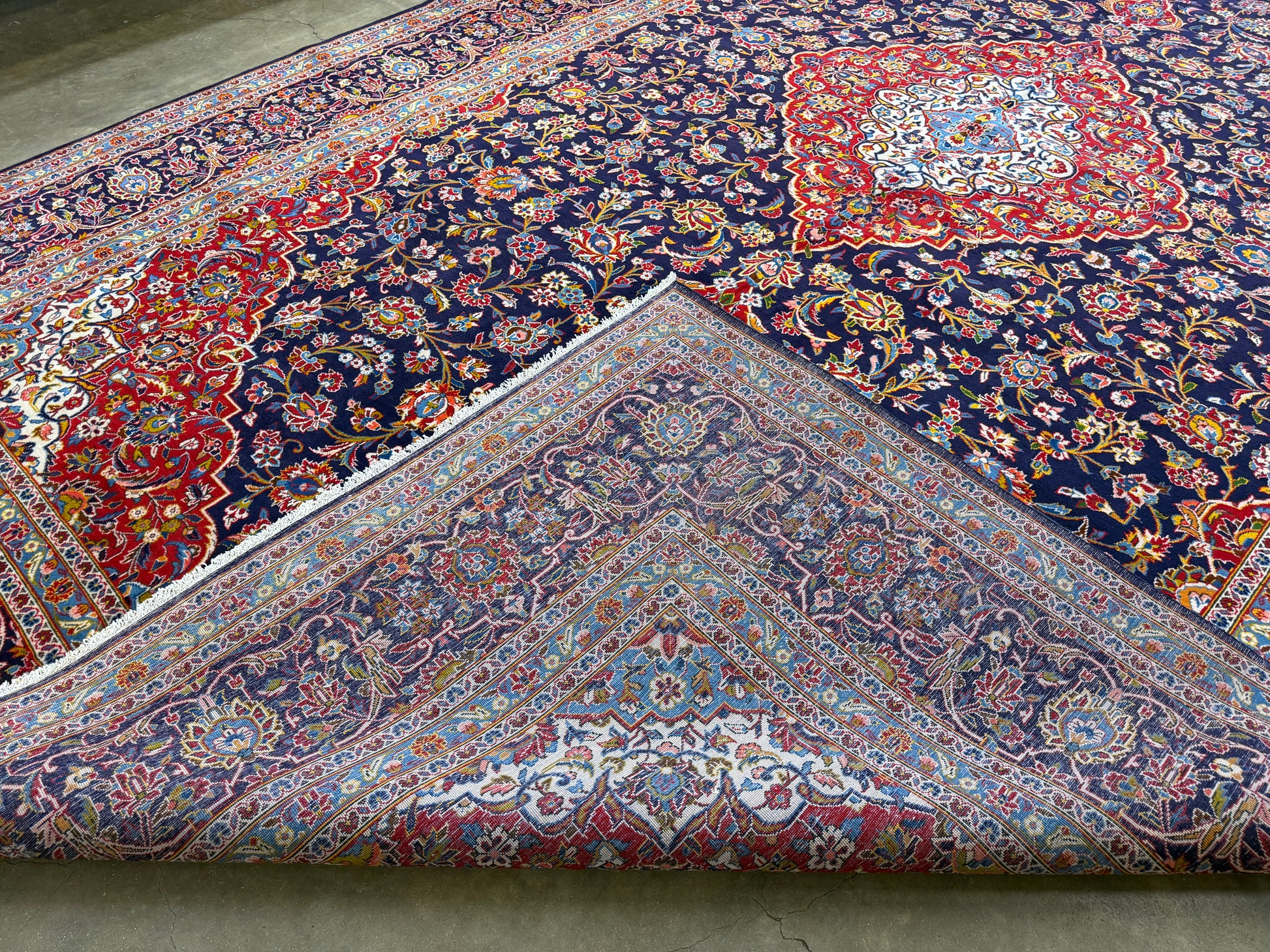 This 10’3” x 16’8” hand-knotted Persian Kashan area rug is a remarkable example of traditional craftsmanship, showcasing a finely detailed central medallion set against a rich navy field. The intricate floral motifs, rendered in shades of red, ivory, and gold, reflect the signature elegance of Kashan weaving, while the surrounding borders feature complex arabesque patterns that frame the design with symmetry and depth. Woven entirely from soft, durable wool, this rug not only offers luxurious texture but also ensures long-lasting beauty for high-traffic or formal spaces.
