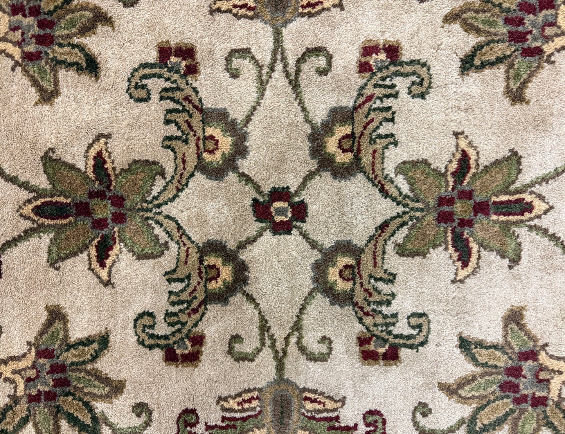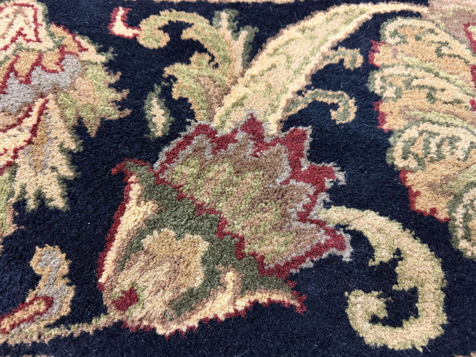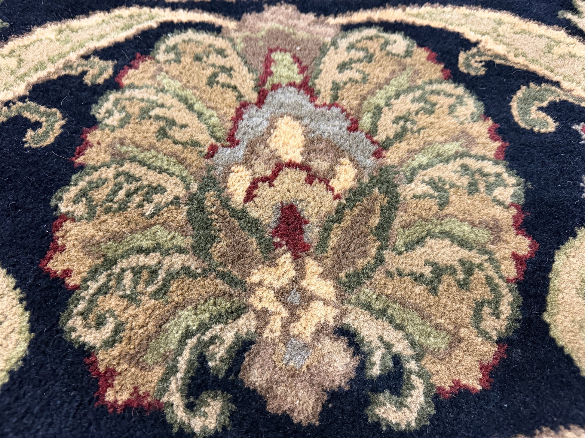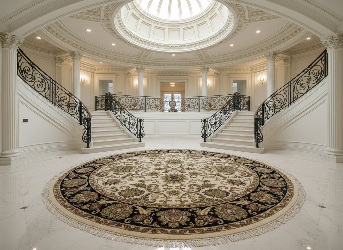 Introduce luxury and sophistication into your space with our exquisite 10’2” Diameter Hand-Knotted Wool Indian Round Oriental Rug. Handmade with care and crafted with the finest wool, this 10x10 carpet features an ivory center with an intricate floral medallion pattern in muted greens, golds, and burgundy. Its wide black border is decorated with ornate botanical motifs, framed by a thin beige edge and finished with short fringe, giving it a traditional Persian-inspired look ideal for classic interiors. Elevate your décor with this one-of-a-kind masterpiece.