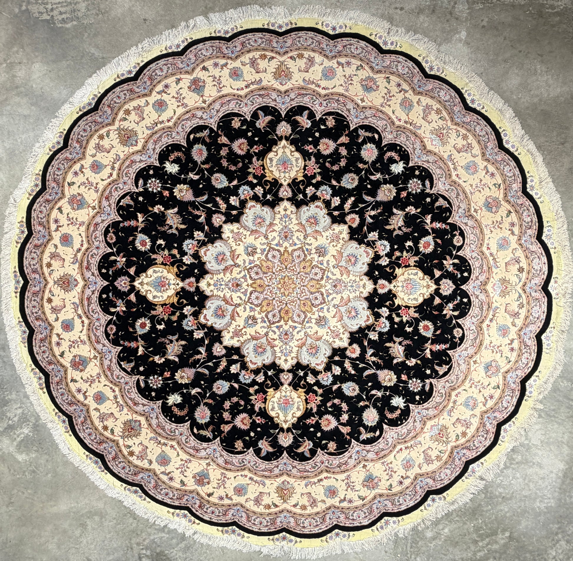 This 10-foot diameter Very Fine Hand-Knotted Wool & Silk Round Tabriz Persian Rug exemplifies the pinnacle of traditional Persian craftsmanship. Meticulously woven by skilled artisans, the rug features a harmonious blend of wool and silk fibers, producing a lustrous sheen and luxurious texture. The circular design is anchored by an elaborate central medallion, radiating outward with intricate arabesque and floral motifs that capture the elegance and heritage of classic Tabriz artistry.