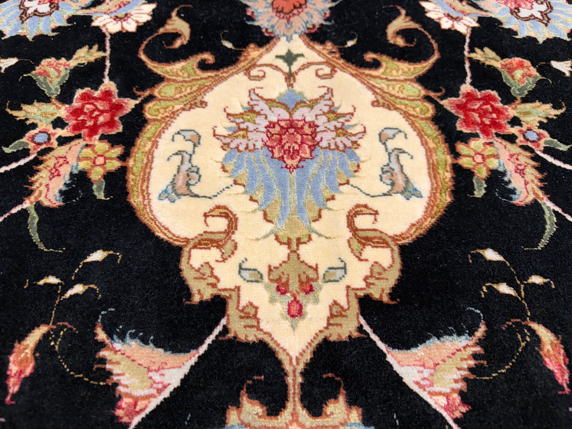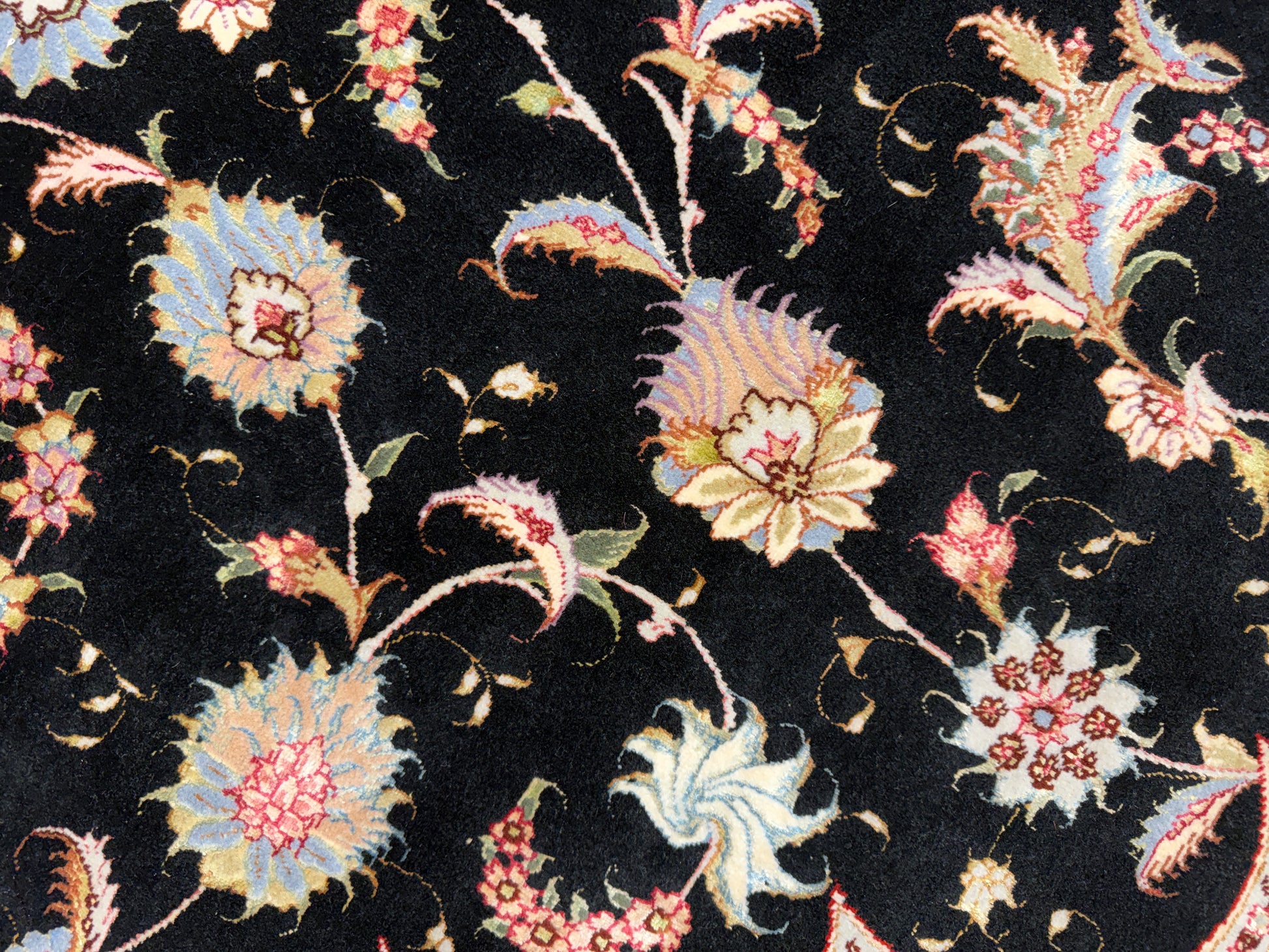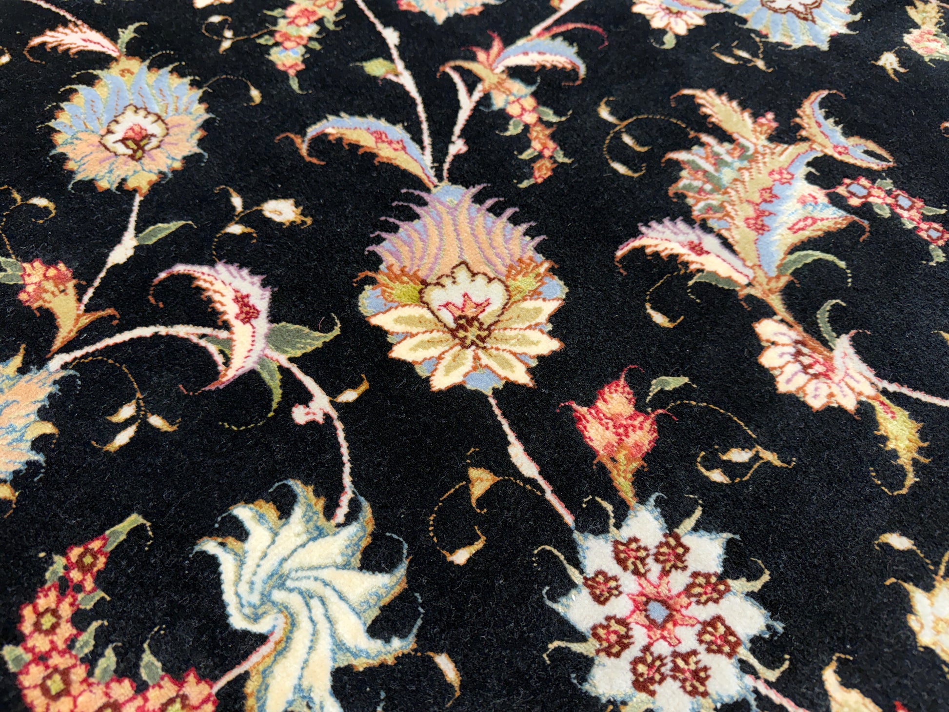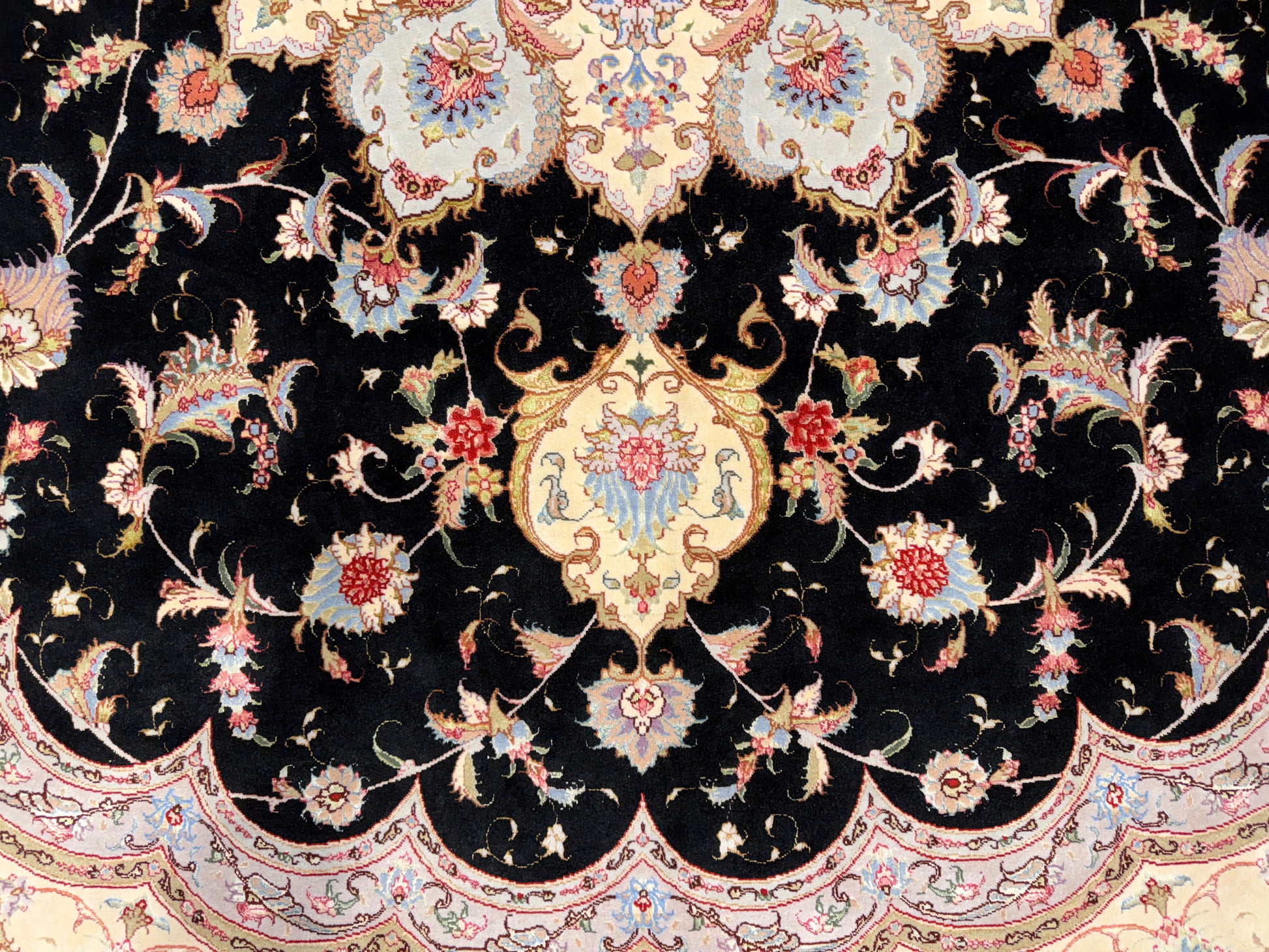 The rich black field provides a dramatic backdrop for the delicately rendered patterns in soft ivory, gold, rose, and muted lavender tones. Each element of the design is precisely hand-knotted, forming a balanced composition that draws the eye toward the center while maintaining an exquisite symmetry across the entire 10x10 surface. The interplay of silk highlights enhances the rug’s visual depth, changing subtly with the light to create a dynamic, almost luminous effect.