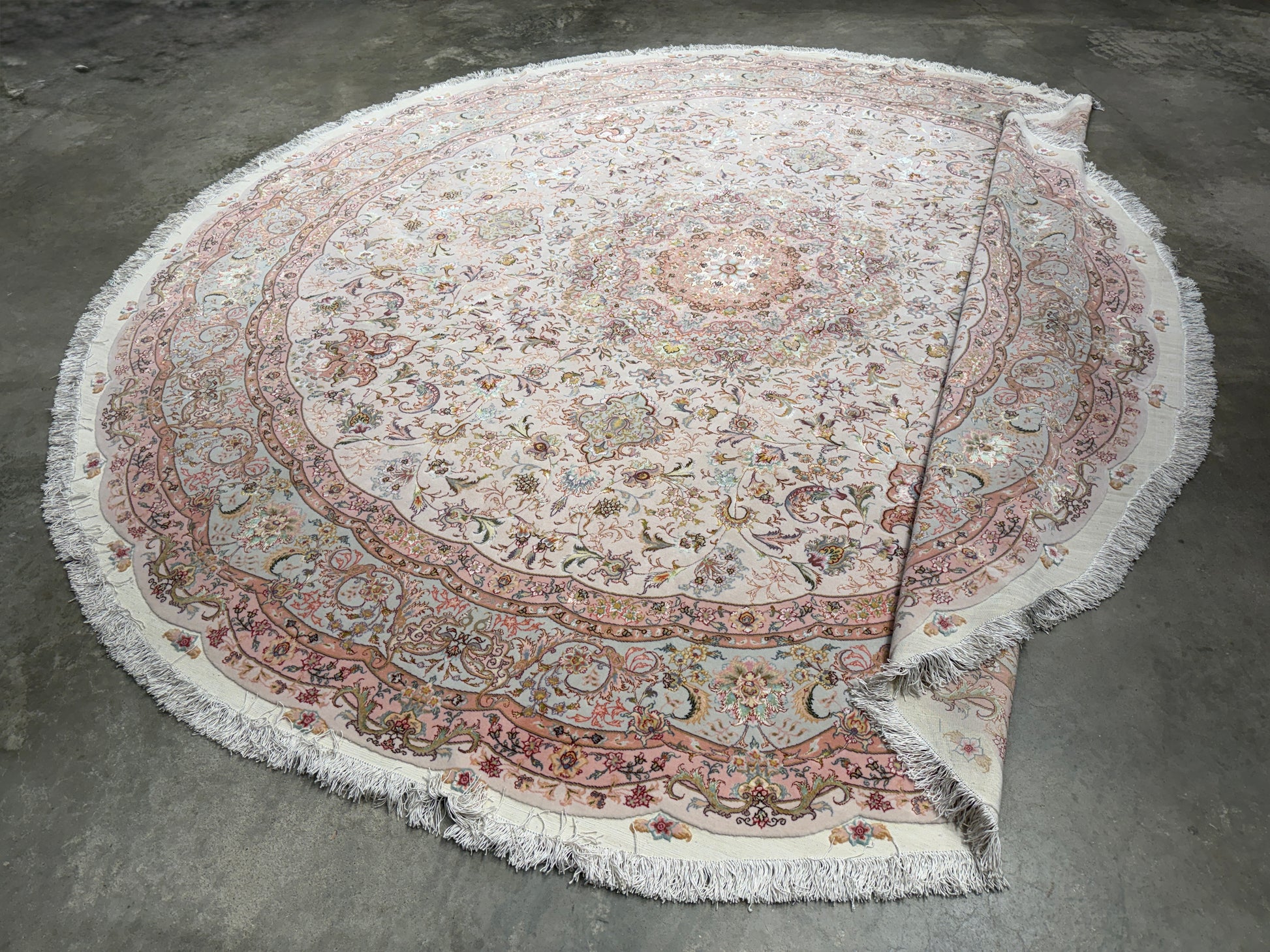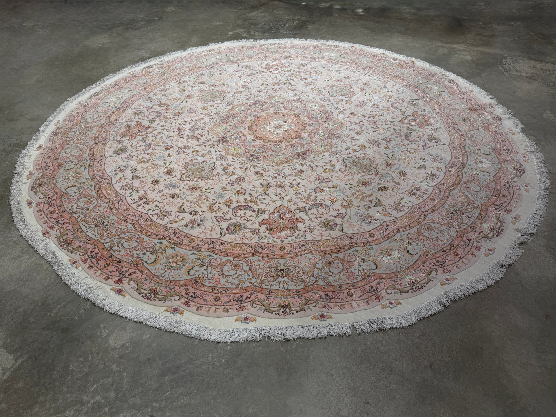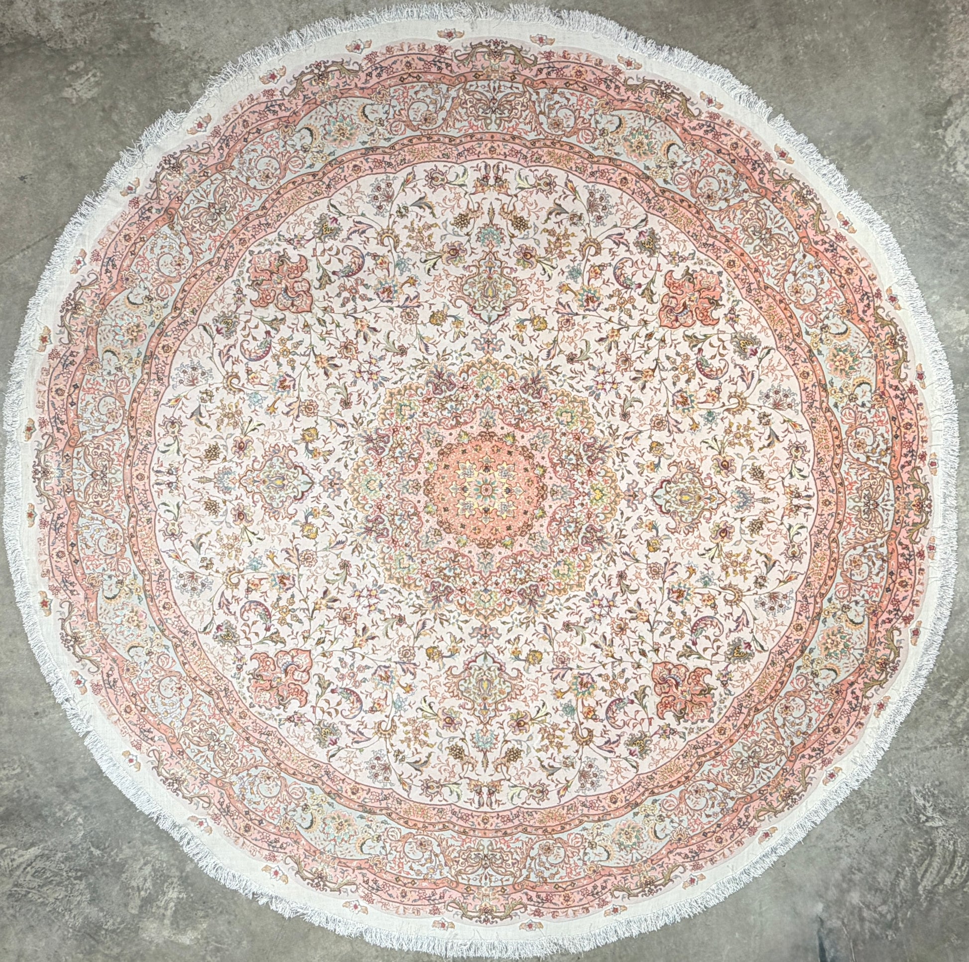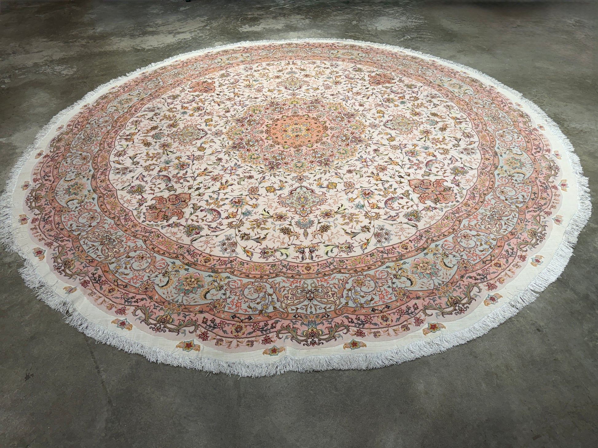 This 10-foot diameter Very Fine Hand-Knotted Wool & Silk Round Tabriz Persian Rug embodies the elegance and mastery of traditional Persian craftsmanship. Expertly woven with a harmonious blend of premium wool and lustrous silk, the rug radiates a gentle sheen that enhances the intricacy of its design. The central medallion blooms with exquisite floral motifs, gracefully extending outward into a symphony of vines, arabesques, and delicate blossoms arranged in perfect symmetry, reflecting the timeless artistry of Tabriz weaving.