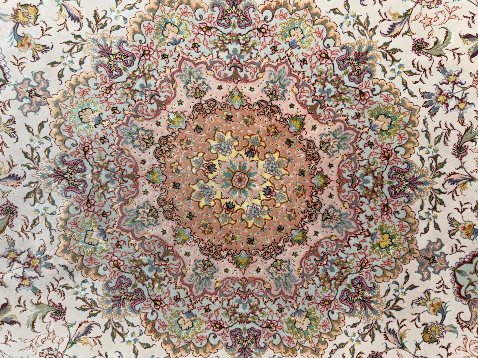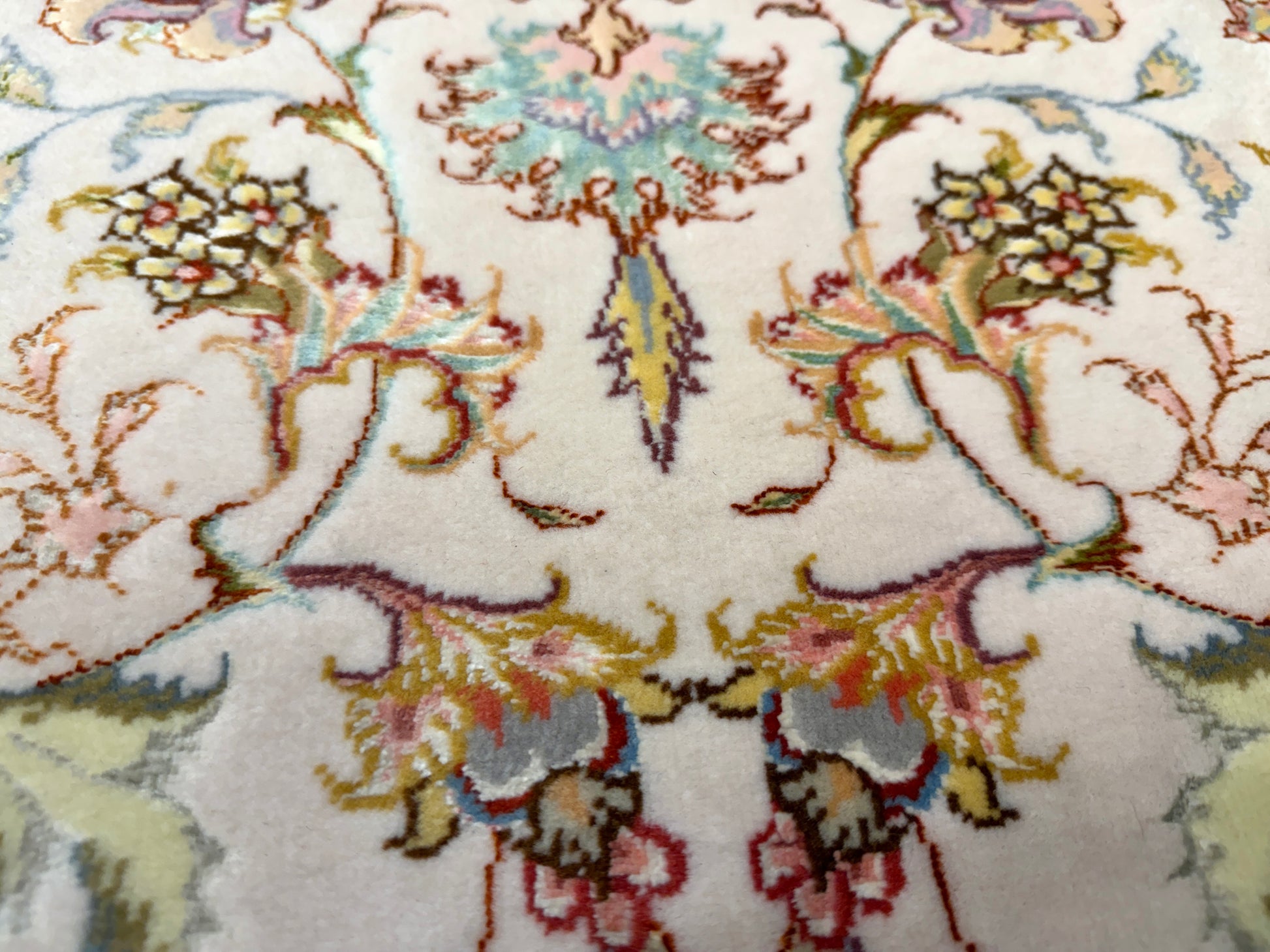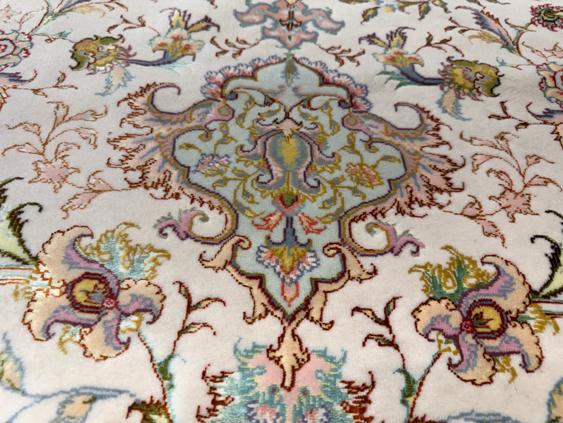 This 10-foot diameter Very Fine Hand-Knotted Wool & Silk Round Tabriz Persian Rug embodies the elegance and mastery of traditional Persian craftsmanship. Expertly woven with a harmonious blend of premium wool and lustrous silk, the rug radiates a gentle sheen that enhances the intricacy of its design. The central medallion blooms with exquisite floral motifs, gracefully extending outward into a symphony of vines, arabesques, and delicate blossoms arranged in perfect symmetry, reflecting the timeless artistry of Tabriz weaving.
