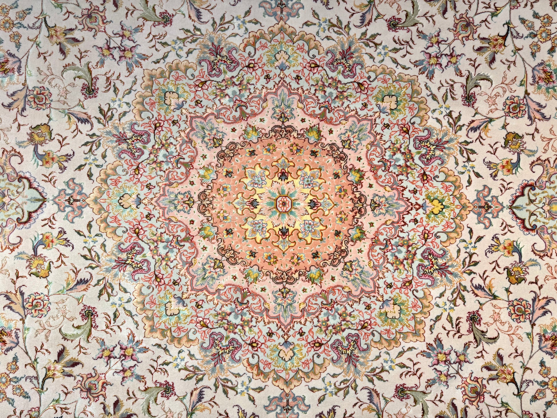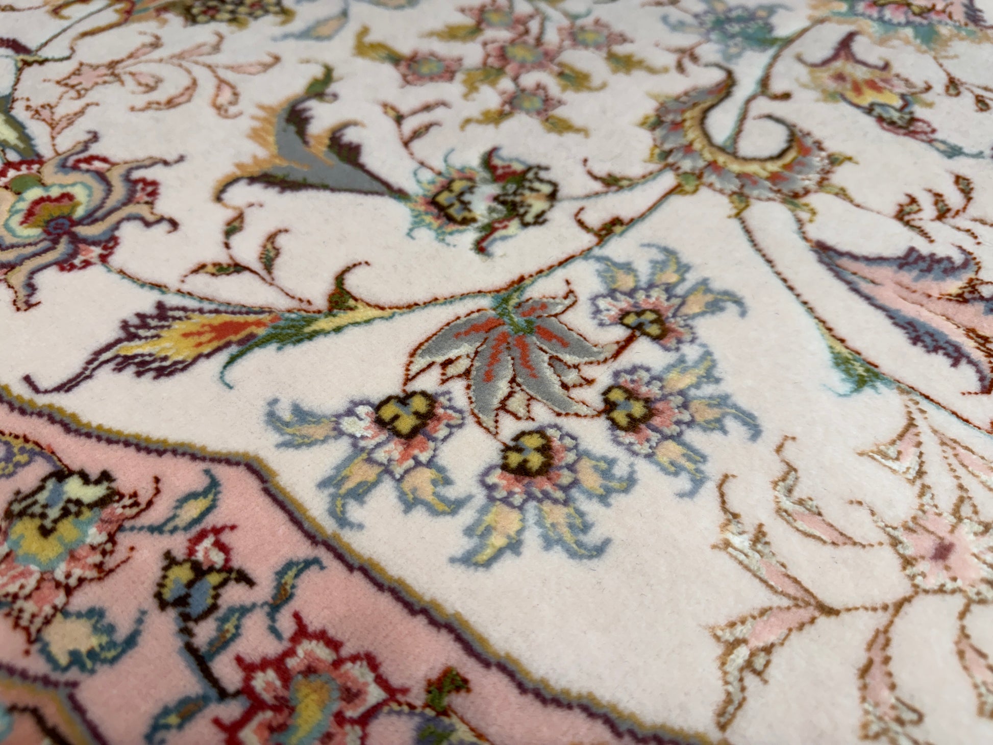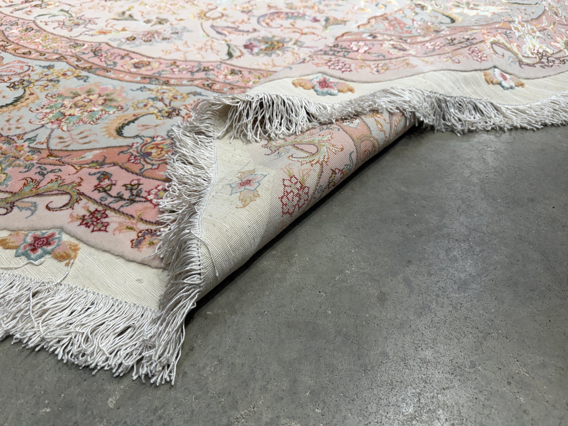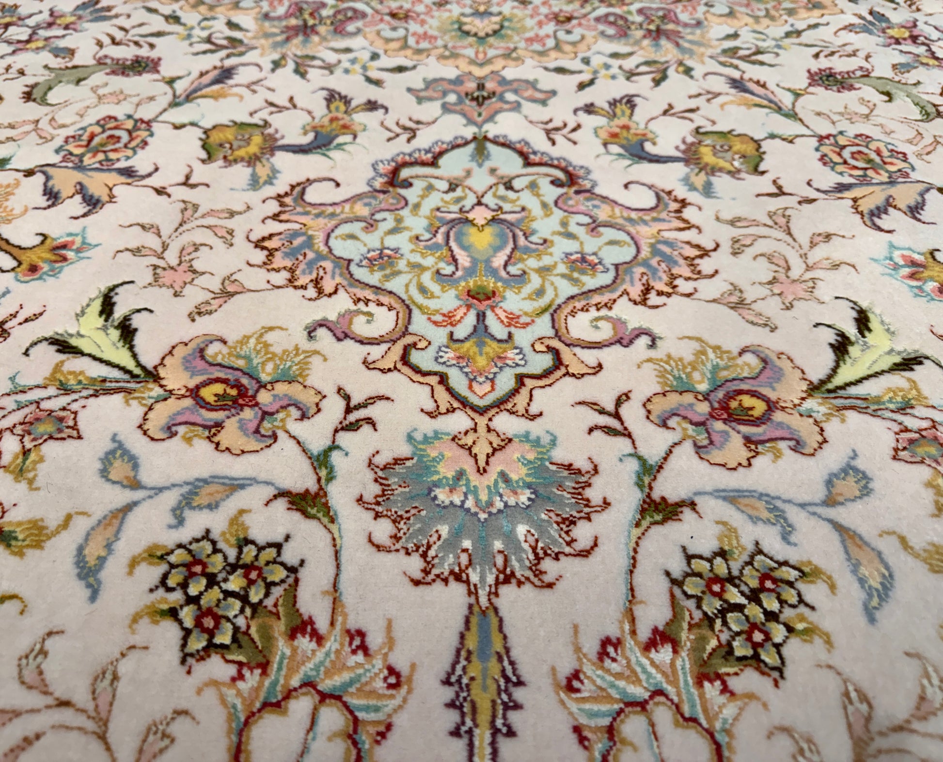 This 10-foot diameter Very Fine Hand-Knotted Wool & Silk Round Tabriz Persian Rug embodies the elegance and mastery of traditional Persian craftsmanship. Expertly woven with a harmonious blend of premium wool and lustrous silk, the rug radiates a gentle sheen that enhances the intricacy of its design. The central medallion blooms with exquisite floral motifs, gracefully extending outward into a symphony of vines, arabesques, and delicate blossoms arranged in perfect symmetry, reflecting the timeless artistry of Tabriz weaving.
