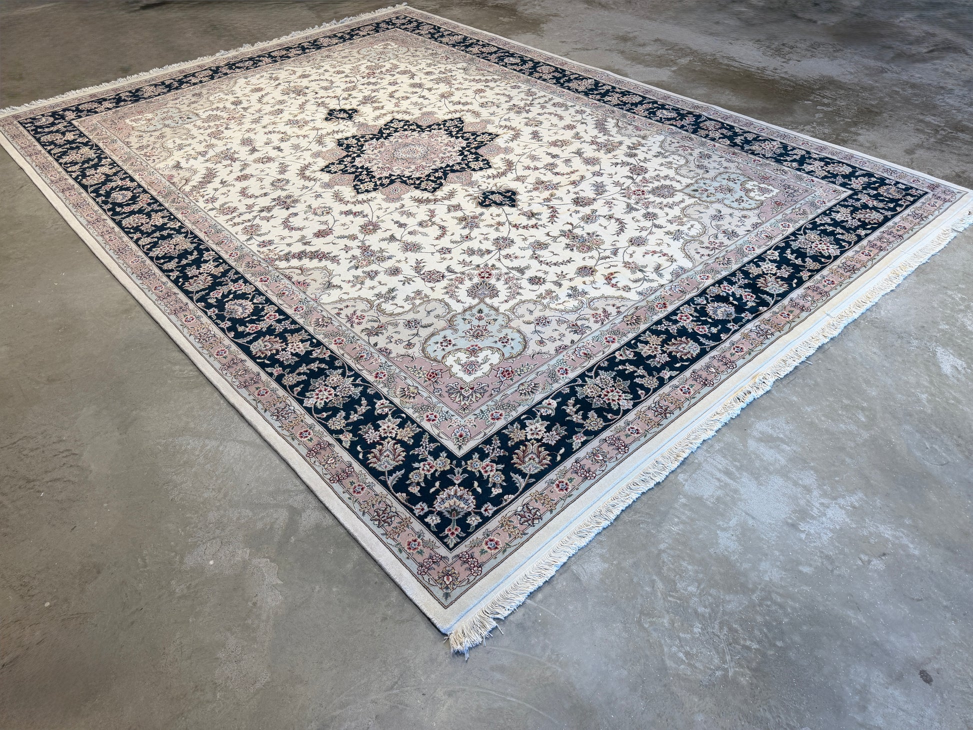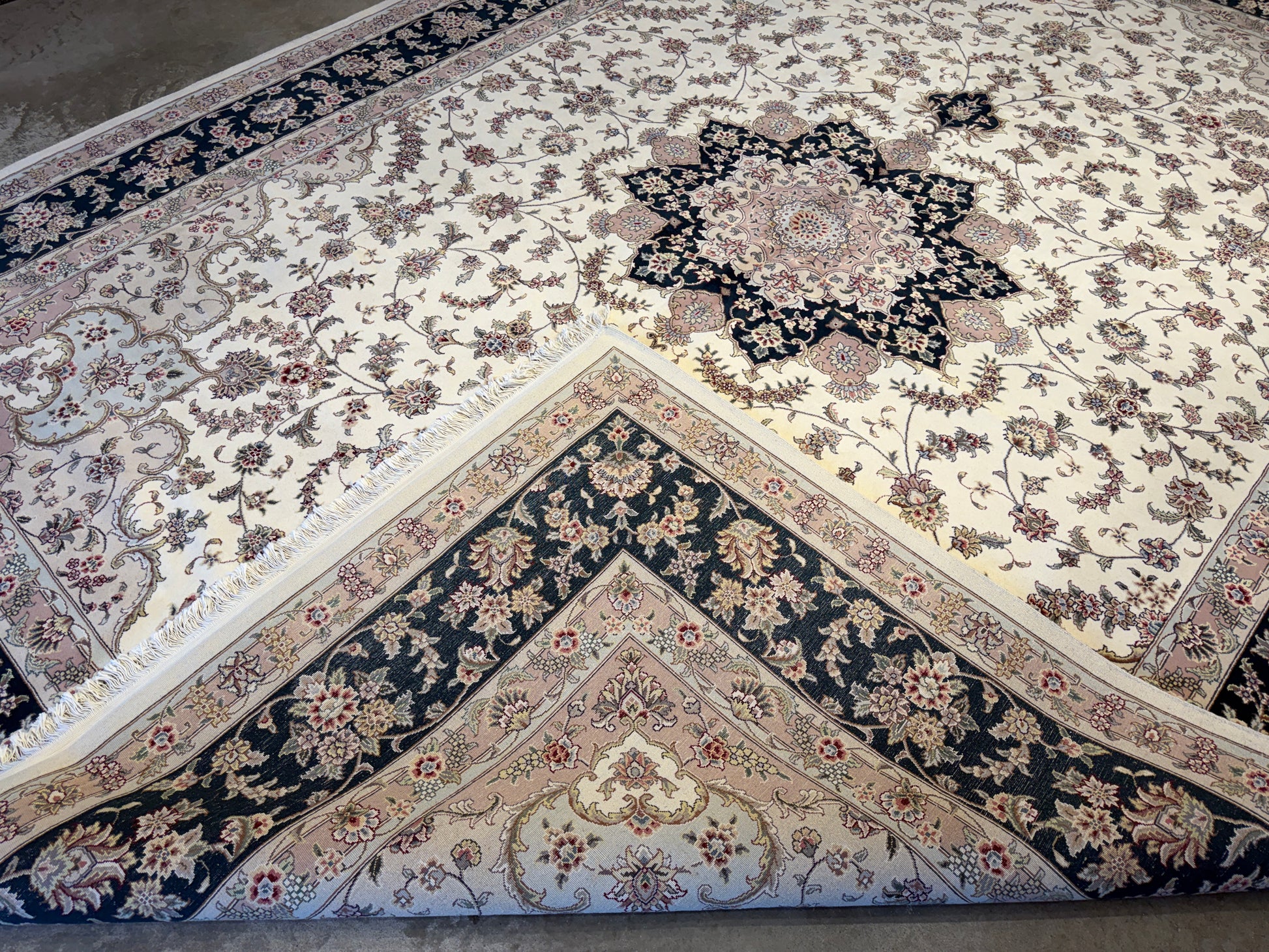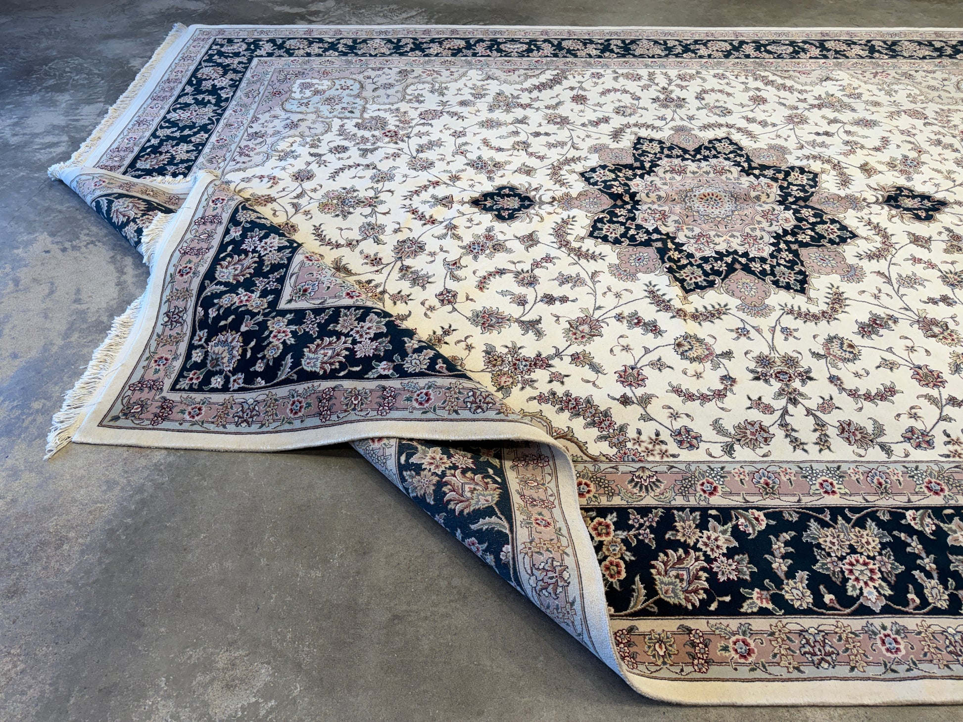 This 10’ x 13’8” hand-knotted Oriental IndoKashan area rug showcases a classic Persian-inspired design, with a rich floral pattern radiating from a striking central medallion. The ivory field provides a soft backdrop for delicate vines and blossoms, while the deep black border frames the composition with an elegant contrast. Accents of rose, soft blue, and beige add depth and subtle warmth to the overall palette.
