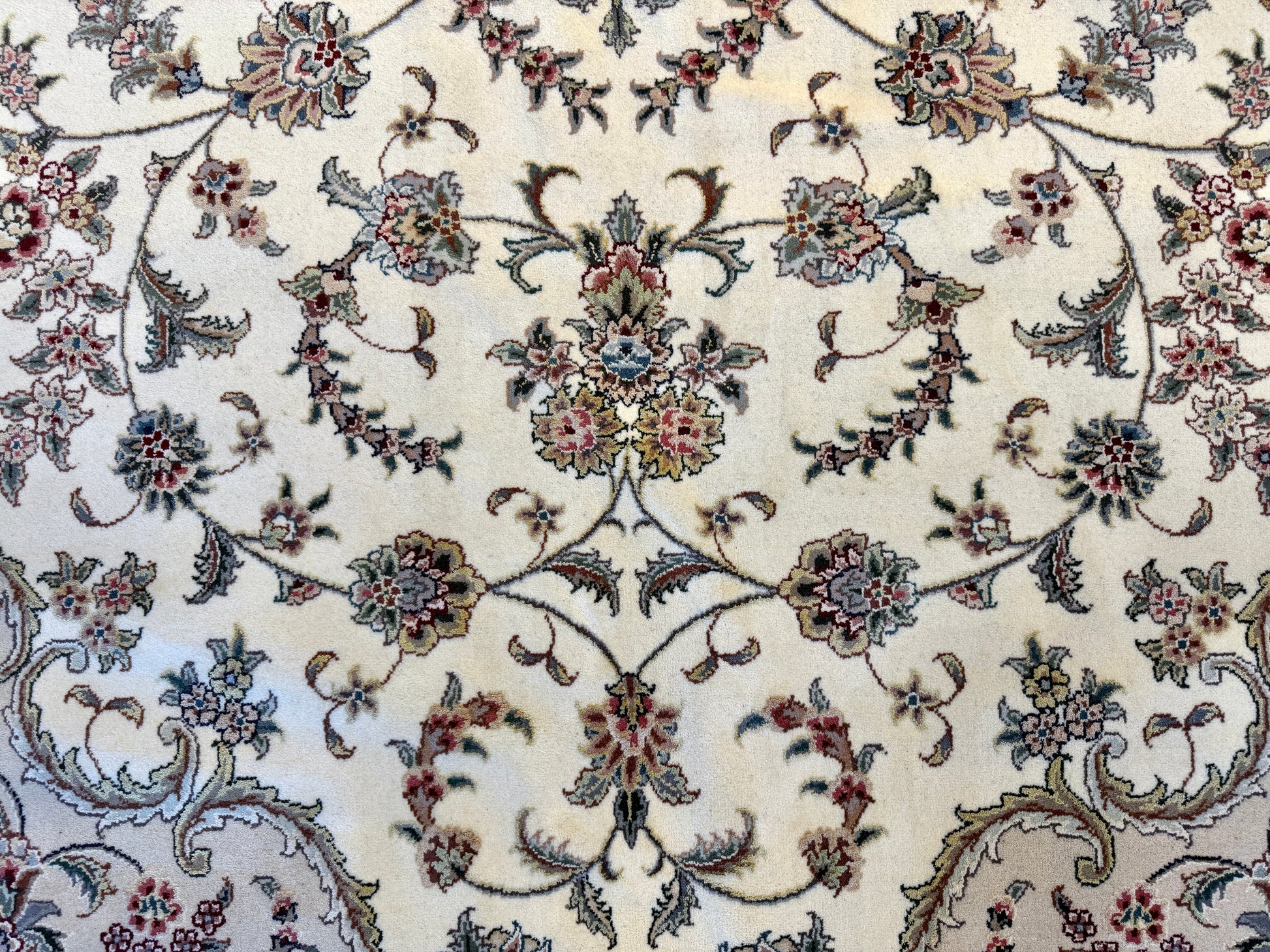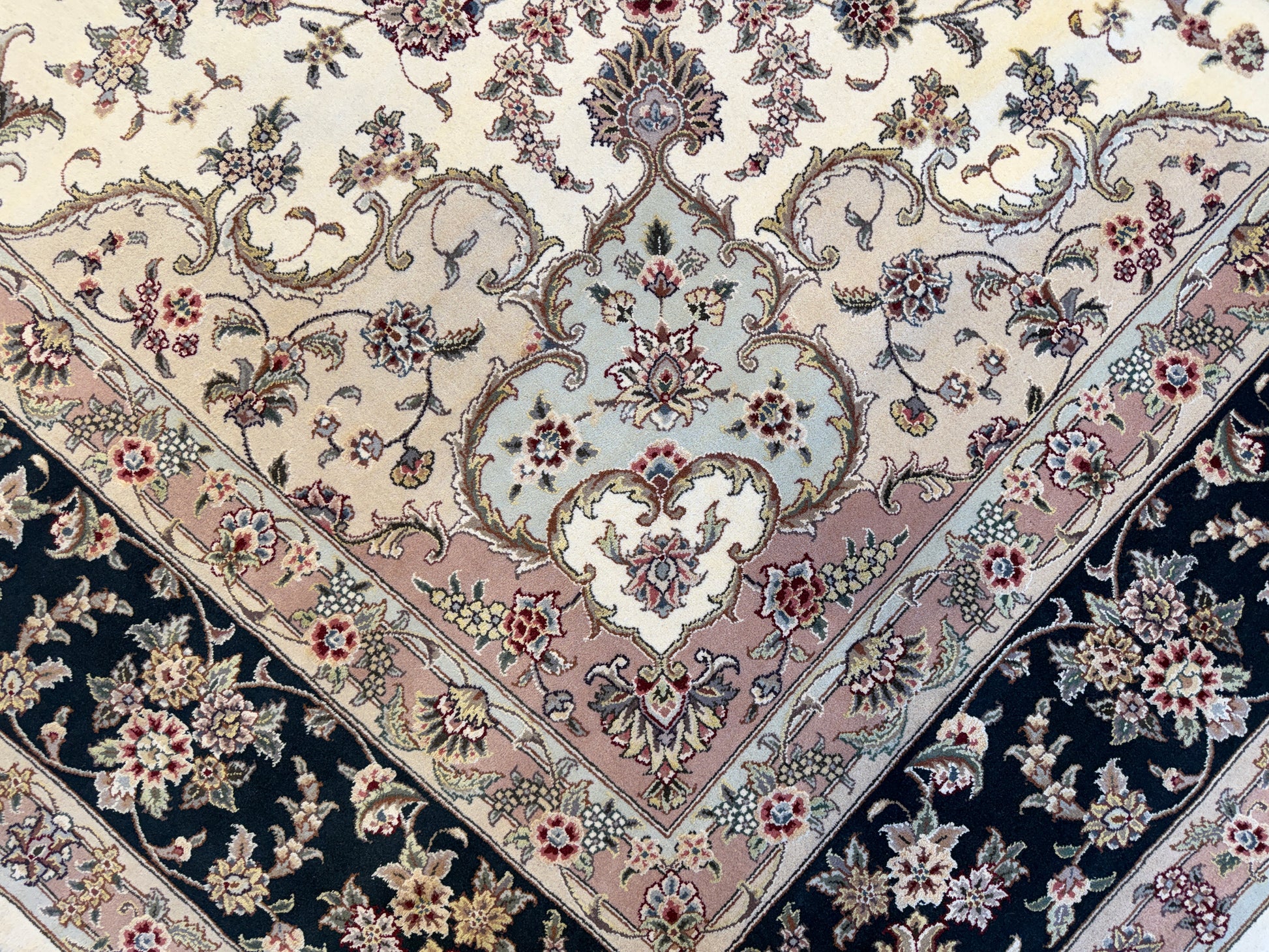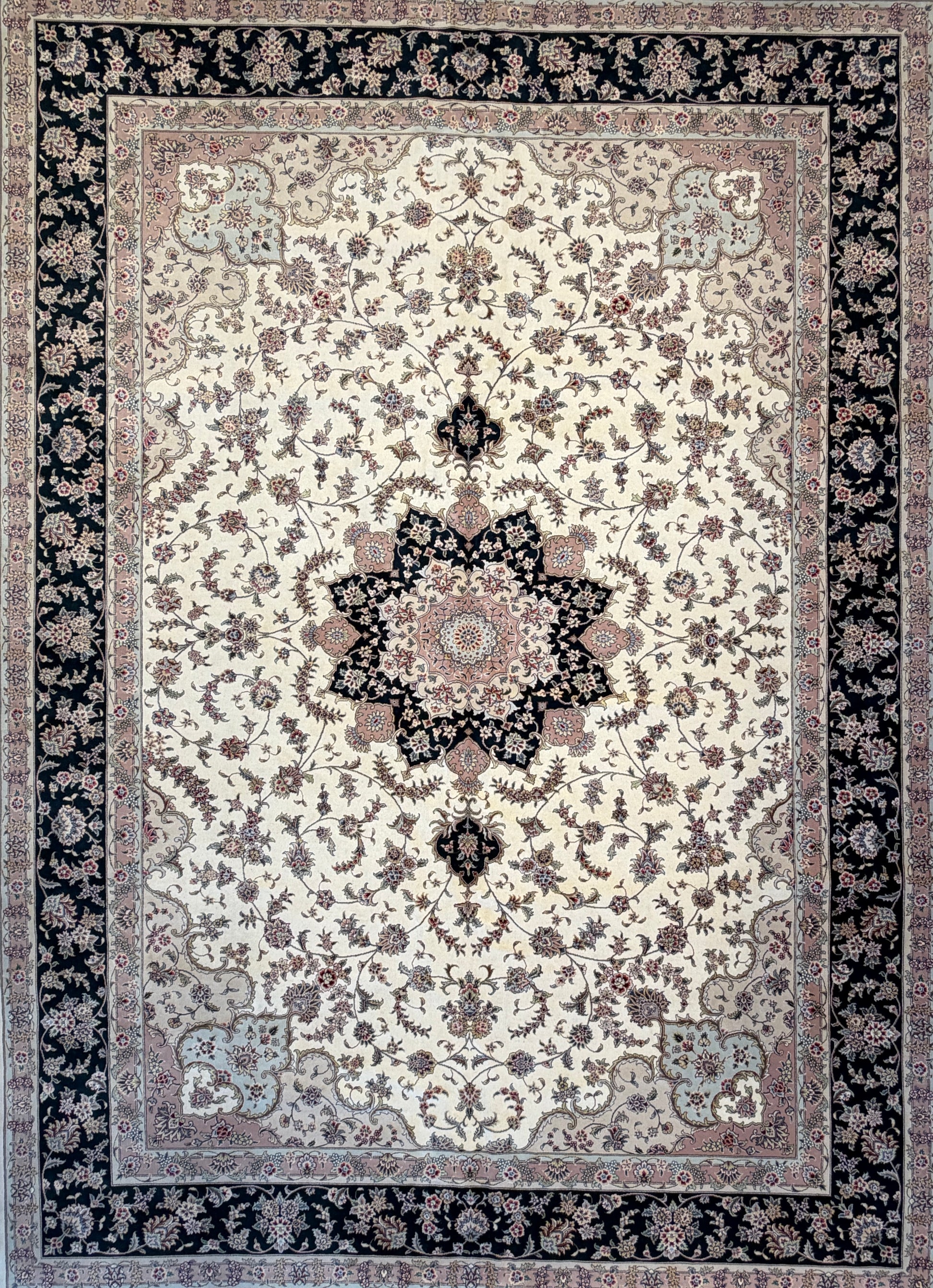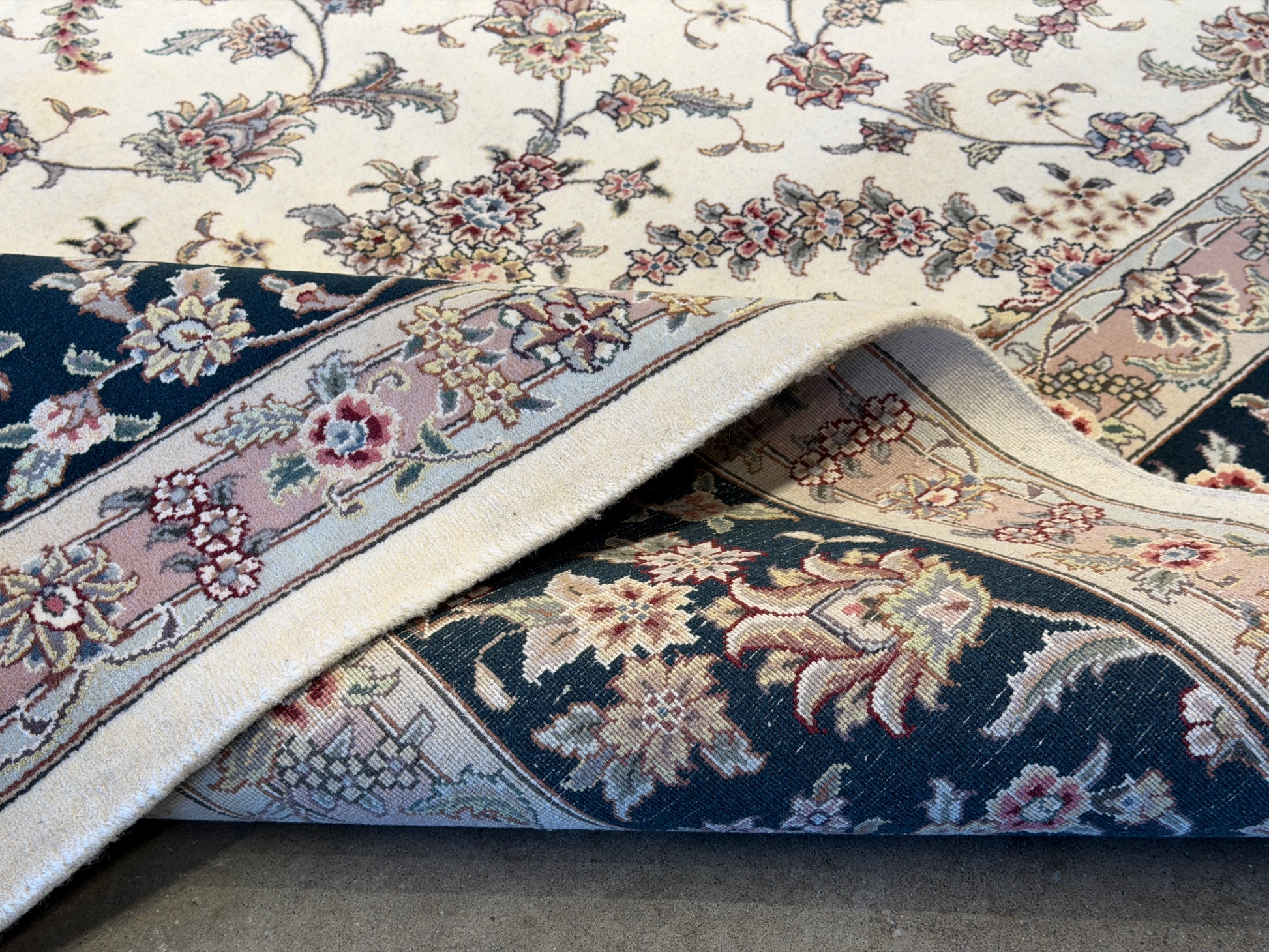 This 10’ x 13’8” hand-knotted Oriental IndoKashan area rug showcases a classic Persian-inspired design, with a rich floral pattern radiating from a striking central medallion. The ivory field provides a soft backdrop for delicate vines and blossoms, while the deep black border frames the composition with an elegant contrast. Accents of rose, soft blue, and beige add depth and subtle warmth to the overall palette.