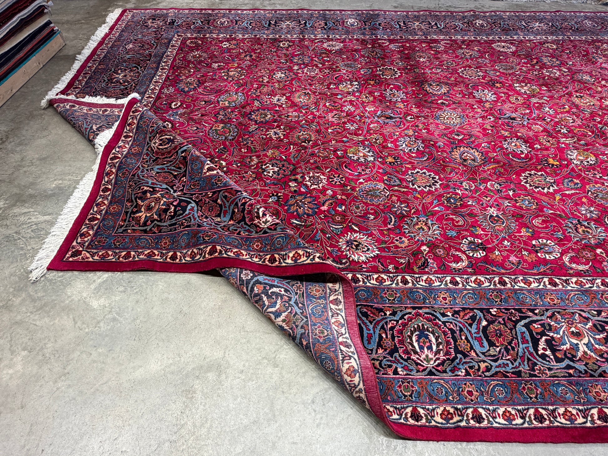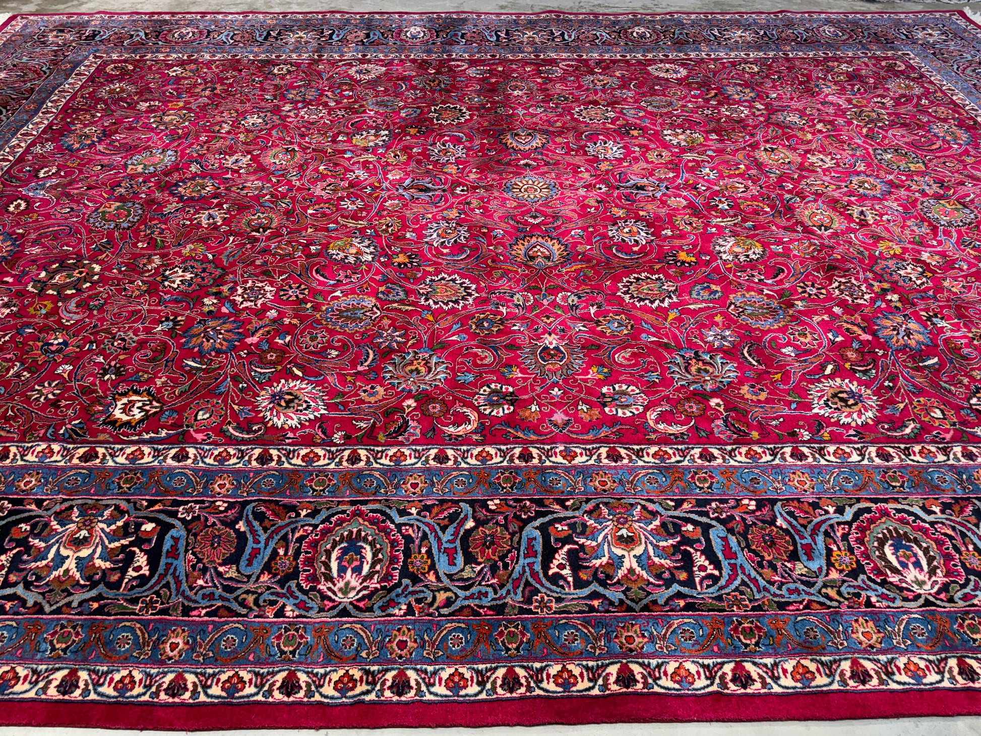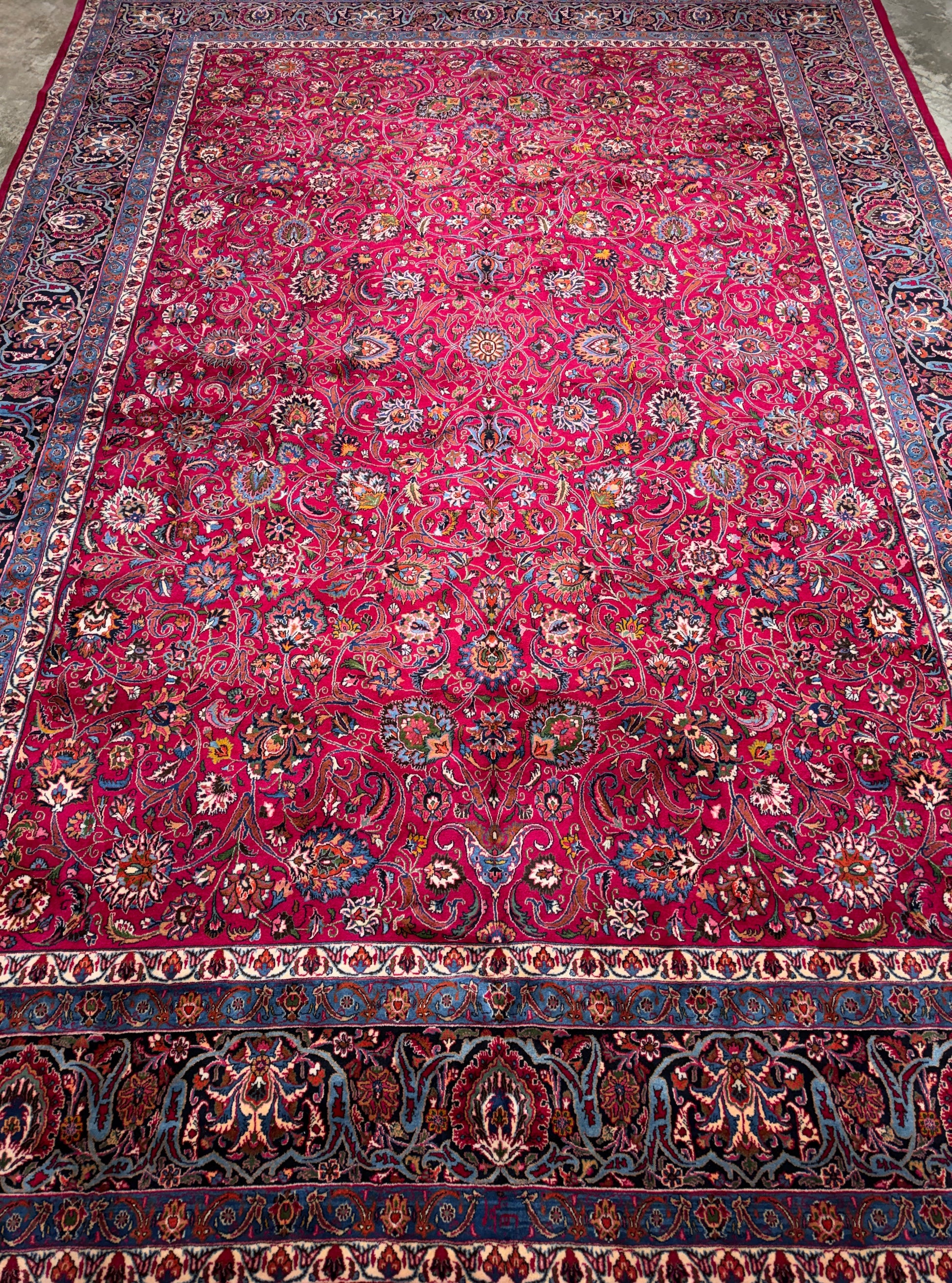 This 11’6” x 16’5” hand-knotted Persian Mashad rug showcases the refined craftsmanship and artistry that the city of Mashad is renowned for. Woven from very fine wool, the rug features a vibrant red field densely adorned with intricate floral motifs, gracefully intertwined vines, and an elegant central medallion. Its multi-tiered borders in shades of deep blue and ivory provide a striking frame, emphasizing the balance and symmetry of the traditional Persian design. Signed by the master weaver, this piece reflects both aesthetic beauty and cultural heritage.