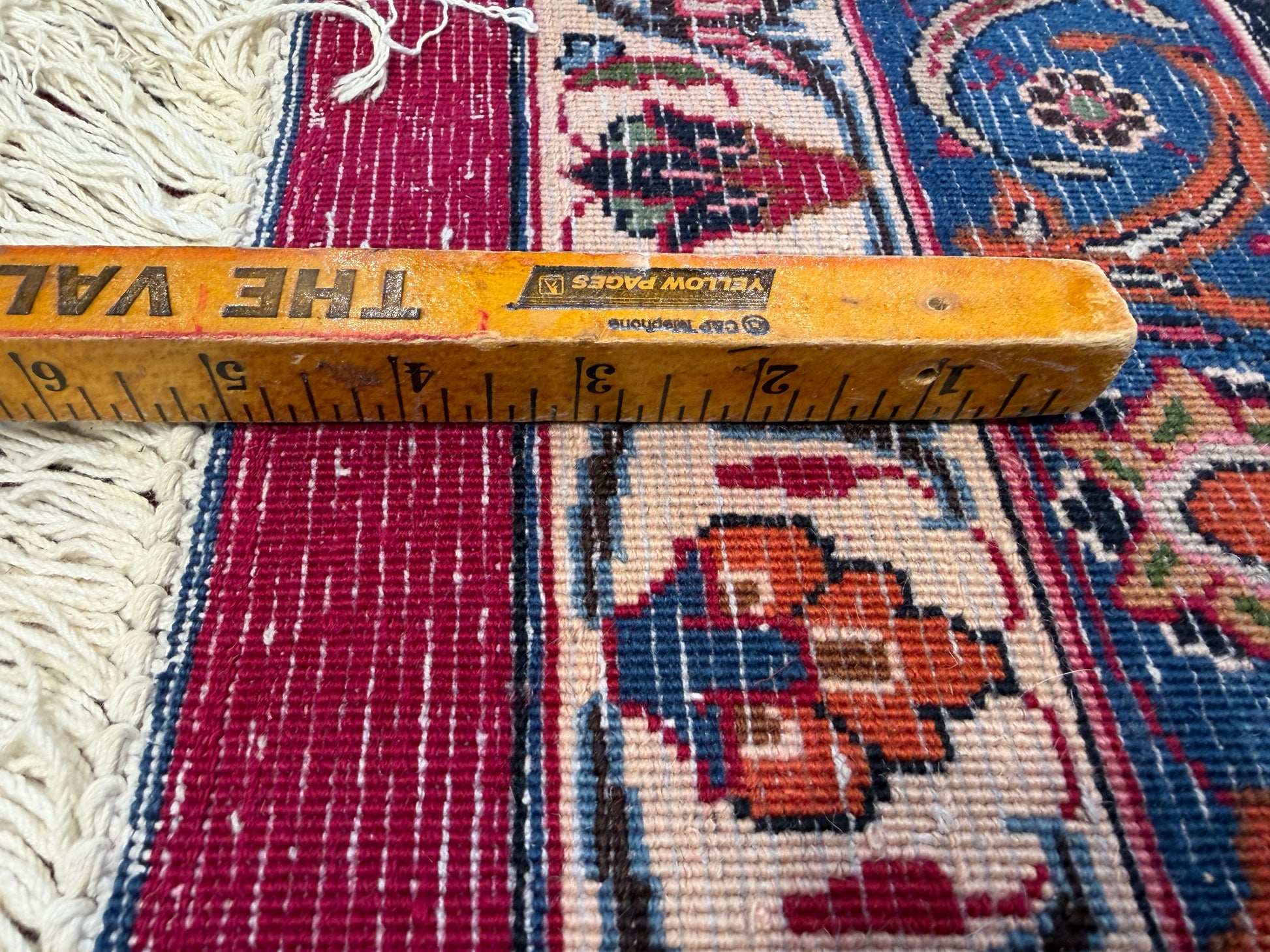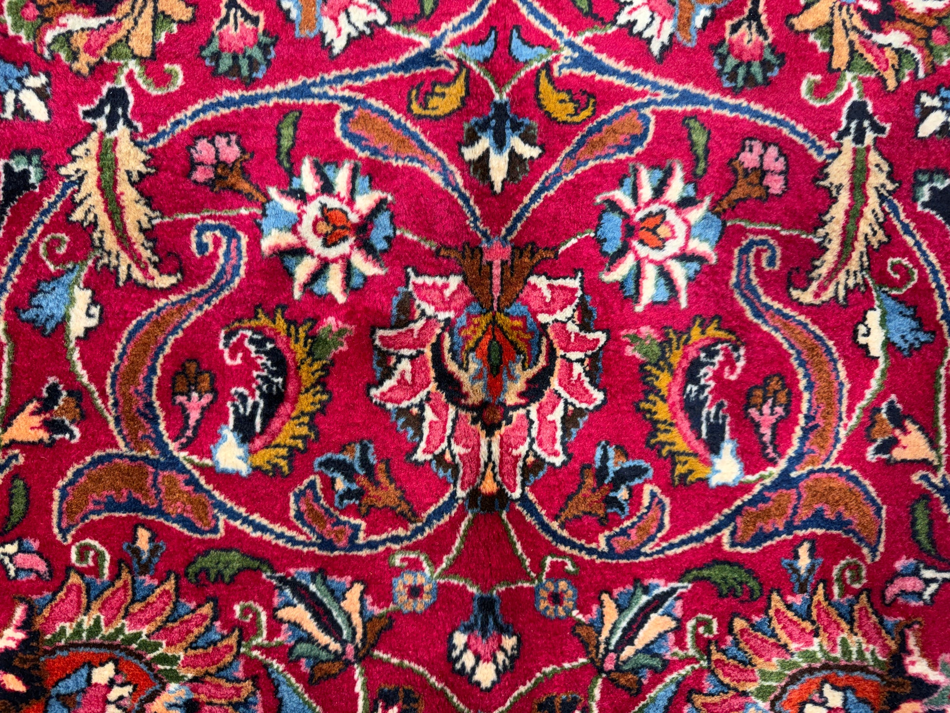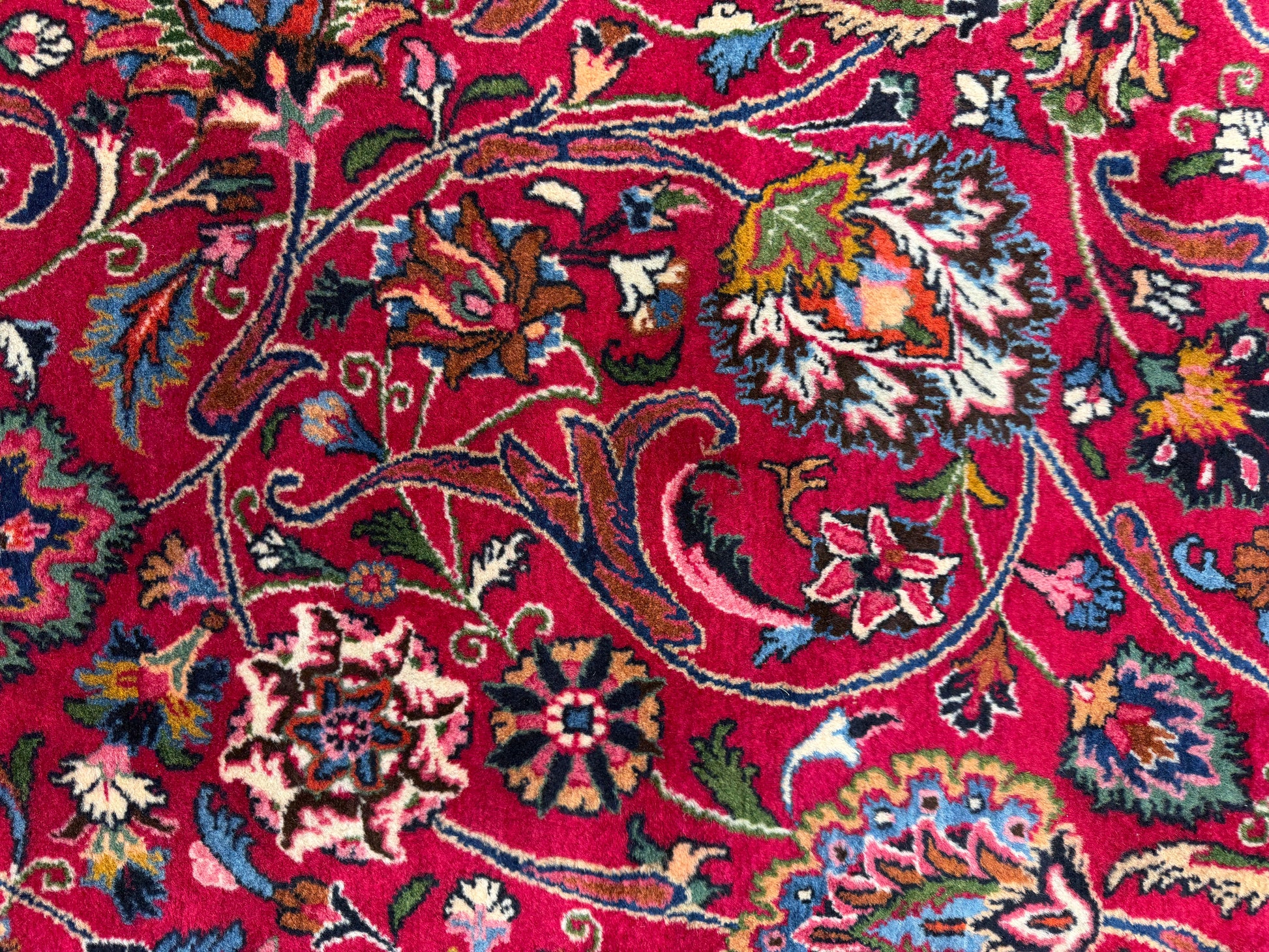 This 11’6” x 16’5” hand-knotted Persian Mashad rug showcases the refined craftsmanship and artistry that the city of Mashad is renowned for. Woven from very fine wool, the rug features a vibrant red field densely adorned with intricate floral motifs, gracefully intertwined vines, and an elegant central medallion. Its multi-tiered borders in shades of deep blue and ivory provide a striking frame, emphasizing the balance and symmetry of the traditional Persian design. Signed by the master weaver, this piece reflects both aesthetic beauty and cultural heritage.