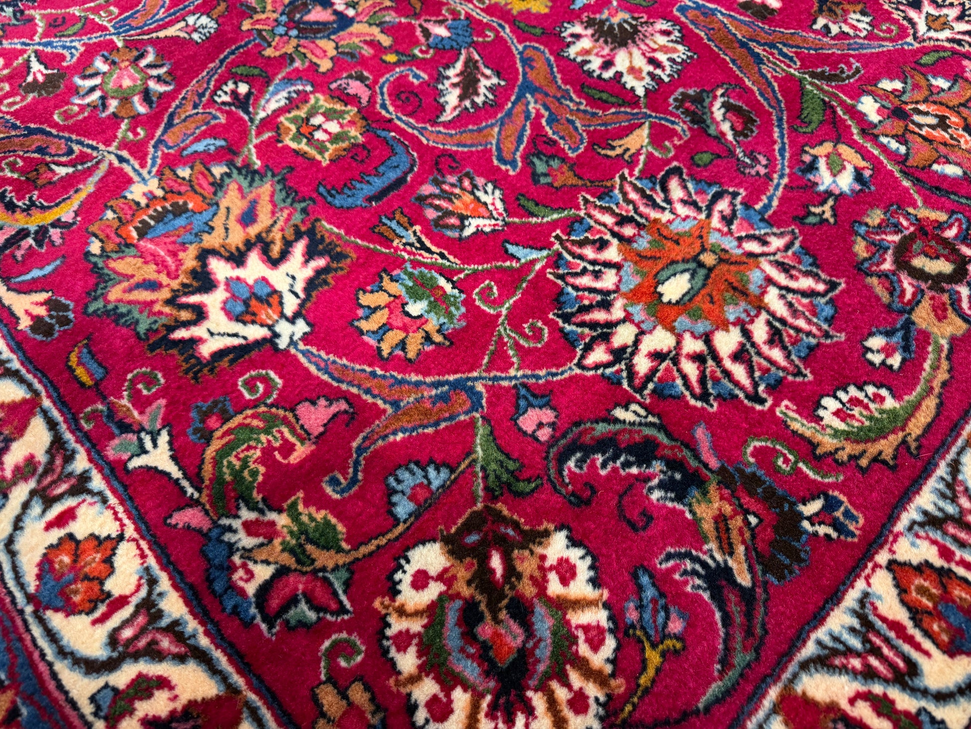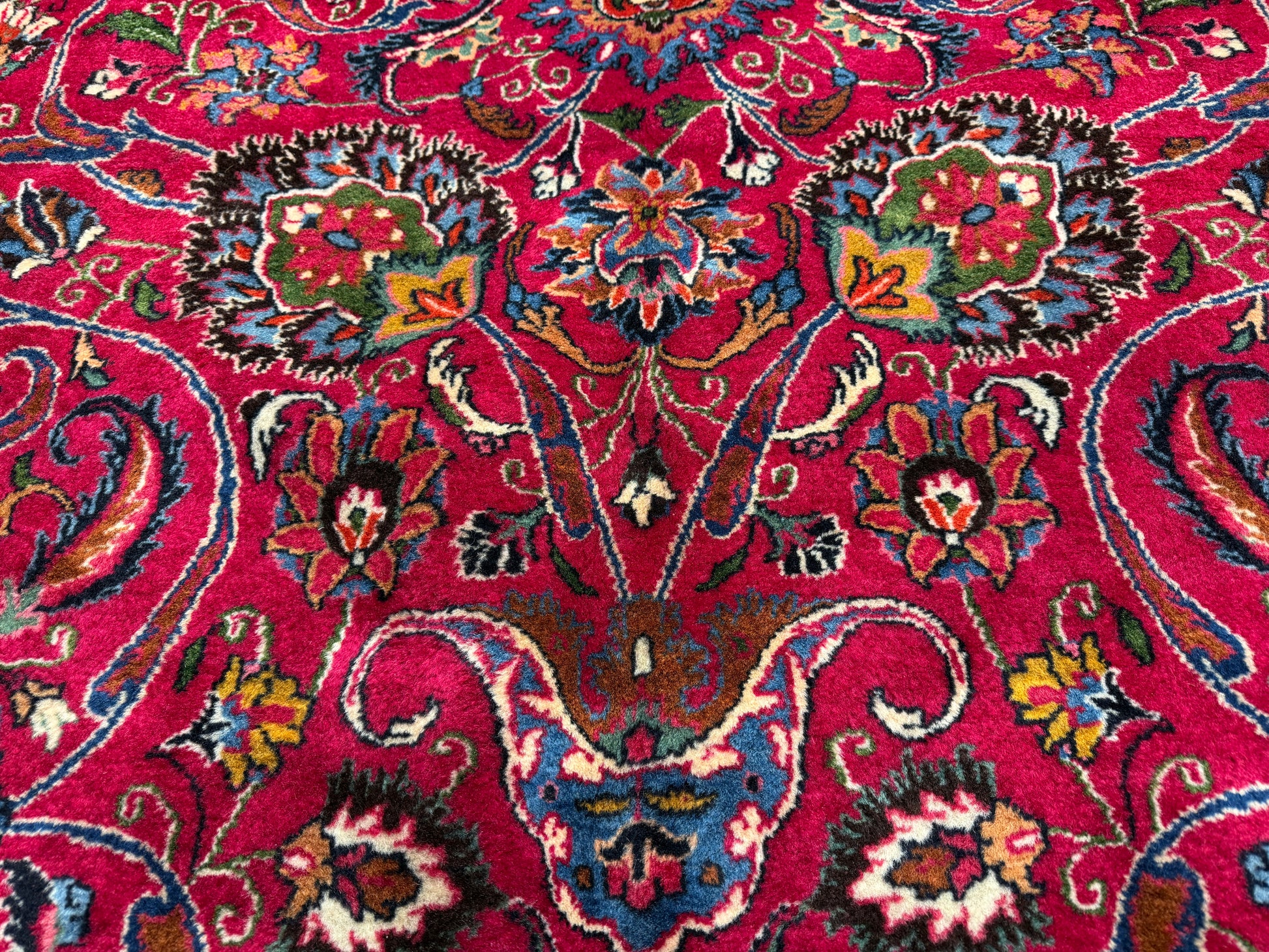Handmade to the highest standards, this Mashad rug combines durability with luxurious texture, making it suitable for both display and practical use in large spaces. Its fine knotting allows for exceptional detail in every curve of the pattern, bringing depth and movement to the overall composition. A statement piece of Persian weaving, it embodies timeless elegance and serves as a testament to the enduring tradition of hand-knotted rugs.