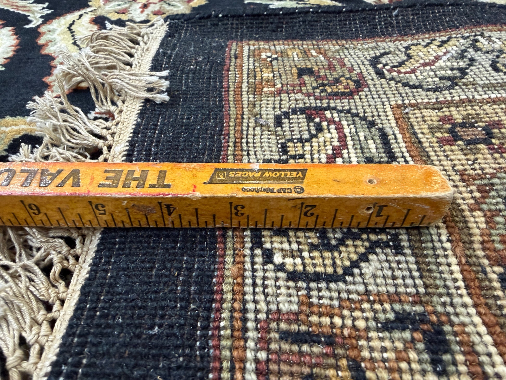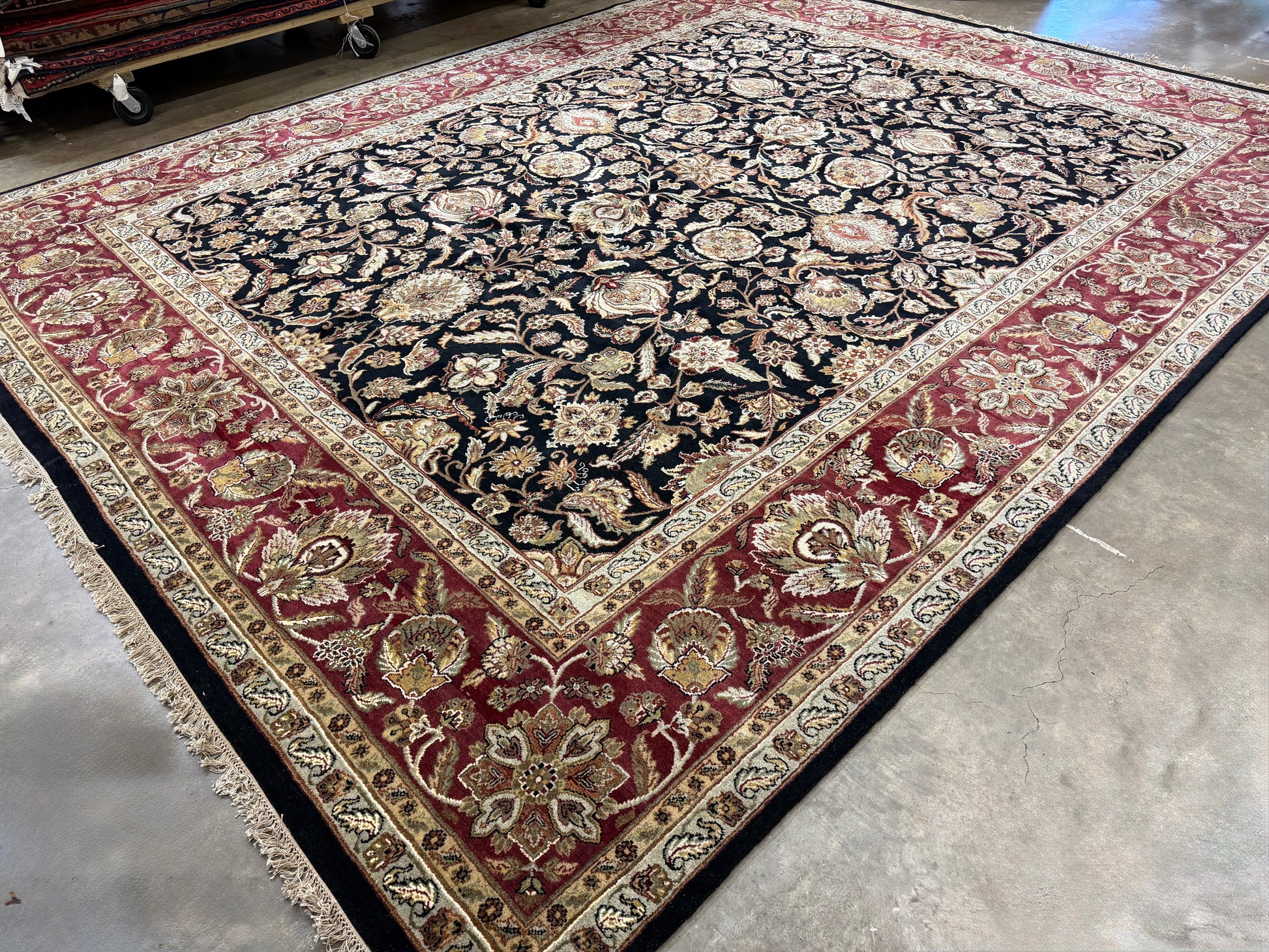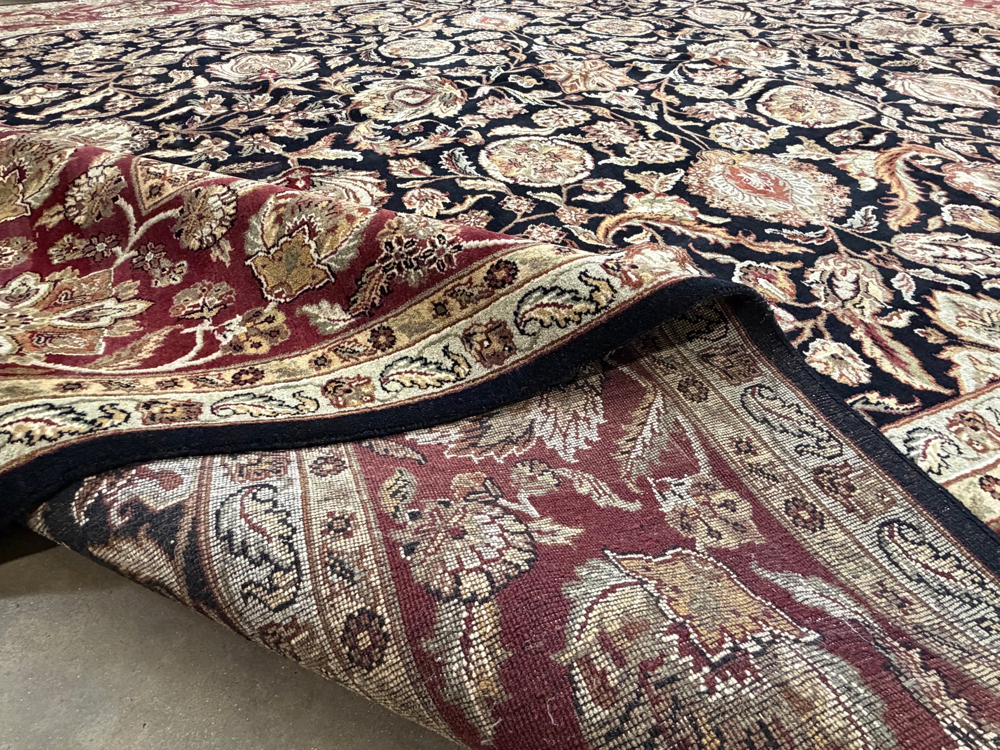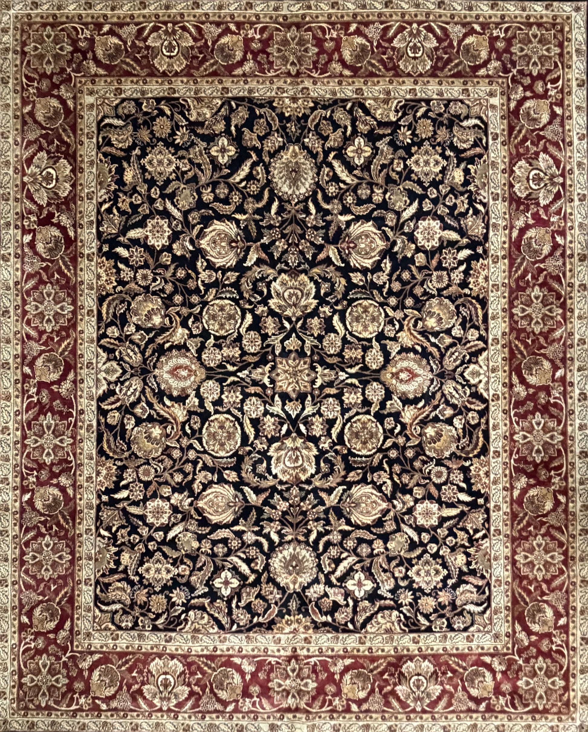 This 12’1” x 15’2” hand-knotted wool Agra area rug represents the rich tradition of Indian rug weaving, renowned for its durability and timeless artistry. Crafted entirely by hand, its intricate all-over pattern combines floral and vine motifs with a bold central medallion, creating a sense of elegance and balance across the expansive surface. The deep navy field provides a dramatic backdrop for the detailed beige and ivory designs, while the red and cream border frames the composition with a classic, regal feel.