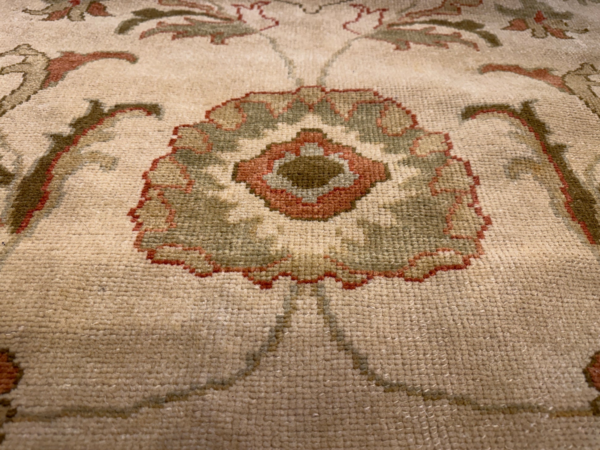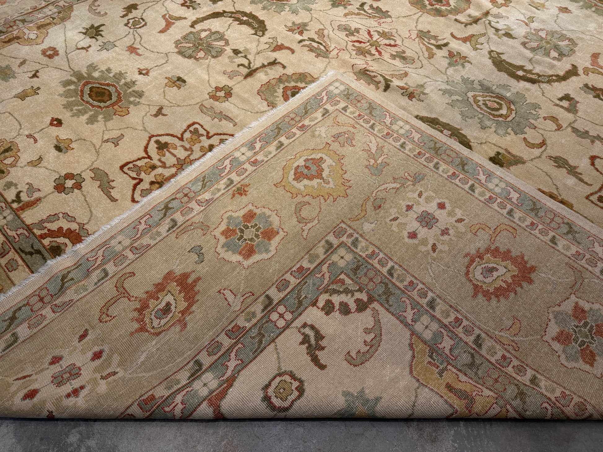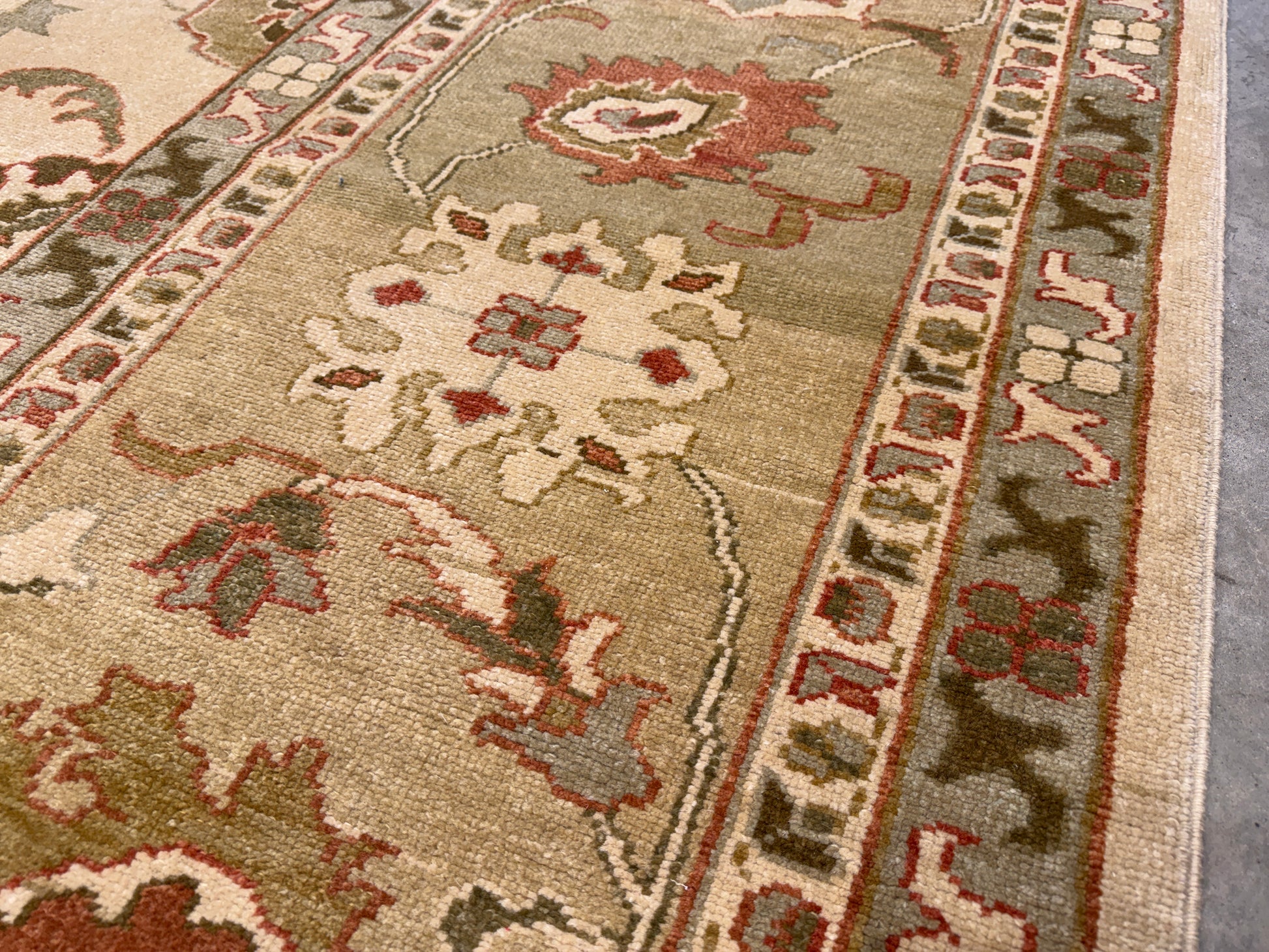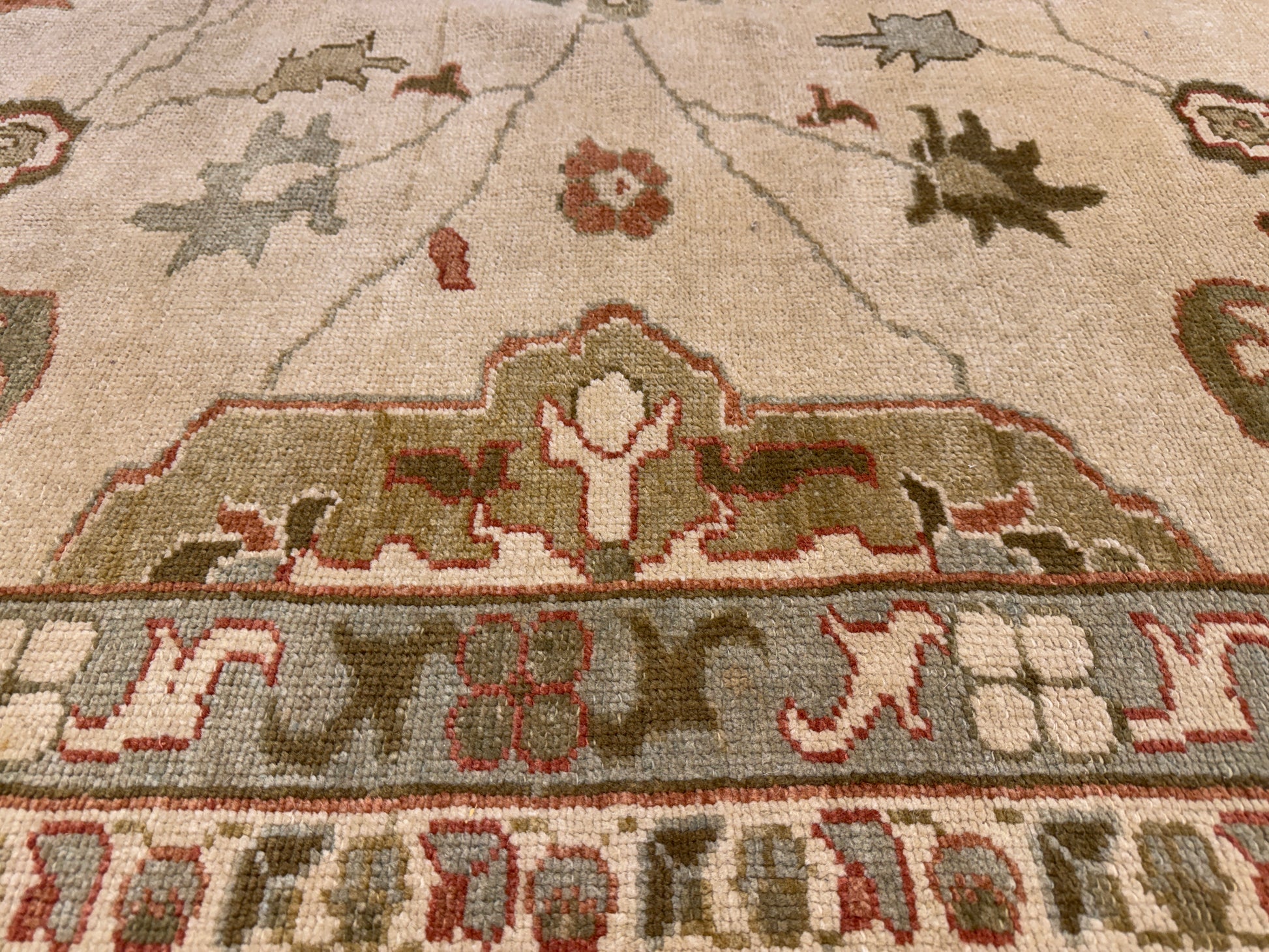 Handmade using time-honored techniques, this rug demonstrates the durability and artistry of authentic Oushak weaving. Each knot is tied by skilled artisans, resulting in a plush texture and a surface that reflects natural variations in the wool. Its generous dimensions make it ideal for anchoring a large living or dining space, while the timeless design adds warmth and understated sophistication to any setting.