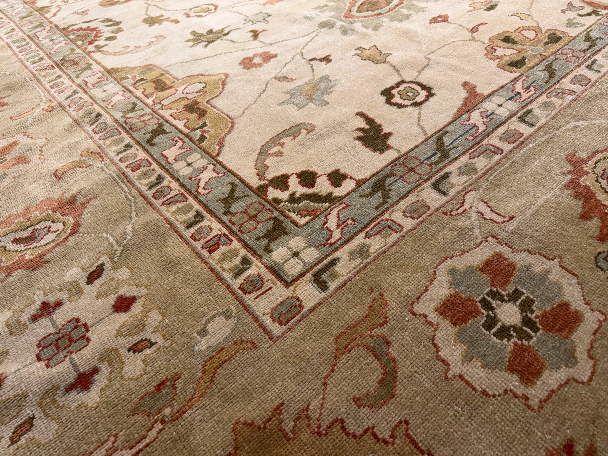This Turkish 13’1” x 16’2” hand-knotted wool Oushak rug exemplifies the renowned craftsmanship of Anatolian weaving traditions. Oushak rugs are celebrated for their soft, luminous wool and large-scale patterns that balance elegance with a rustic charm. This piece features an all-over design with floral and vine motifs, arranged in a harmonious layout that emphasizes symmetry and flow. The earthy tones and muted palette are characteristic of Oushak rugs, making them versatile for both classic and modern interiors.