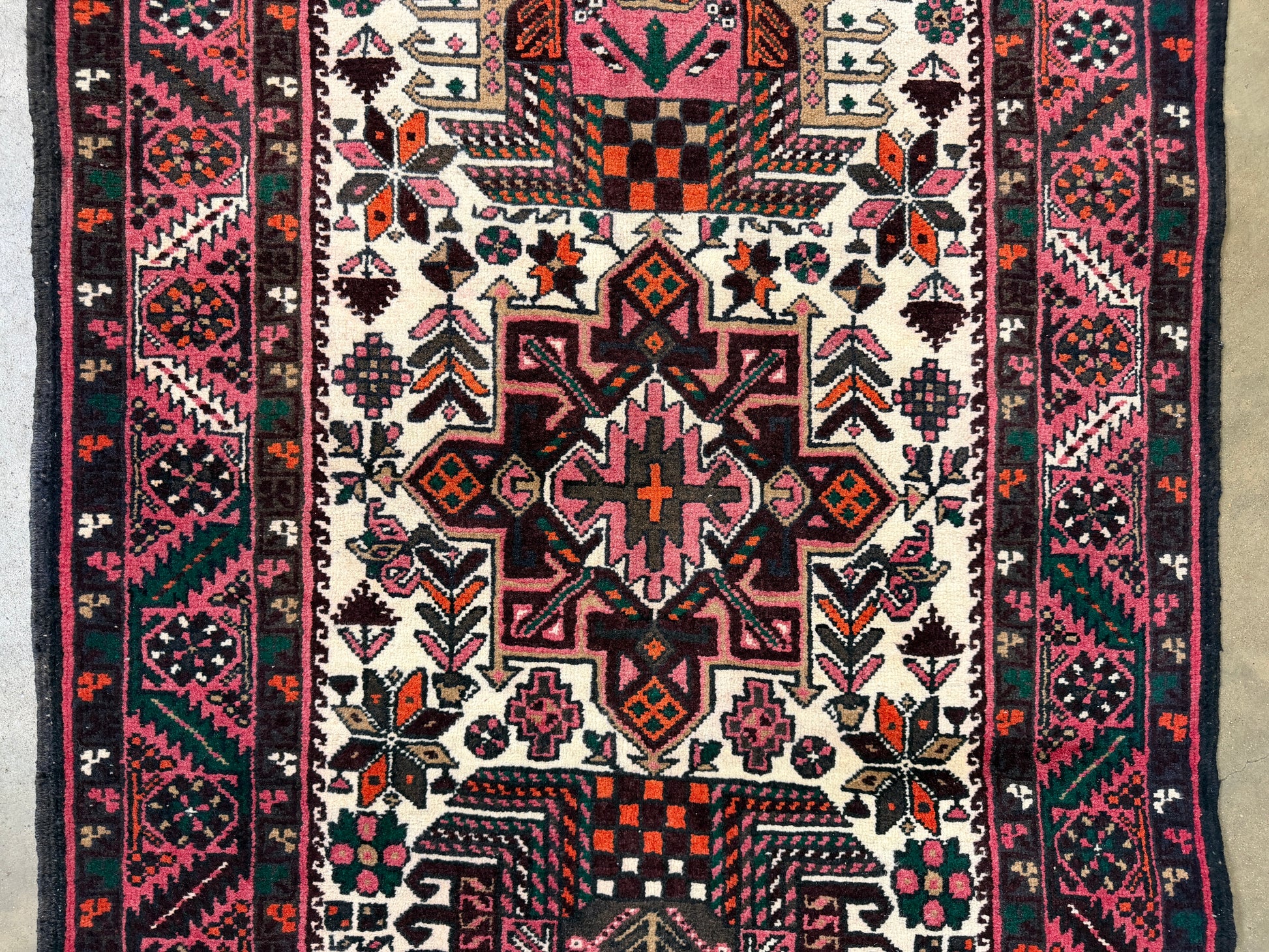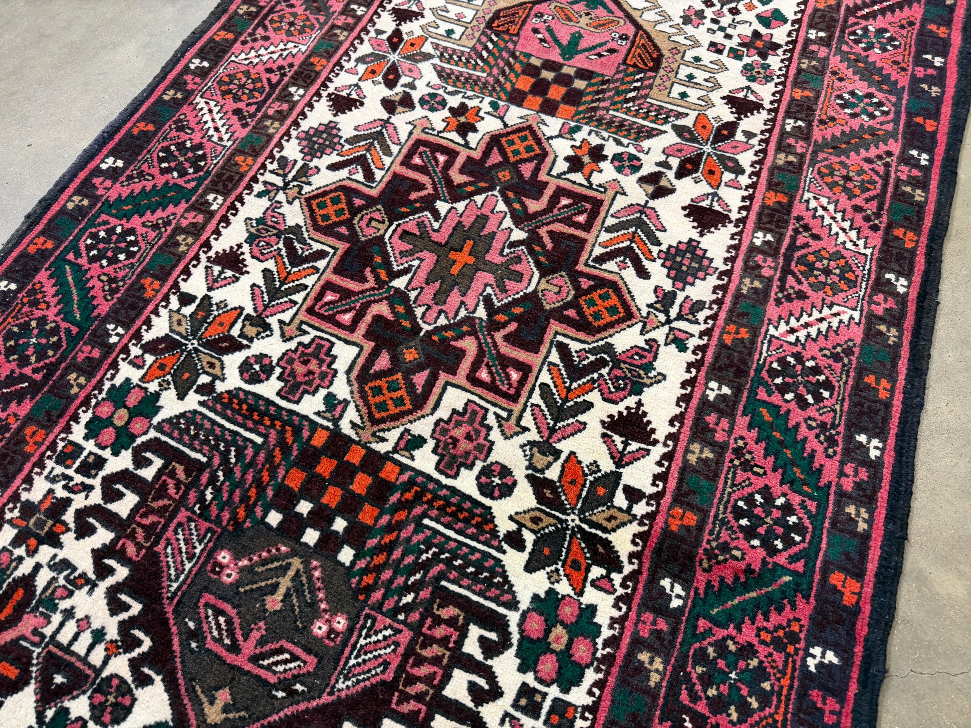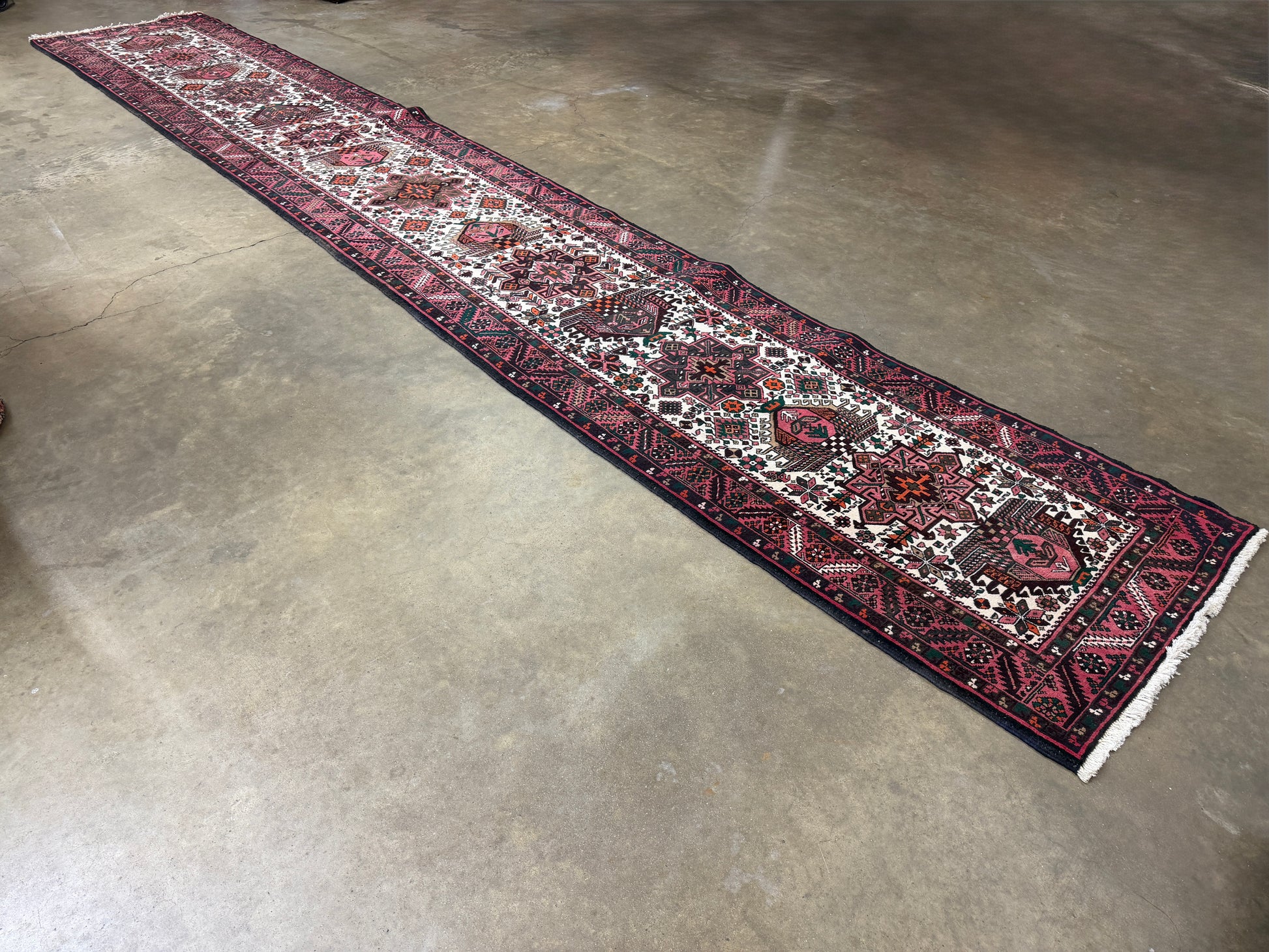 The rug’s distinctive palette of pinks and reds, accented with ivory and deeper tones, highlights the signature character of Heriz craftsmanship. Large, angular medallions form a central spine along the runner’s length, while geometric florals and tribal elements fill the surrounding field. Each shape is mirrored or echoed in subtle variations, demonstrating the weaver’s skill in harmonizing symmetry with organic irregularity. The intricate border frames the design like a piece of fine jewelry, using repeating motifs to ground the vibrant interior.