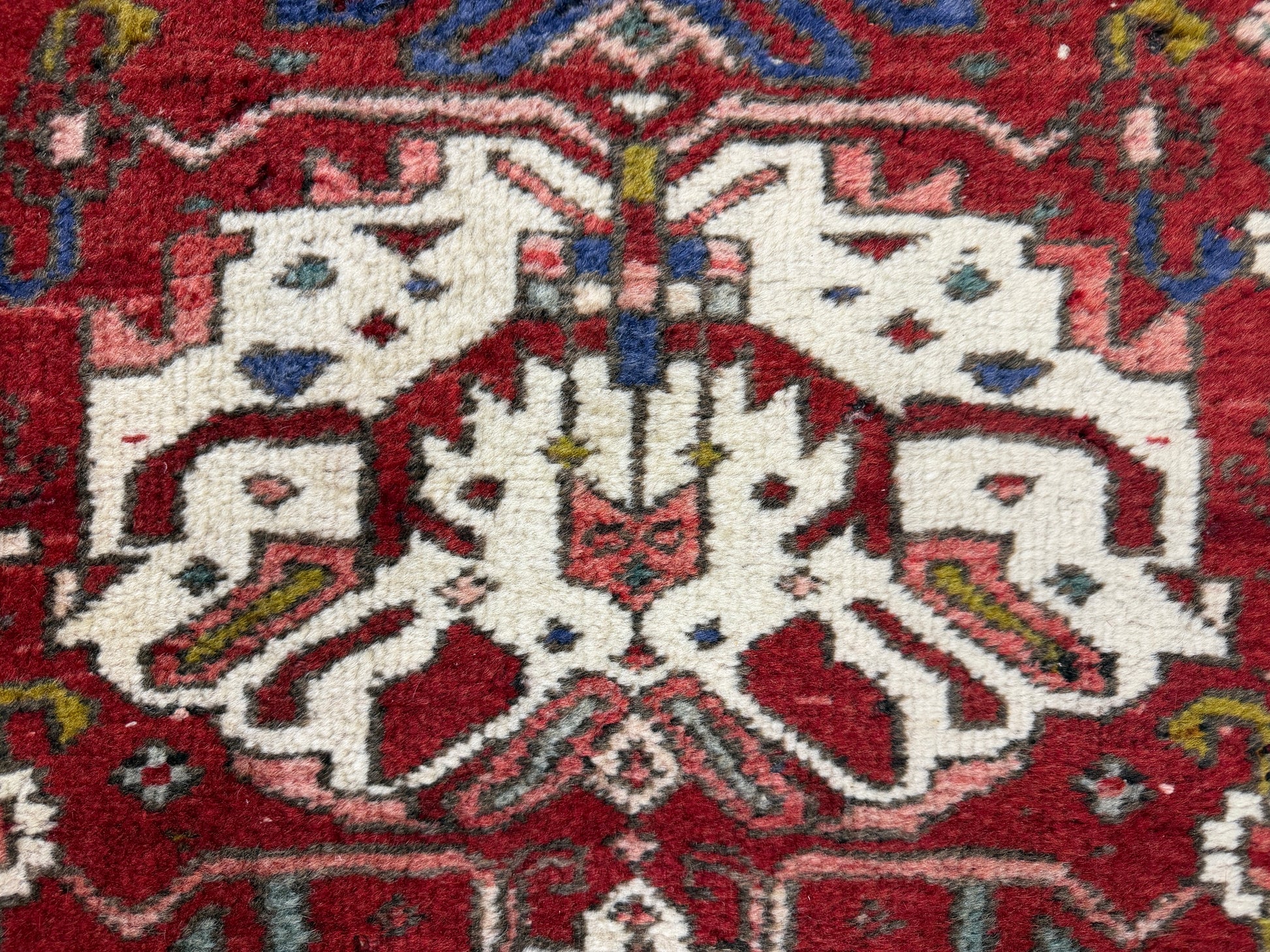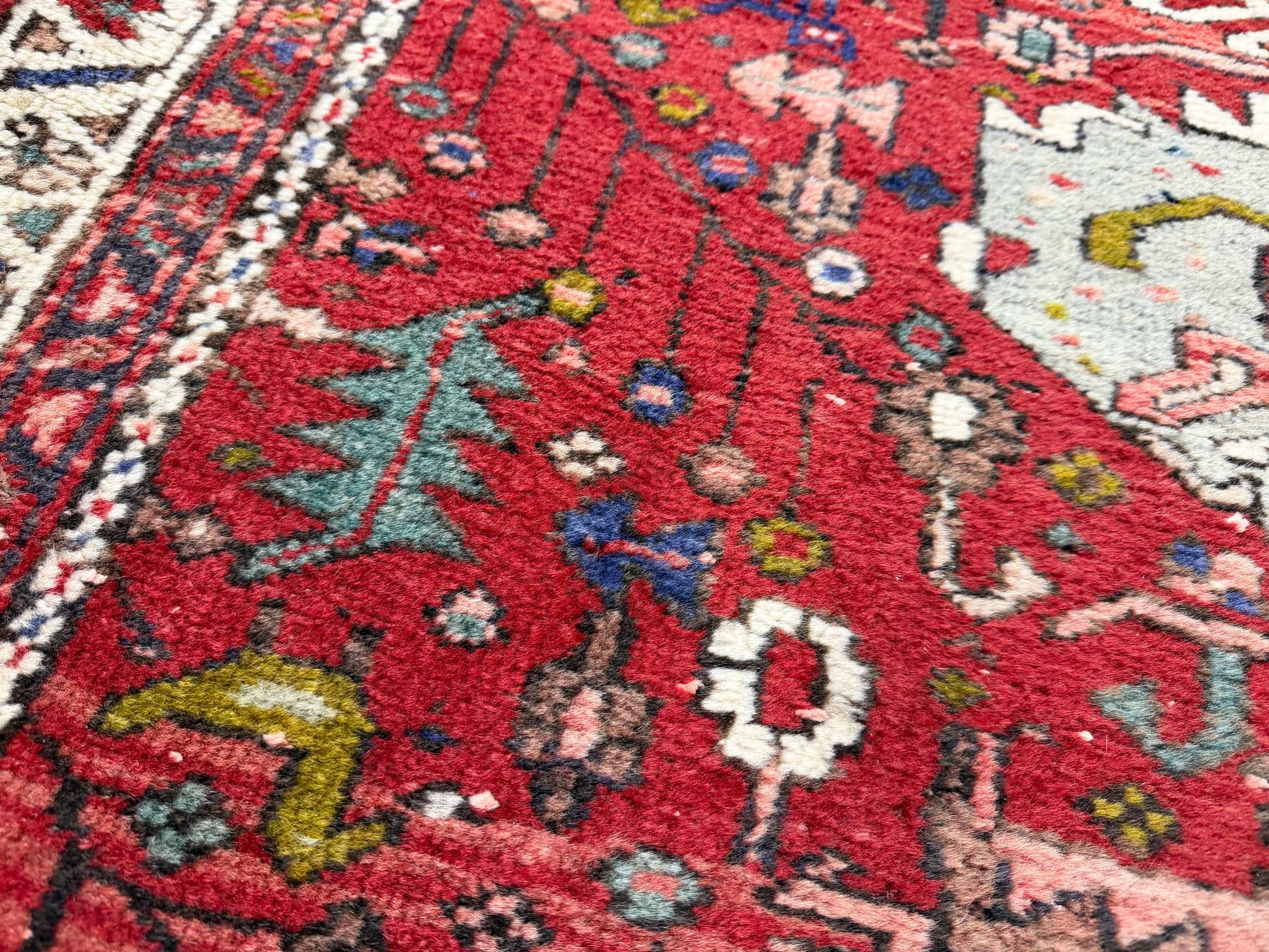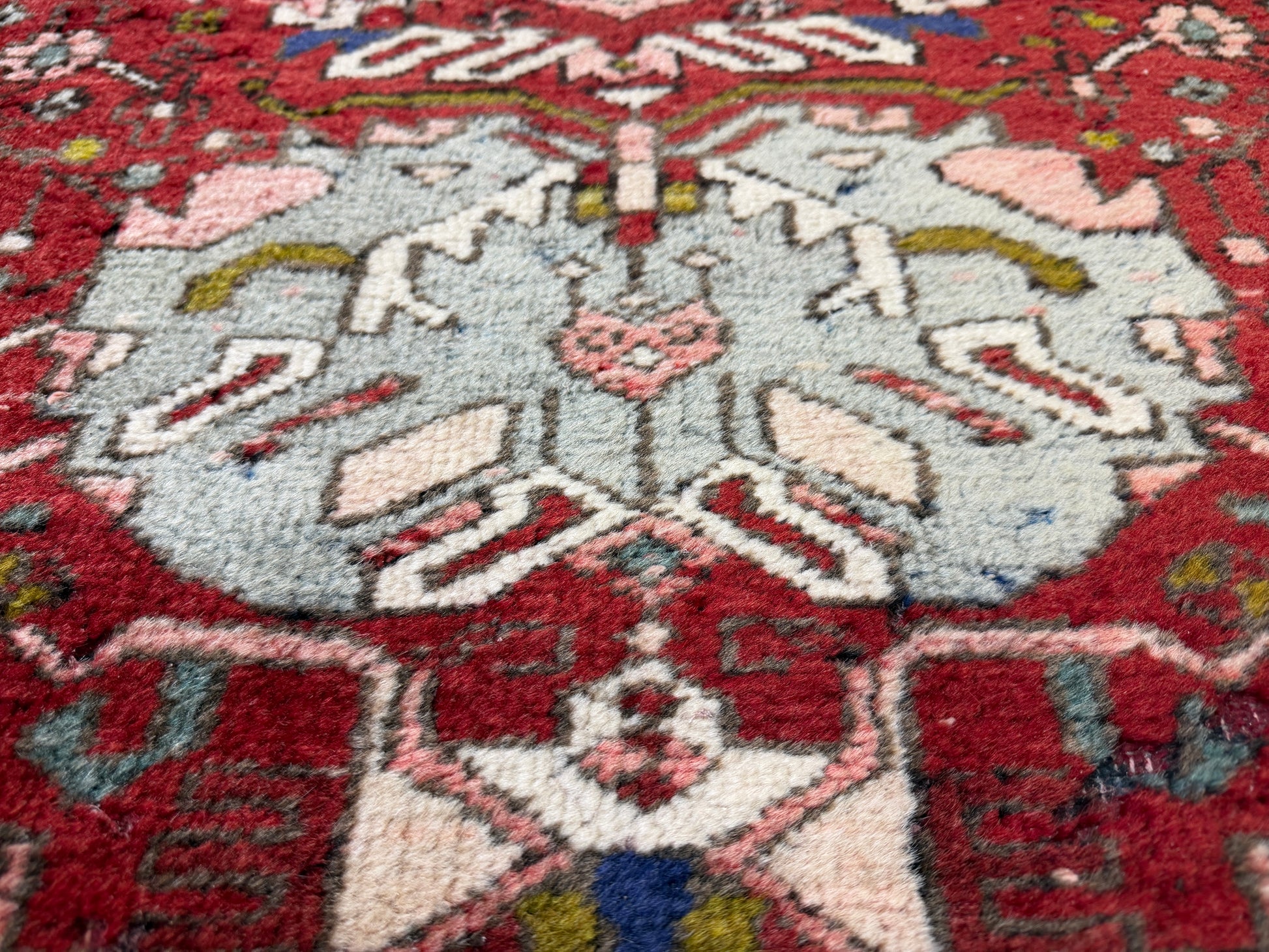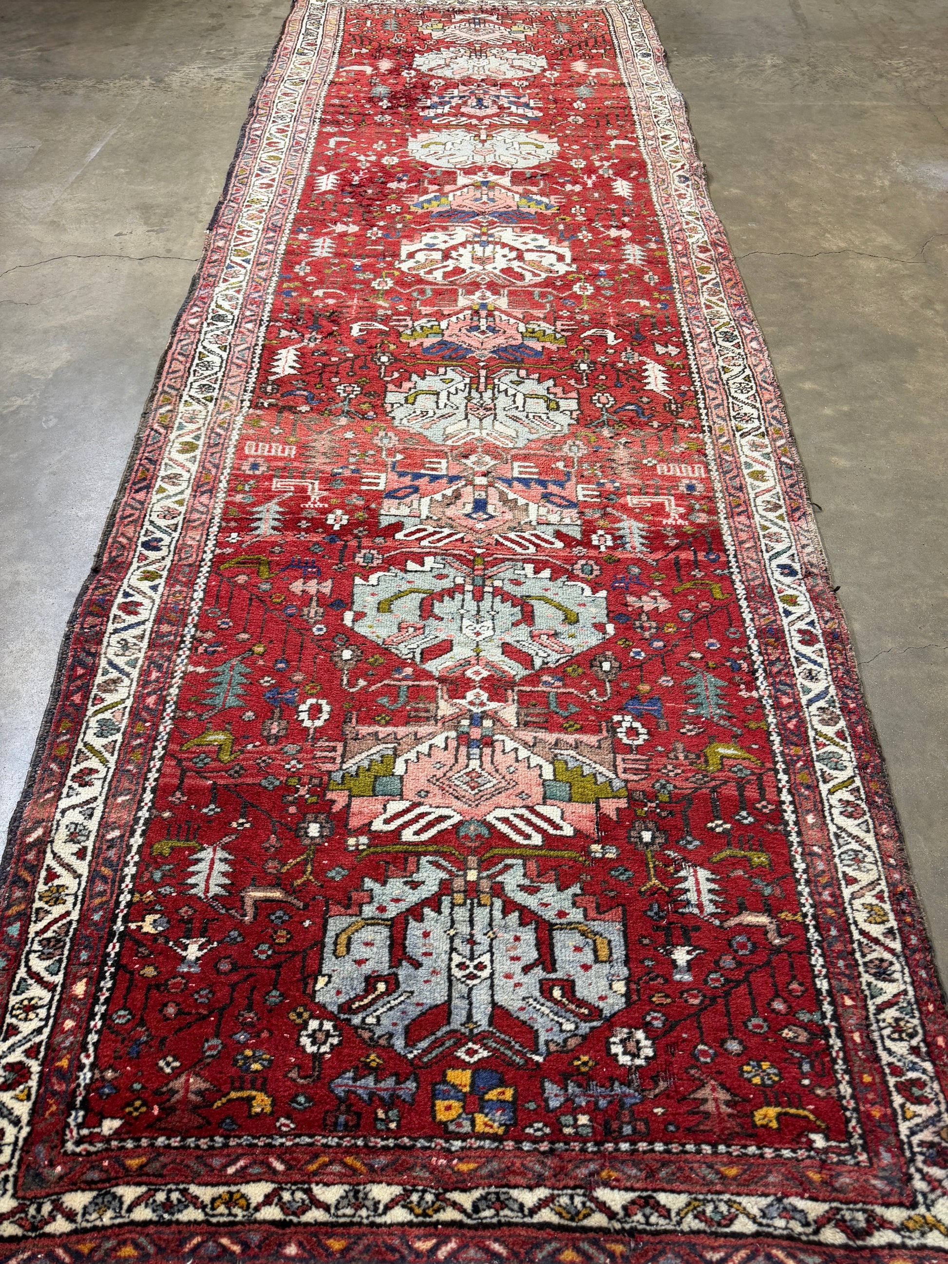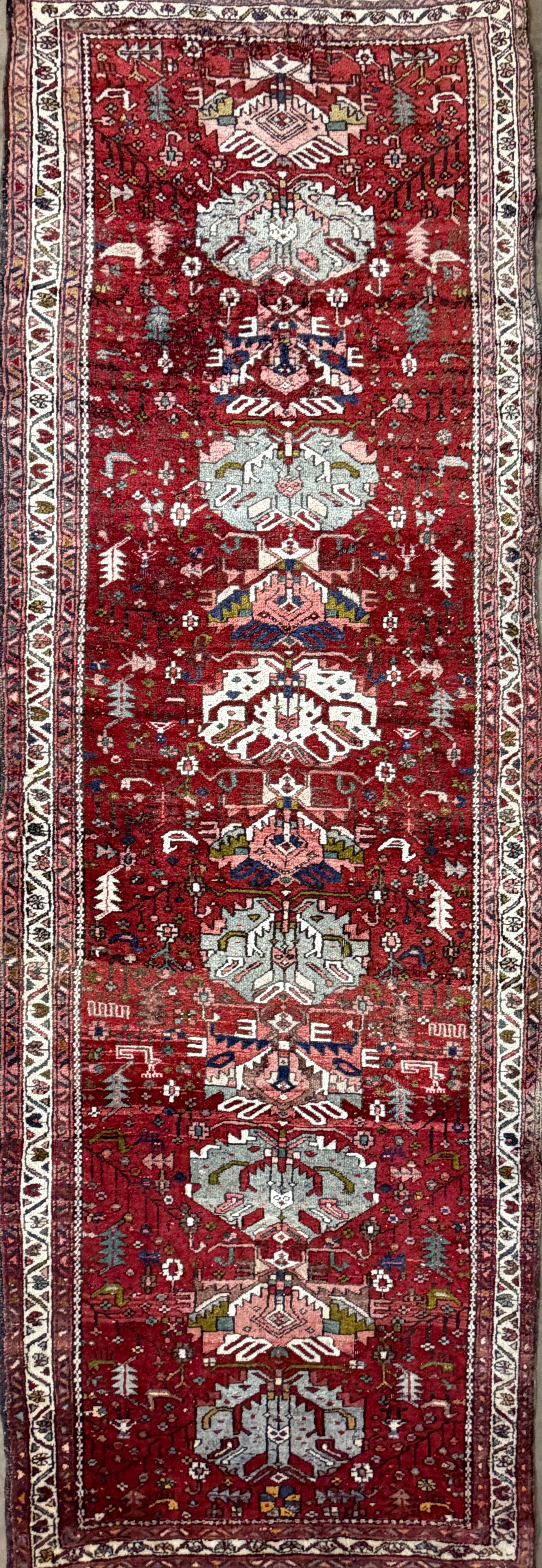 This 3’10” x 10’10” antique Heriz runner rug exemplifies the bold geometric artistry for which Heriz weavings are celebrated. Woven in the rugged mountains of Northwest Persia, the piece features a richly saturated crimson field adorned with a series of large, stylized medallions in ivory, soft blue, pale green, and muted pink. Angular vines and abstract floral motifs fill the surrounding space, creating a lively yet balanced composition that draws the eye along the length of the runner.