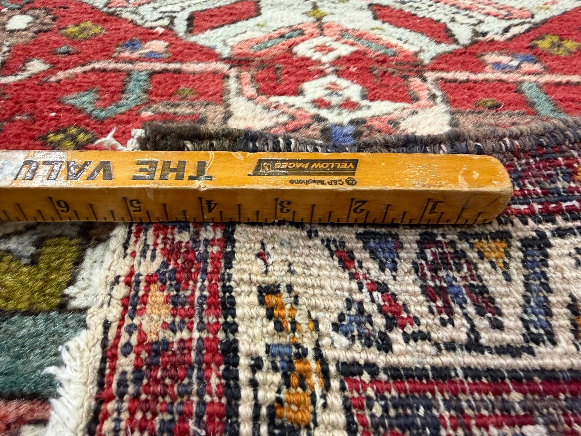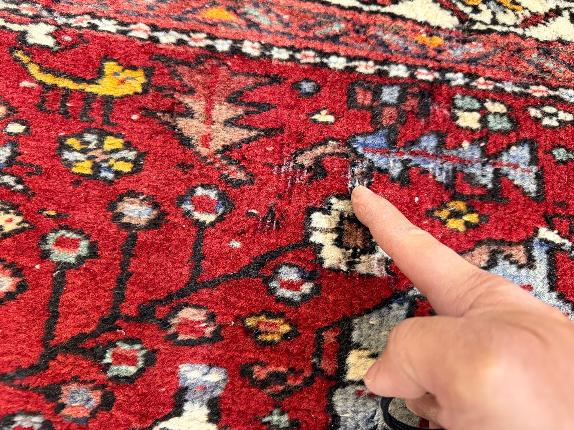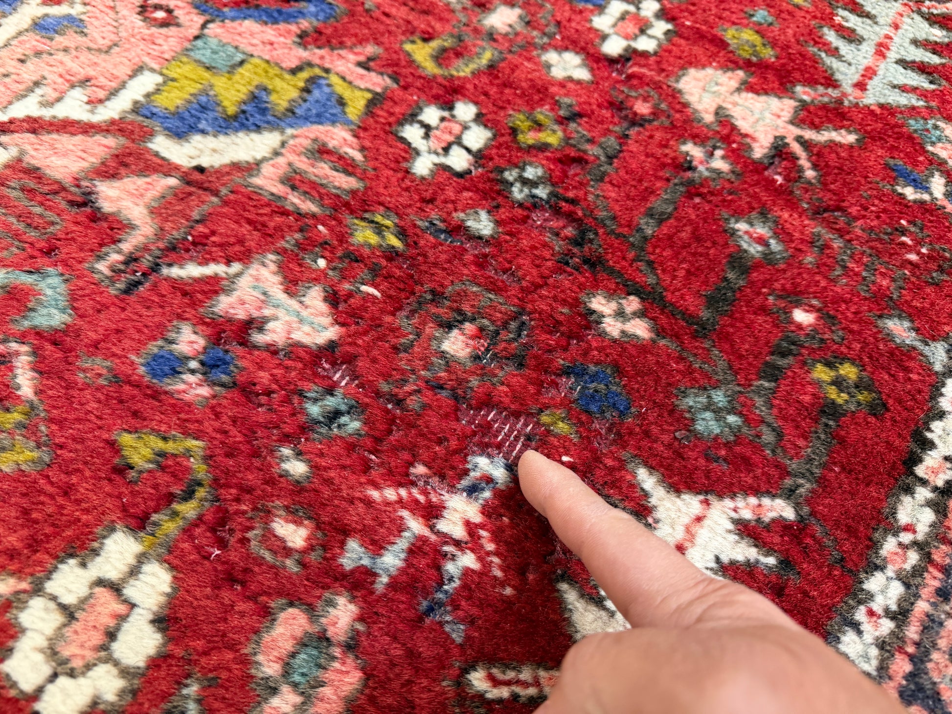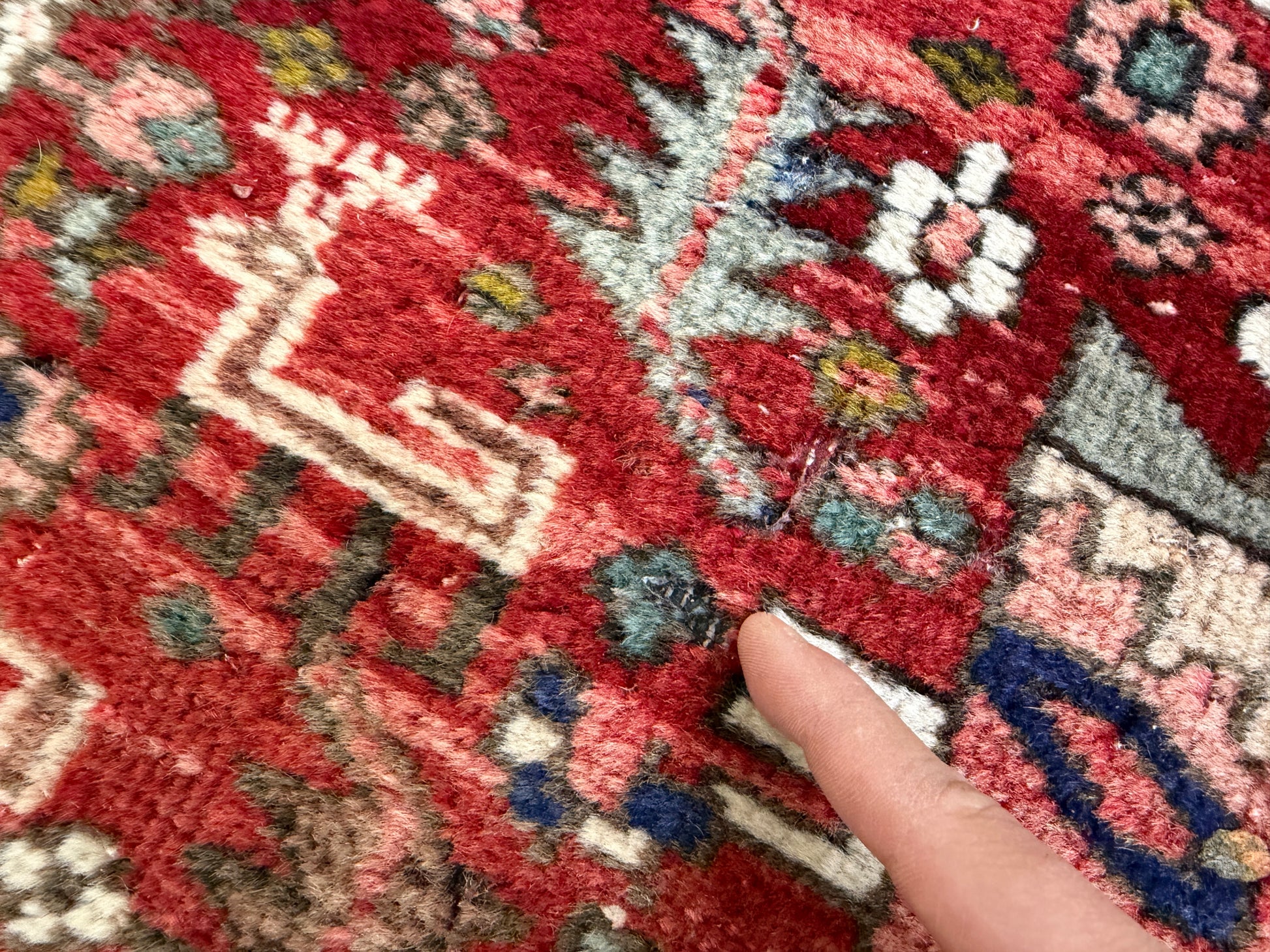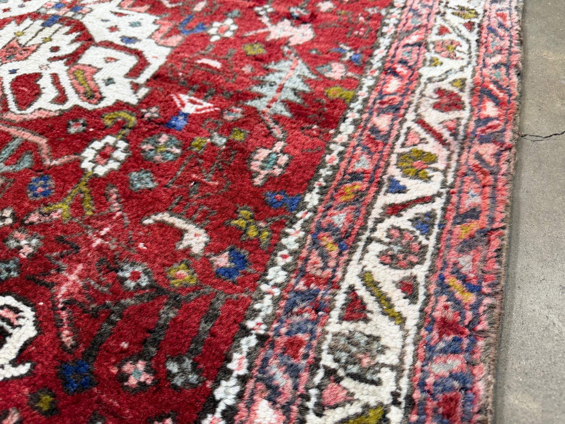 *Several areas of missing pile and previous damage are noticed on the rug. Please see all photos for complete details.