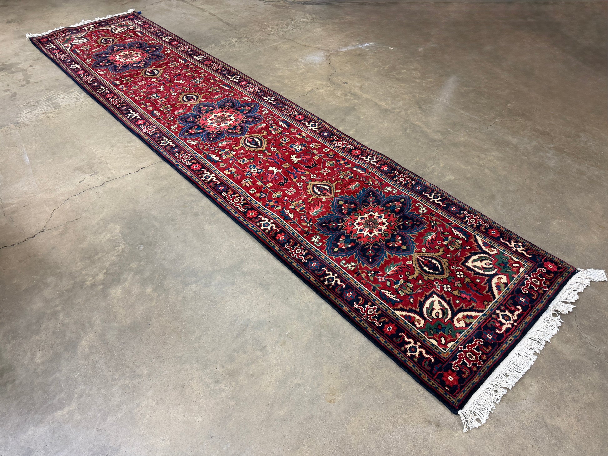 Hand-knotted from high-quality wool, this Heriz runner offers exceptional durability and a soft, resilient pile underfoot. The intricate design is framed by layered borders featuring repeating floral and vine elements, creating a sense of rhythm and balance throughout the length of the rug. Its deep reds, accented by touches of navy, ivory, and green, give it an inviting warmth that enhances both traditional and transitional interiors.