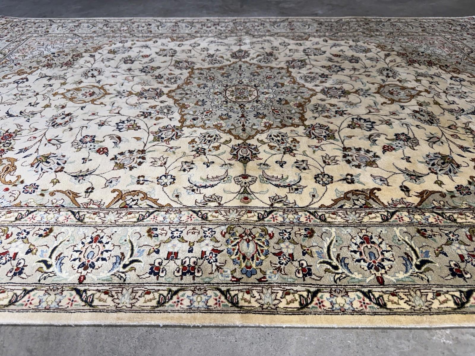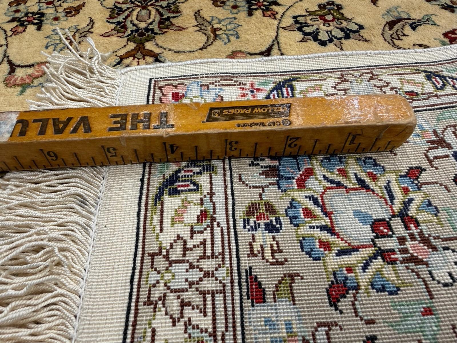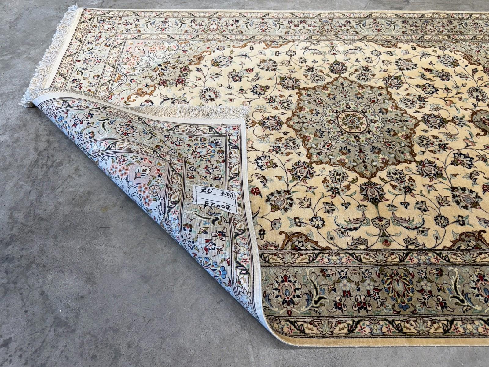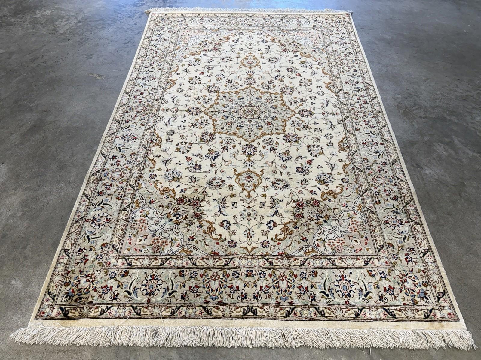 This 3’2”x5’ hand-knotted Qume area rug is made of 100% silk in a traditional beige color. It features a medallion pattern and a low pile height, making it suitable for high traffic areas and for those with pets. The rug is handmade with Approximately 700-800 knots per square inch, ensuring a quality and unique piece for any room in your home, including the living room, bedroom, kitchen, or hallway. Easy to clean and eco-friendly, this rug is a stylish and practical addition to your home decor.