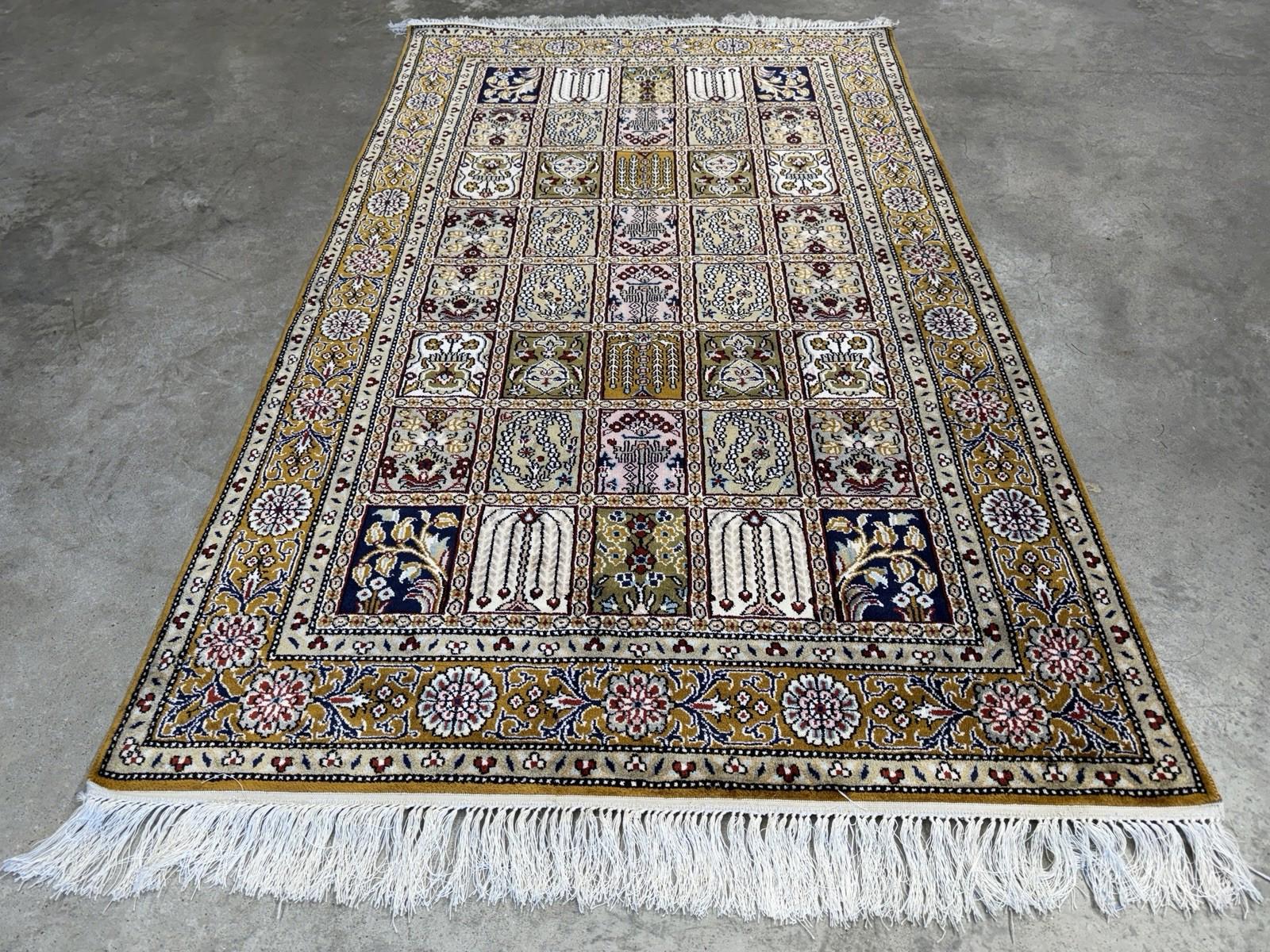 Add a radiant touch of tradition to your home with this fine hand-knotted Qume area rug, crafted entirely from 100% silk. Measuring 3' x 5', its all-over floral pattern and vibrant yellow hue make it a cheerful and elegant accent for any room.