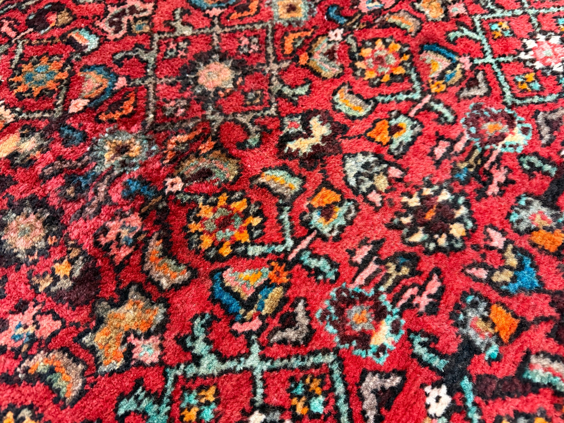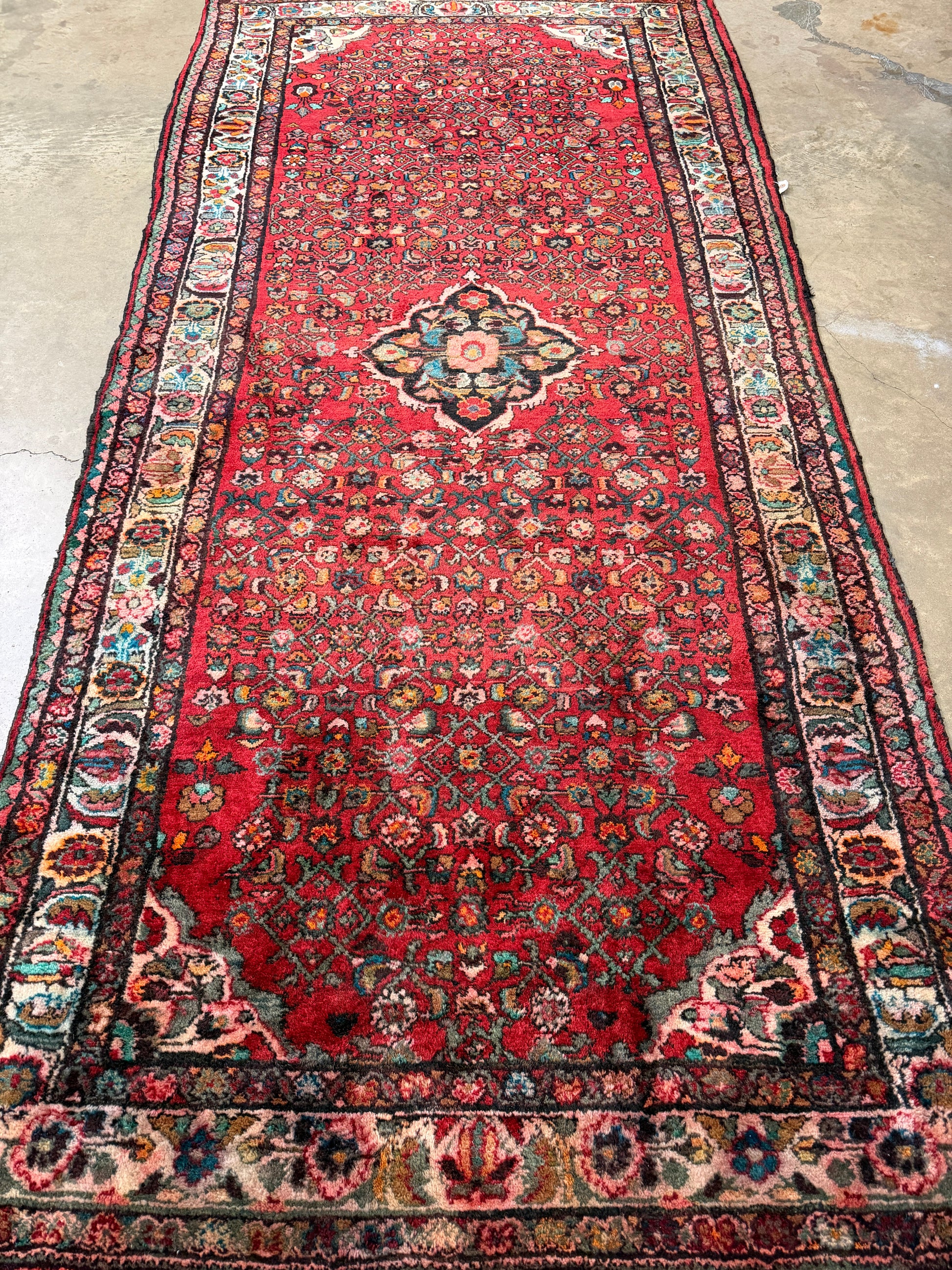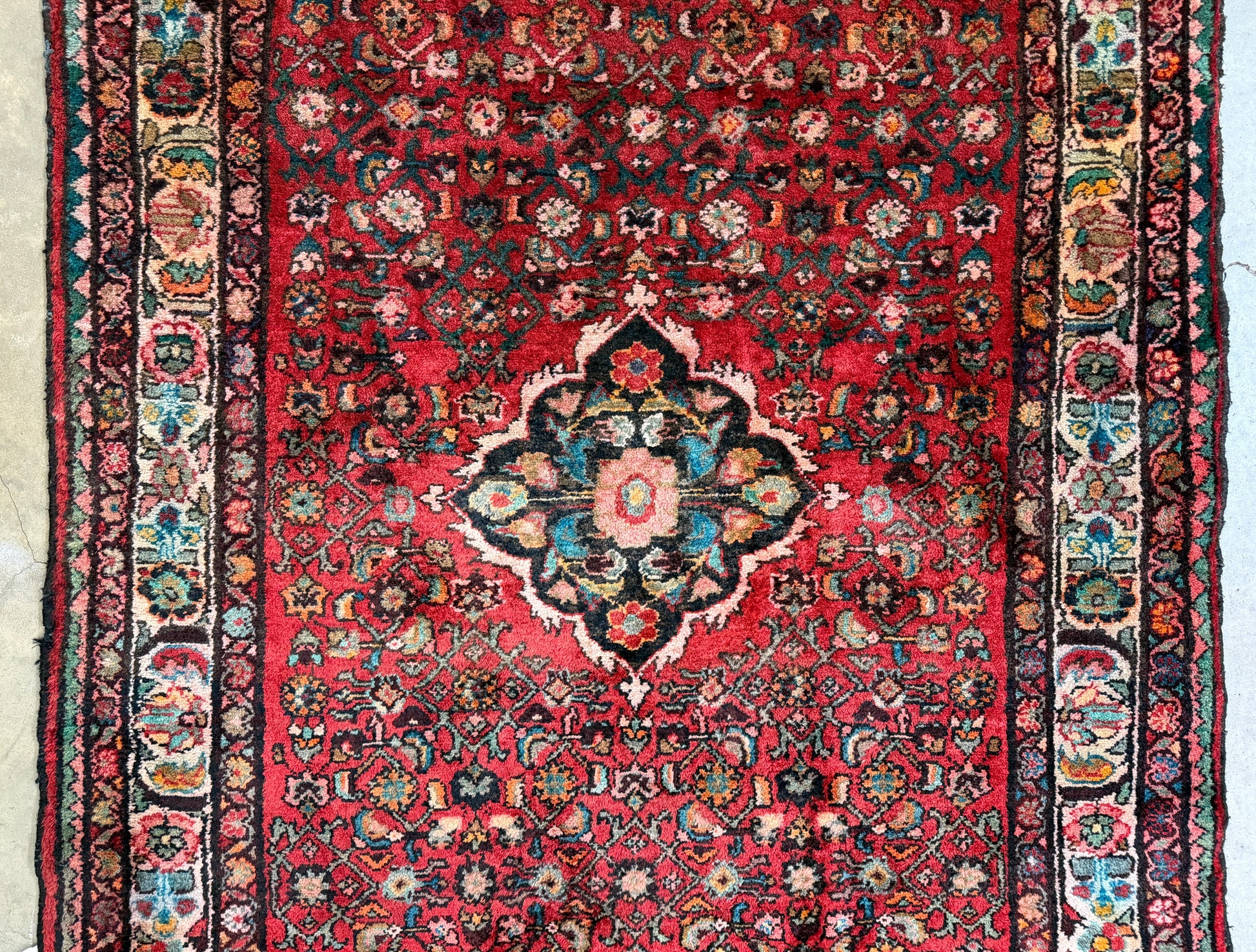 This 4’10” x 10’3” vintage hand-knotted Hamadan Persian rug is a striking example of traditional tribal craftsmanship. Woven entirely from high-quality wool, it features a rich red field adorned with intricate geometric and floral motifs that reflect the artistry of the Hamadan weaving region. The design is anchored by a central medallion, surrounded by a symphony of small, repeating patterns that create depth and movement across the rug’s surface.