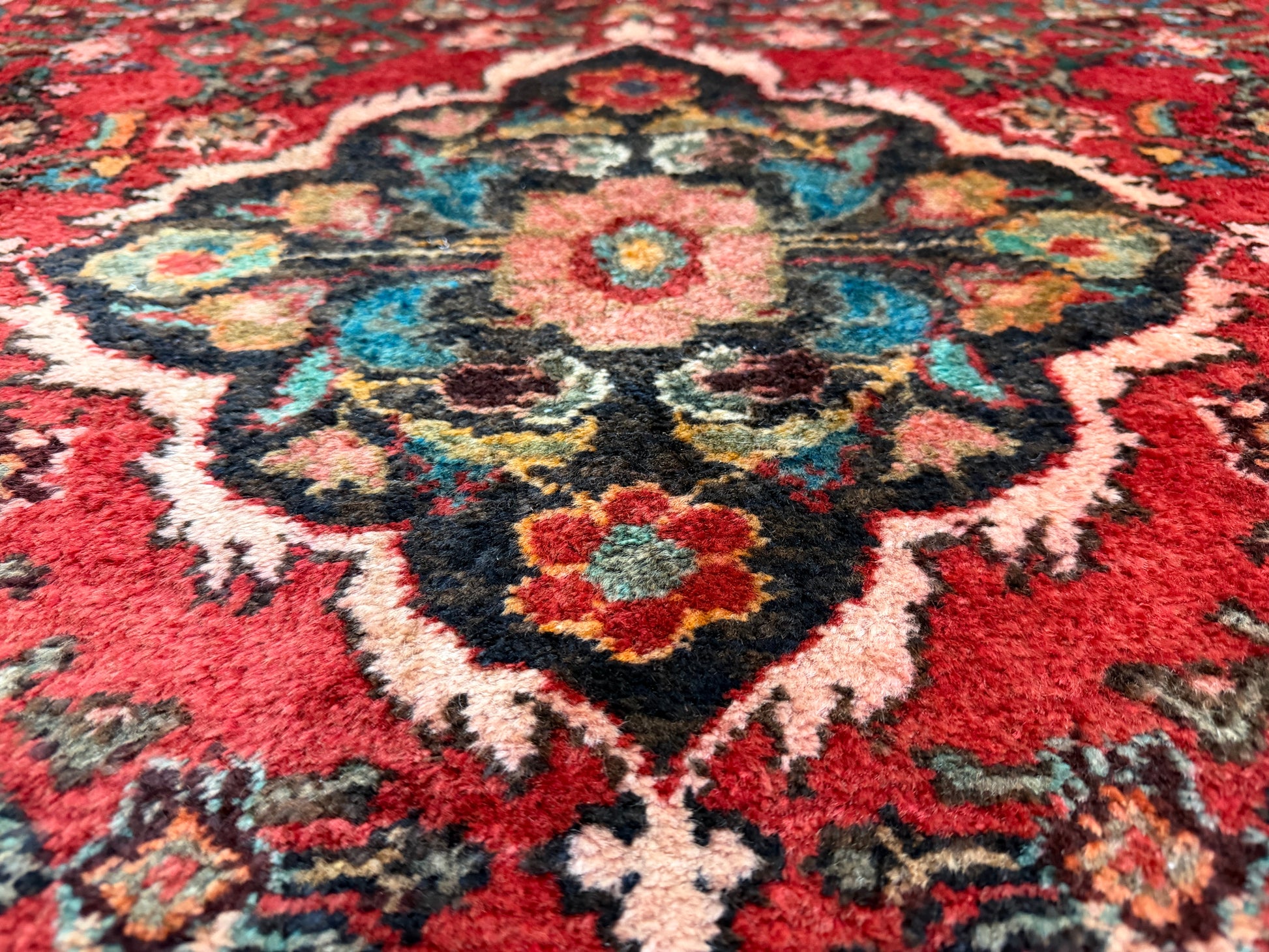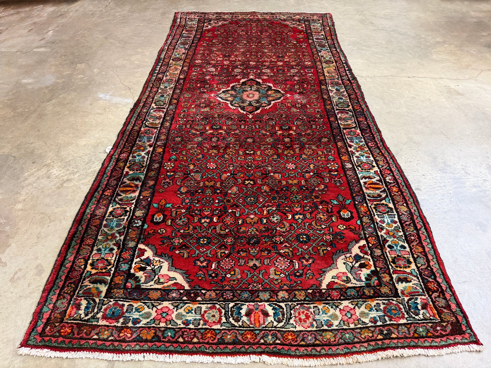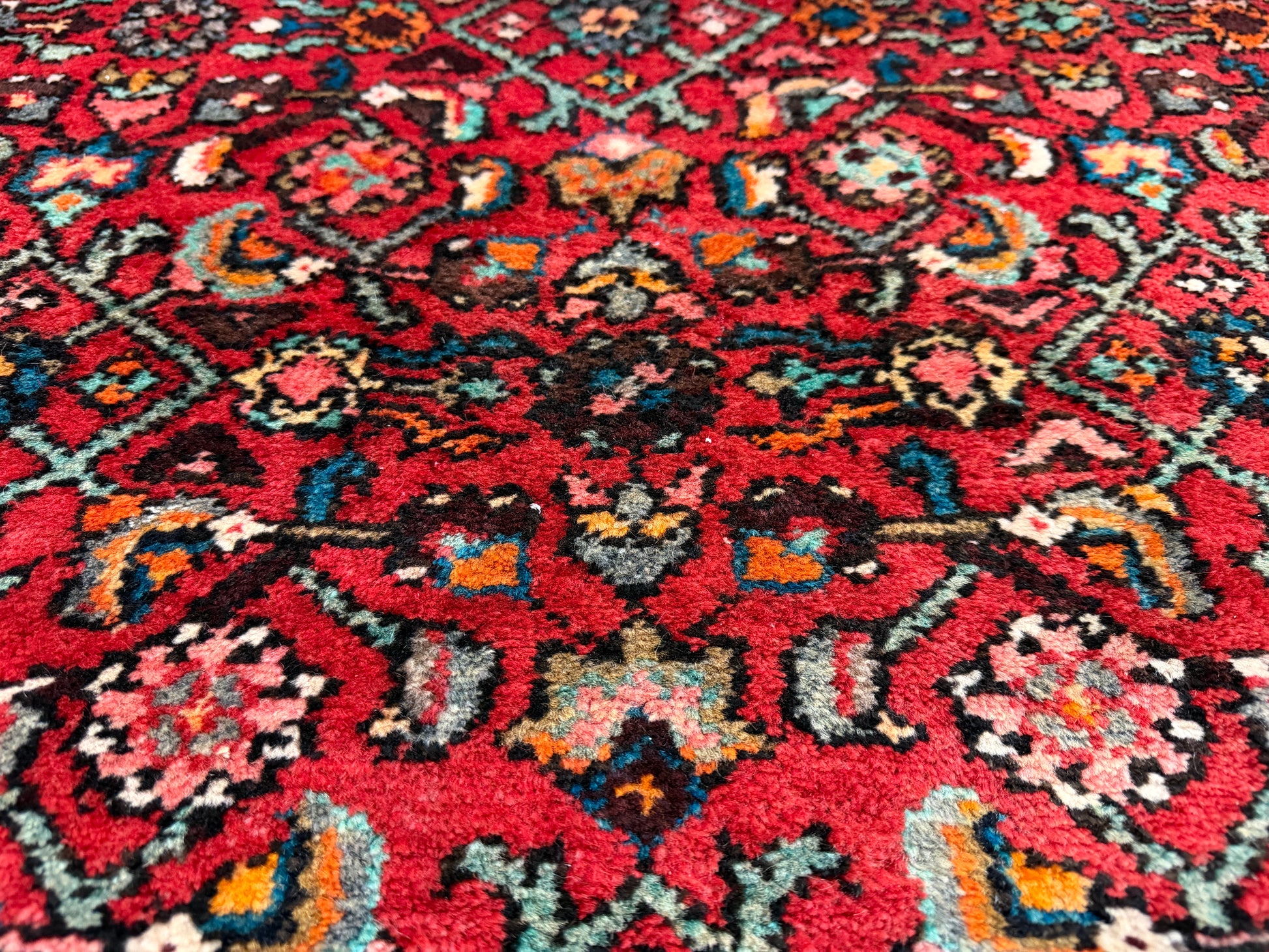 This 4’10” x 10’3” vintage hand-knotted Hamadan Persian rug is a striking example of traditional tribal craftsmanship. Woven entirely from high-quality wool, it features a rich red field adorned with intricate geometric and floral motifs that reflect the artistry of the Hamadan weaving region. The design is anchored by a central medallion, surrounded by a symphony of small, repeating patterns that create depth and movement across the rug’s surface.