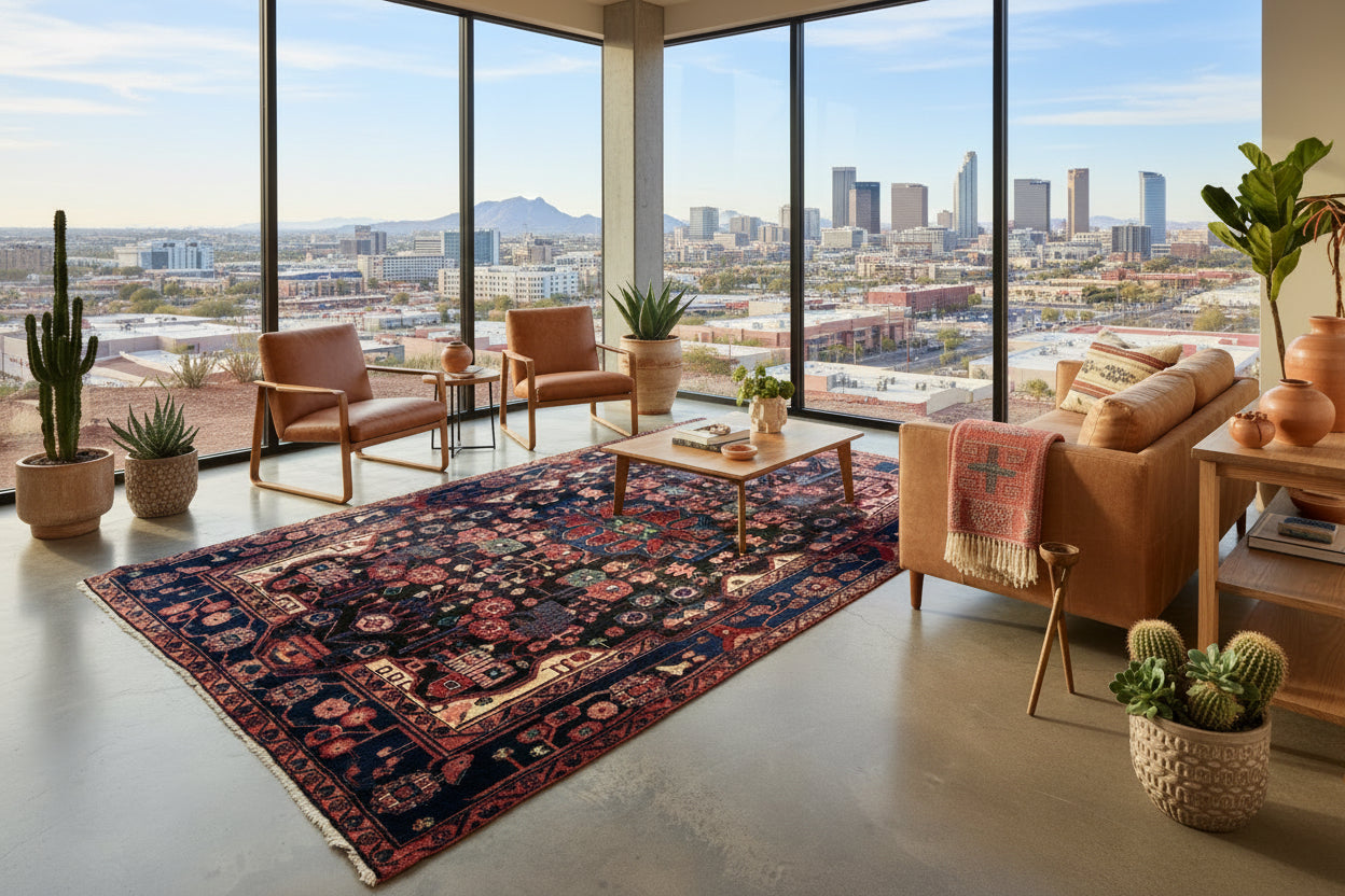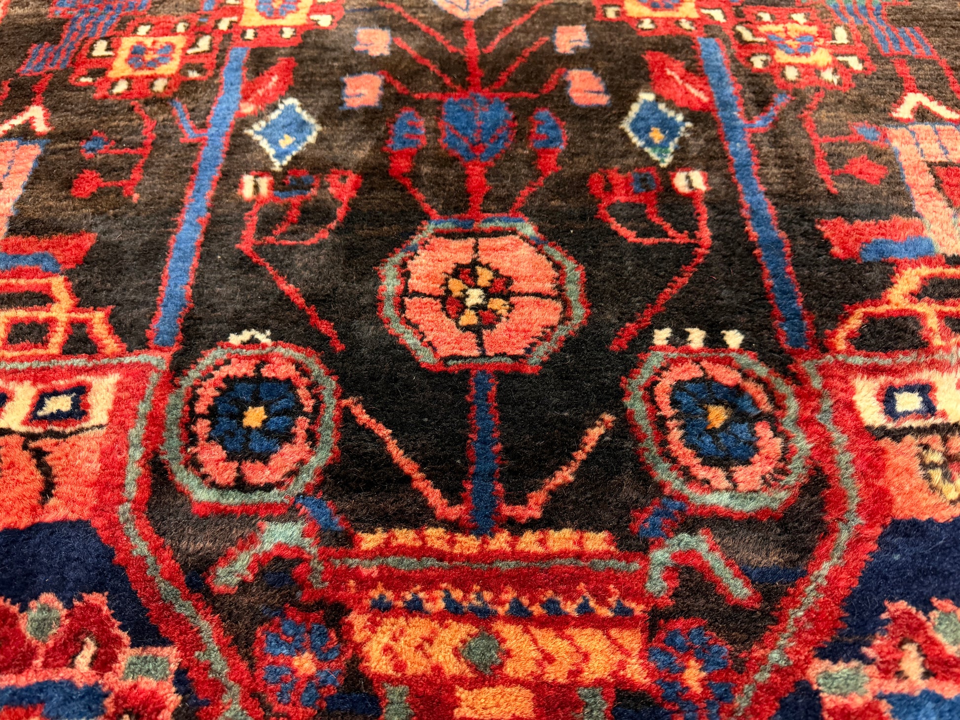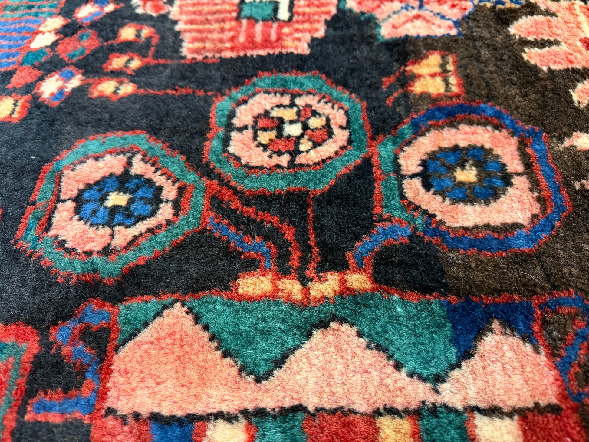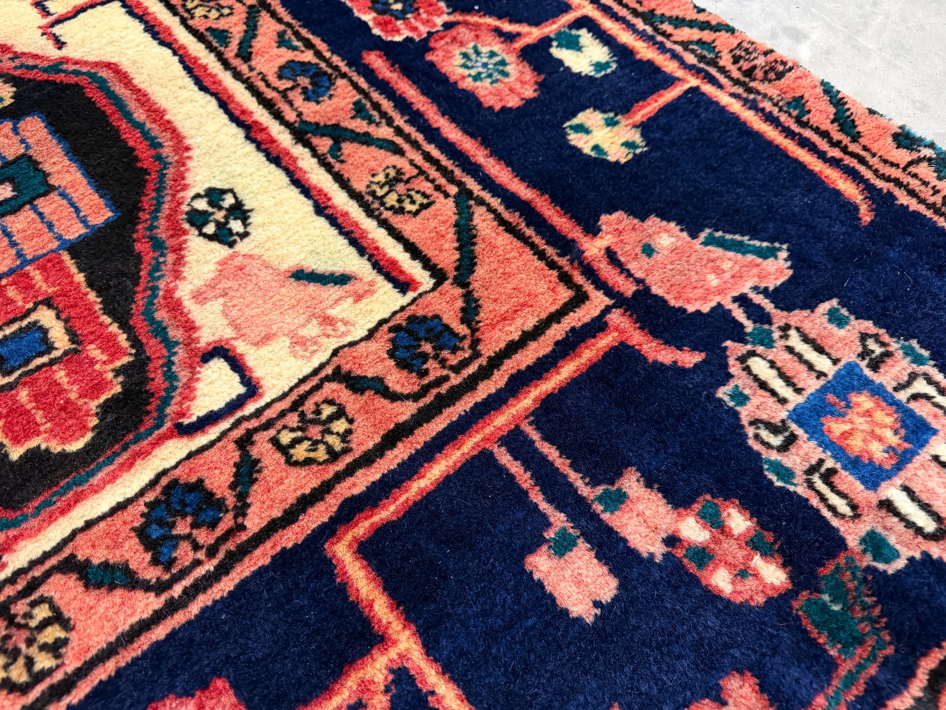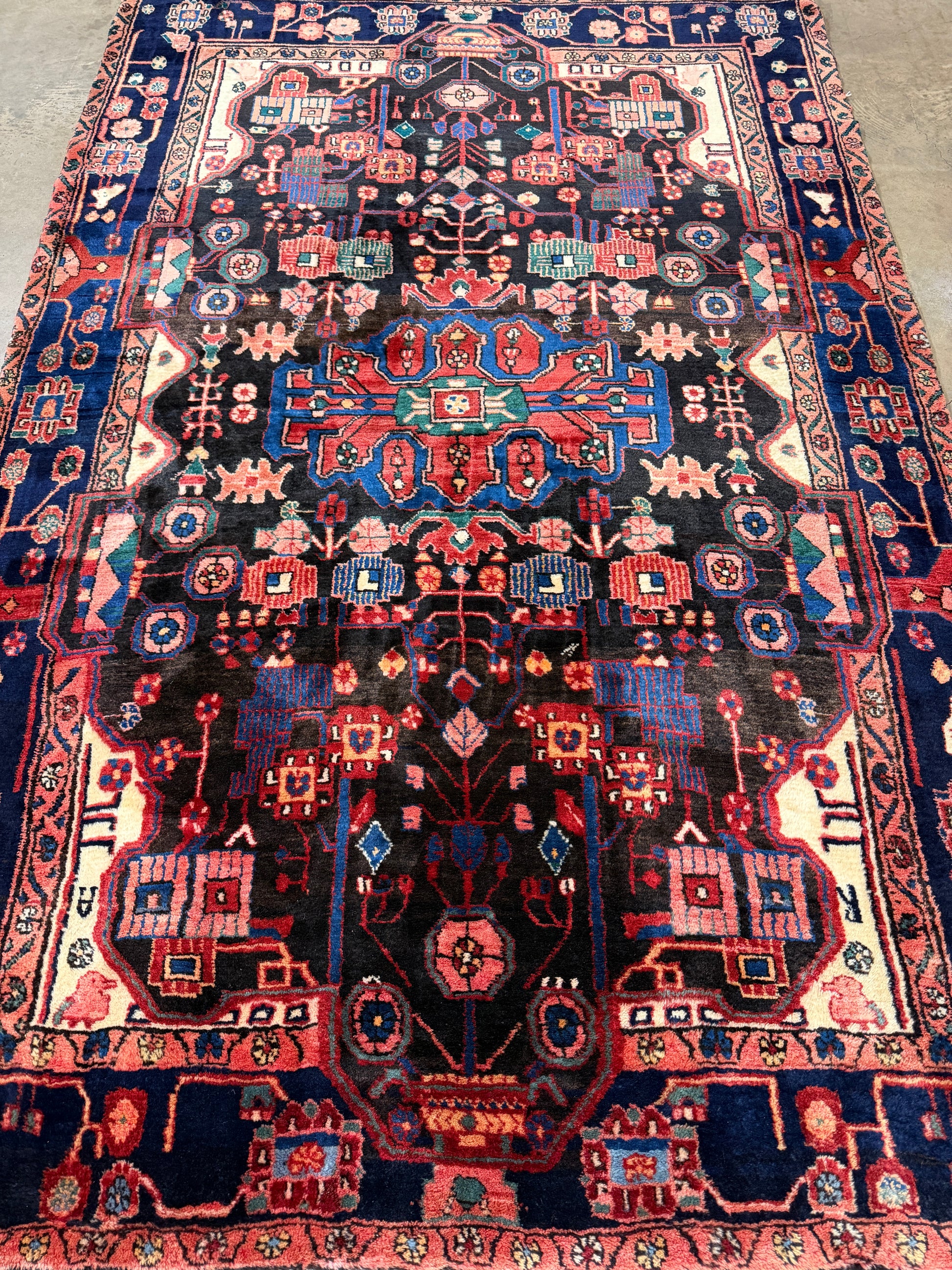 This 5’6” x 8’6” vintage Nahavand Persian rug is hand-knotted from wool, featuring bold tribal medallions and a rich palette of deep navy, red, and soft accent colors. A striking central motif anchors the design, surrounded by intricate geometric and floral patterns. A handmade Nahavand rug, measuring 5x8, showcases traditional tribal artistry with a dramatic central medallion and layered borders. Its hand-knotted wool construction and vibrant hues of crimson, indigo, and cream bring warmth and character to any space. This vintage 5’6” x 8’6” Persian Nahavand rug combines durable hand-knotted wool with classic geometric and floral tribal motifs. The balanced medallion design and harmonious color scheme highlight the skilled craftsmanship of northwestern Iran. A 5x8 hand-knotted Nahavand rug, this vintage wool piece carries a bold tribal character with deep navy and red tones accented by soft pastels. Its intricate medallion and border work reflect generations of Persian weaving tradition.