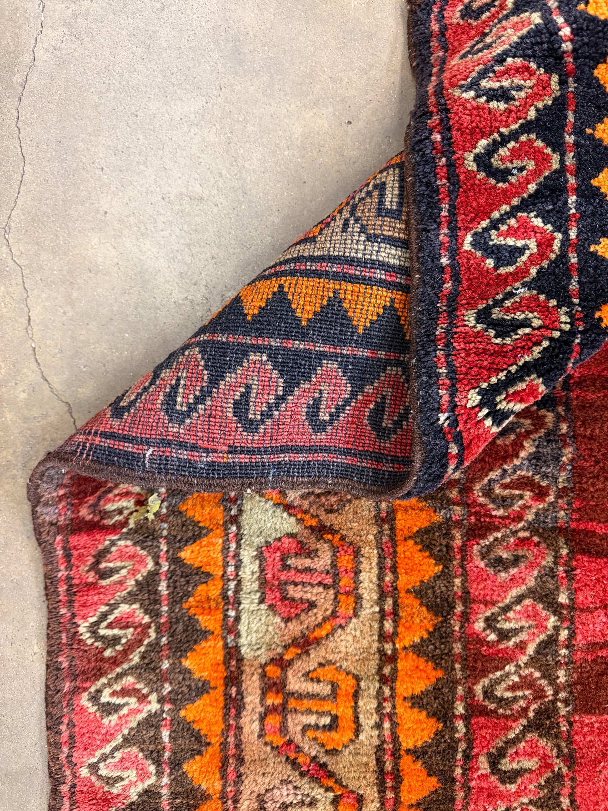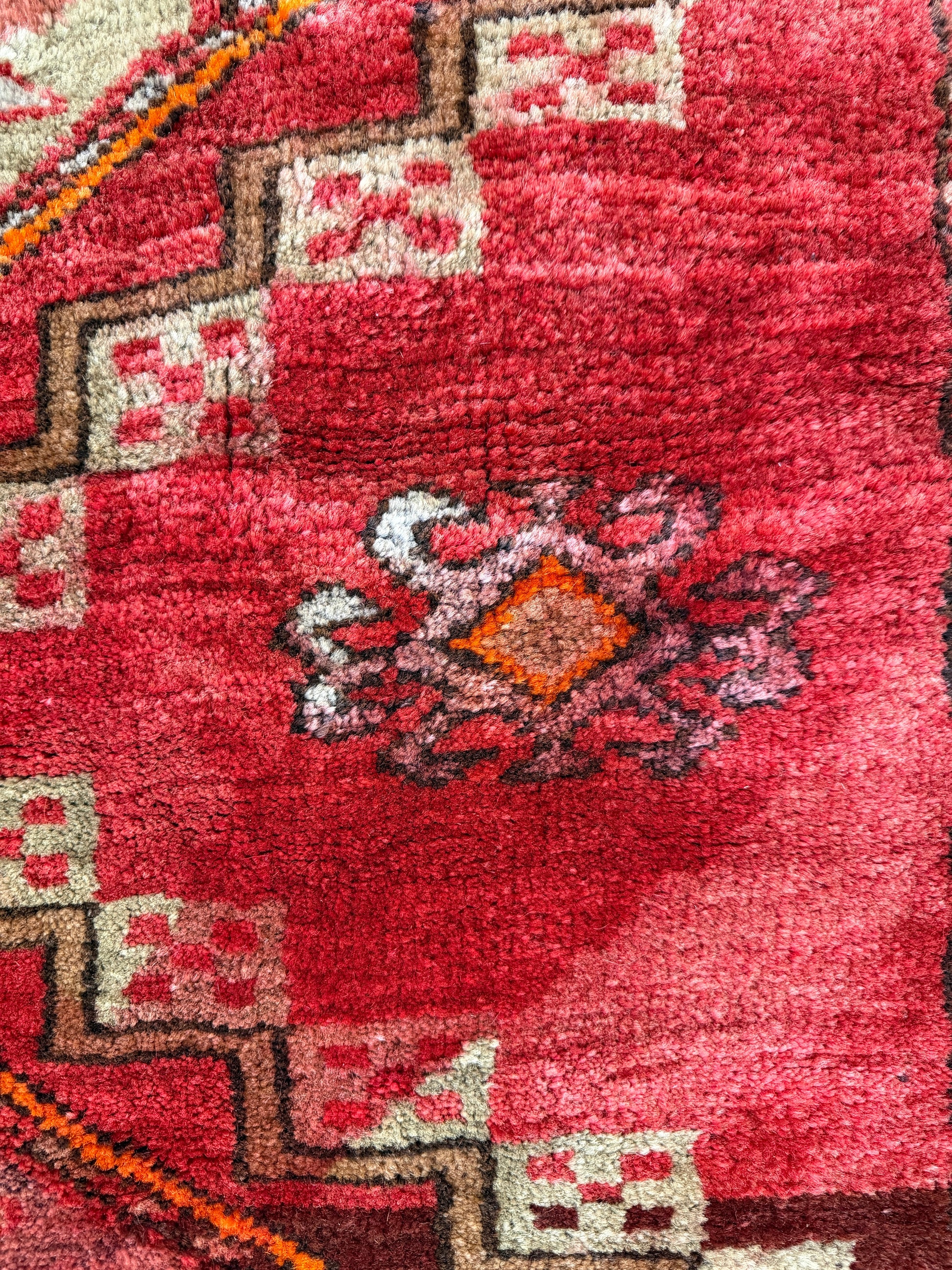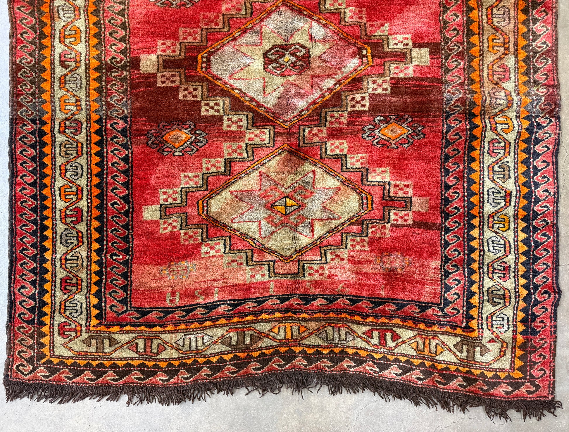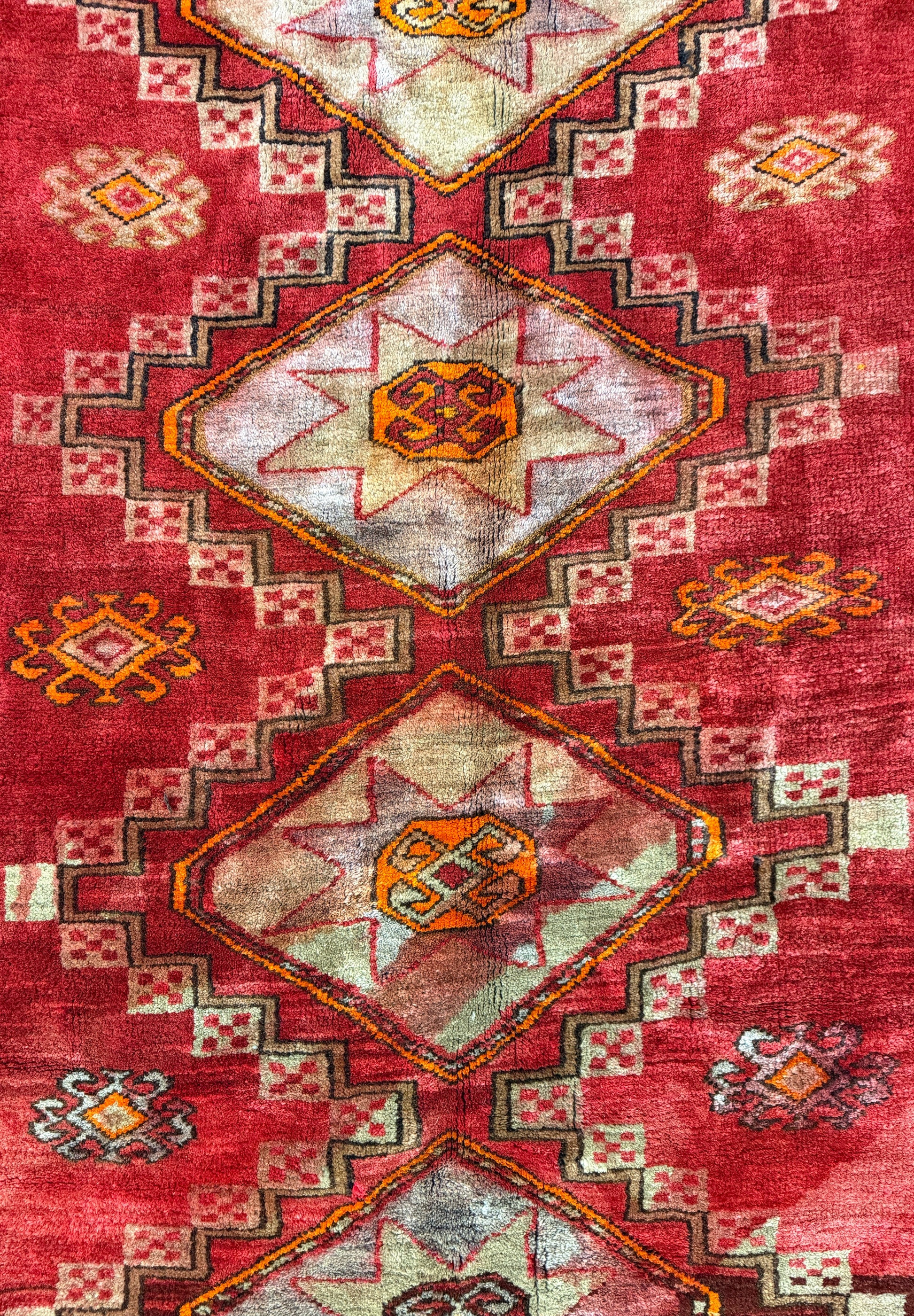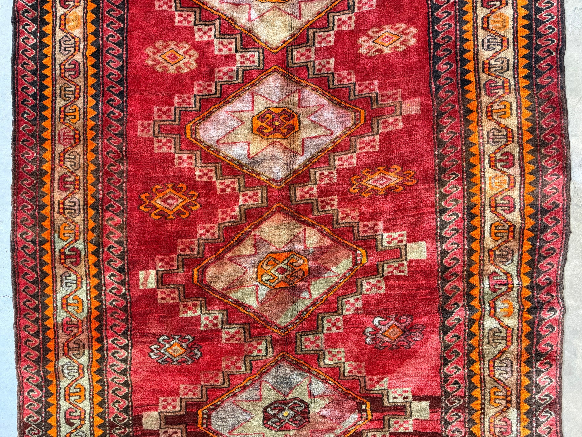 This 5’7” x 10’7” antique hand-knotted Russian Kazak rug is a striking example of traditional Caucasian craftsmanship. Woven entirely from wool, it features a vibrant red field adorned with a series of diamond medallions running along the center, framed by intricate geometric borders. The natural vegetable dyes have aged gracefully, giving the rug a rich, time-softened palette of crimson, ivory, gold, and deep indigo.