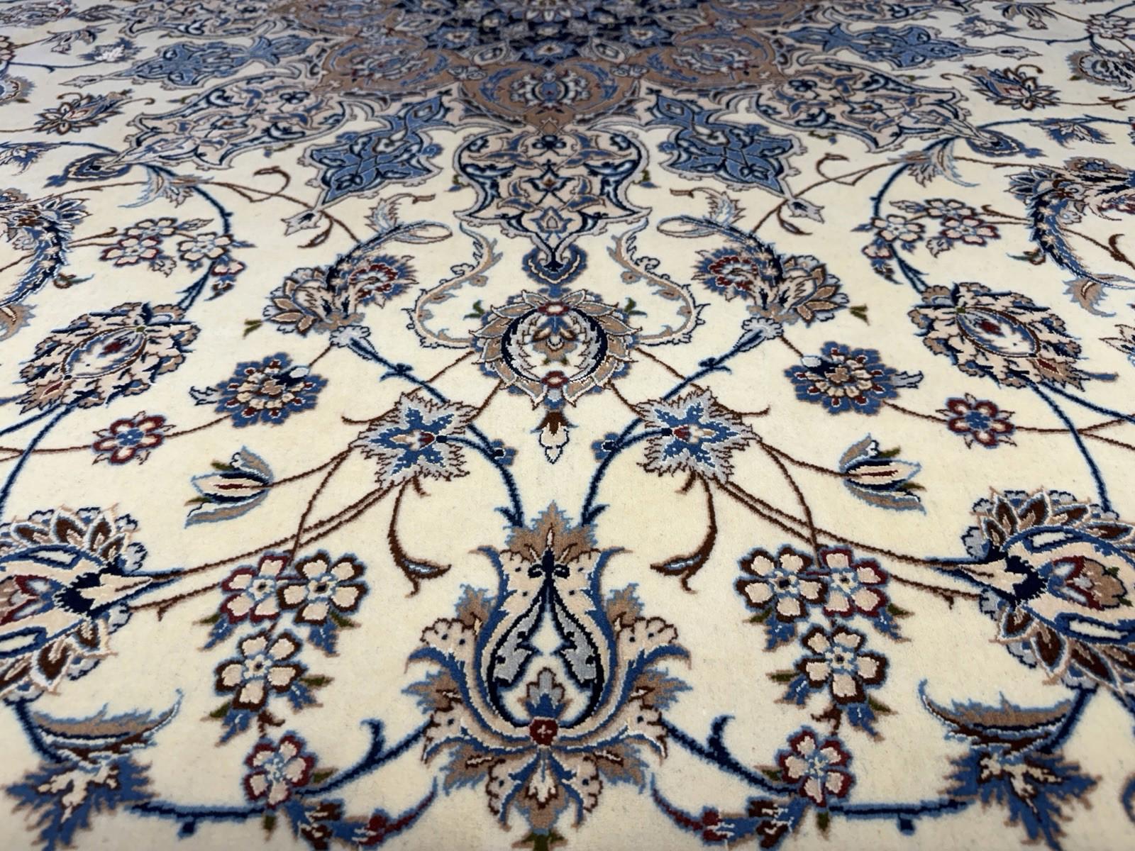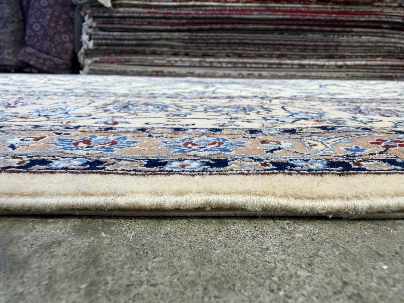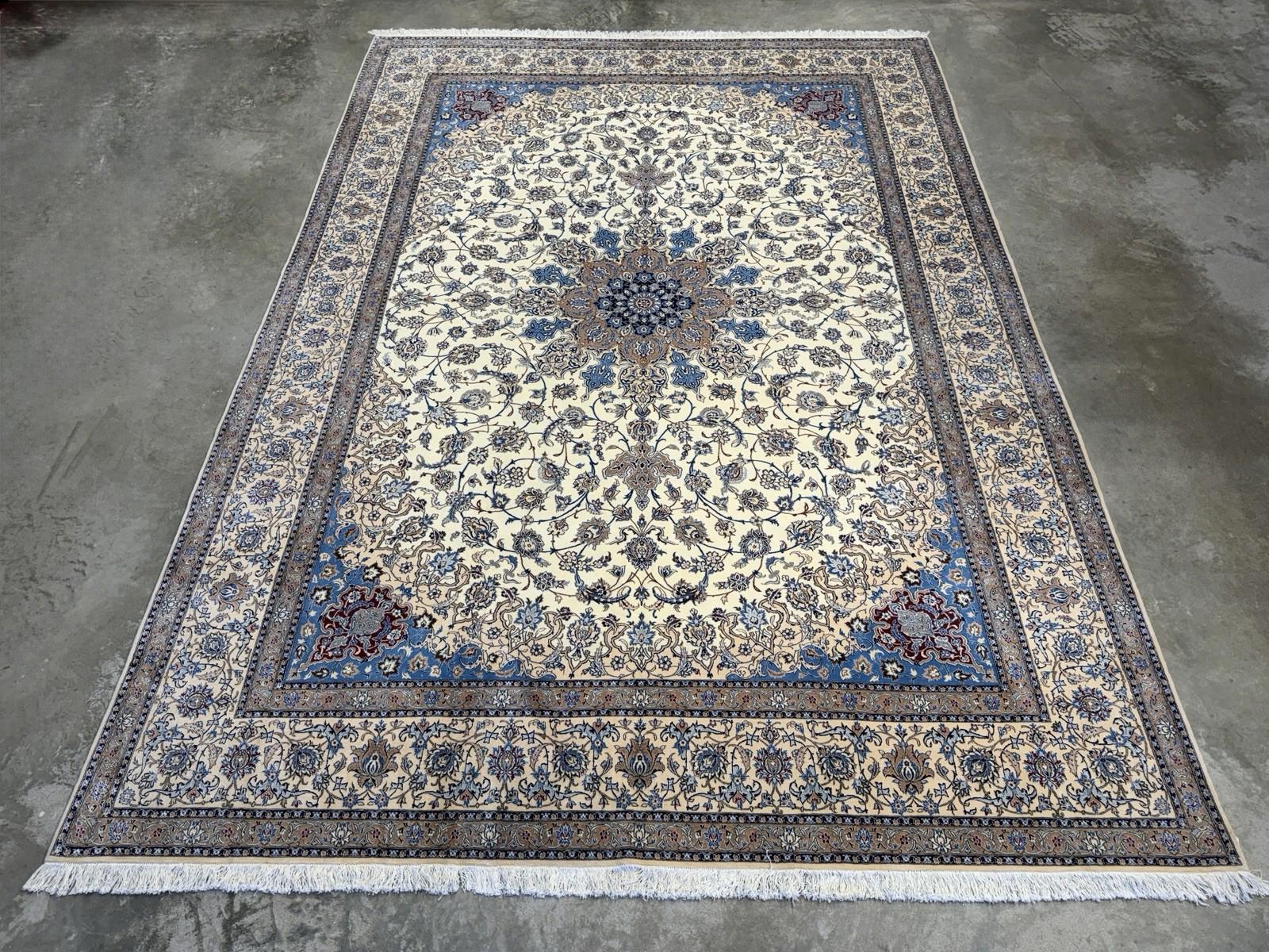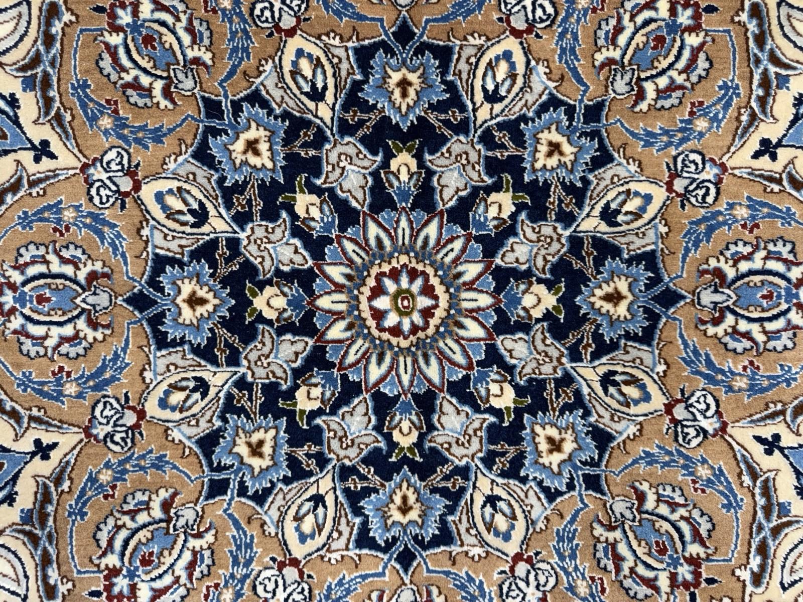 This 8'7" x 12'1" Hand-Knotted Wool & Silk Nain Habibian Area Rug is a traditional, handmade carpet featuring a medallion pattern in beige, brown, and blue colors. The rug is crafted with a wool blend and silk blend material, making it durable, wear-resistant, and moth-resistant. Its pile height is low, and it is suitable for floor heating and is washable, making it a low maintenance option. The rug is perfect for various rooms in the home, such as the bedroom, living room, or hallway, and it adds a touch of elegance and style to any space with its unique design and color palette.