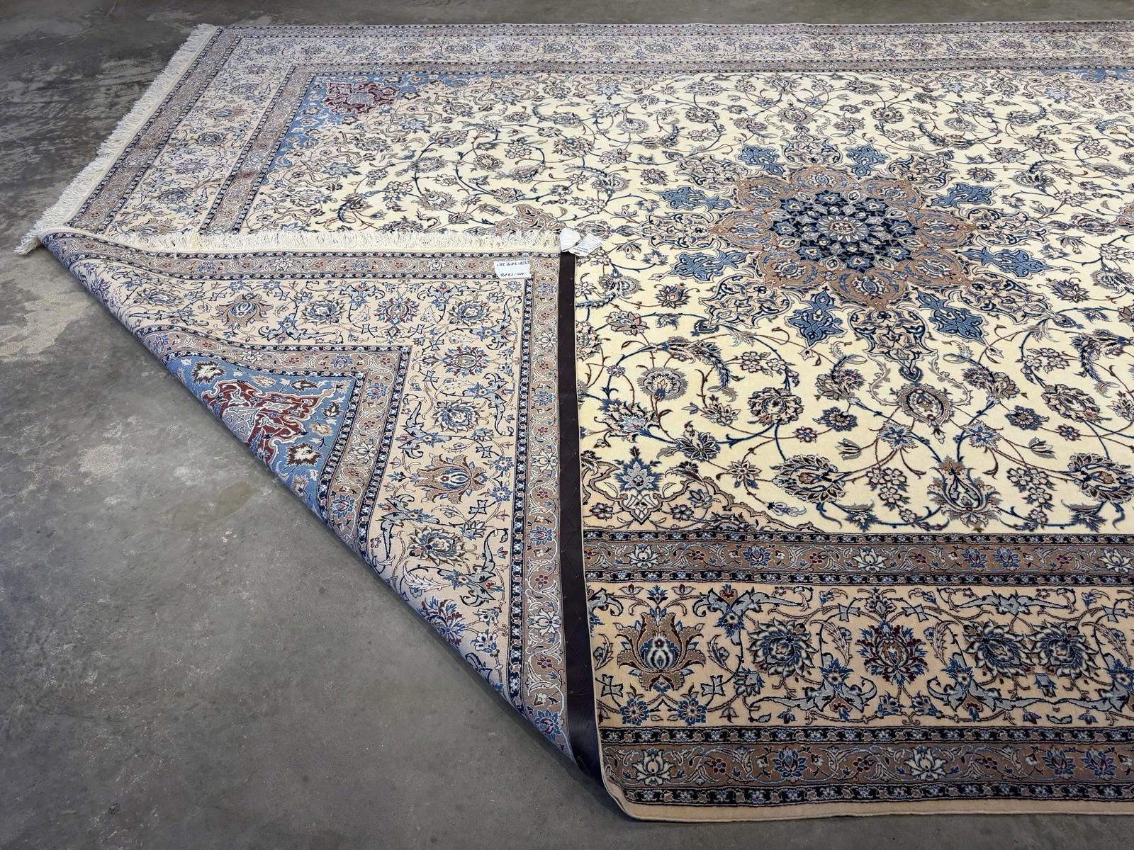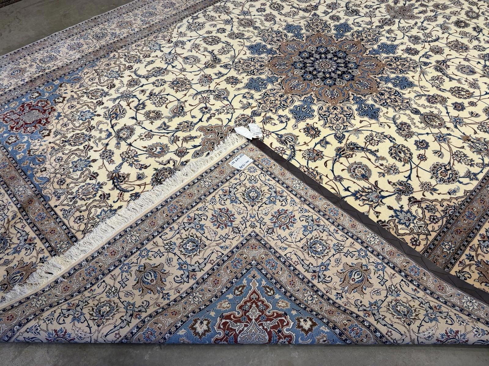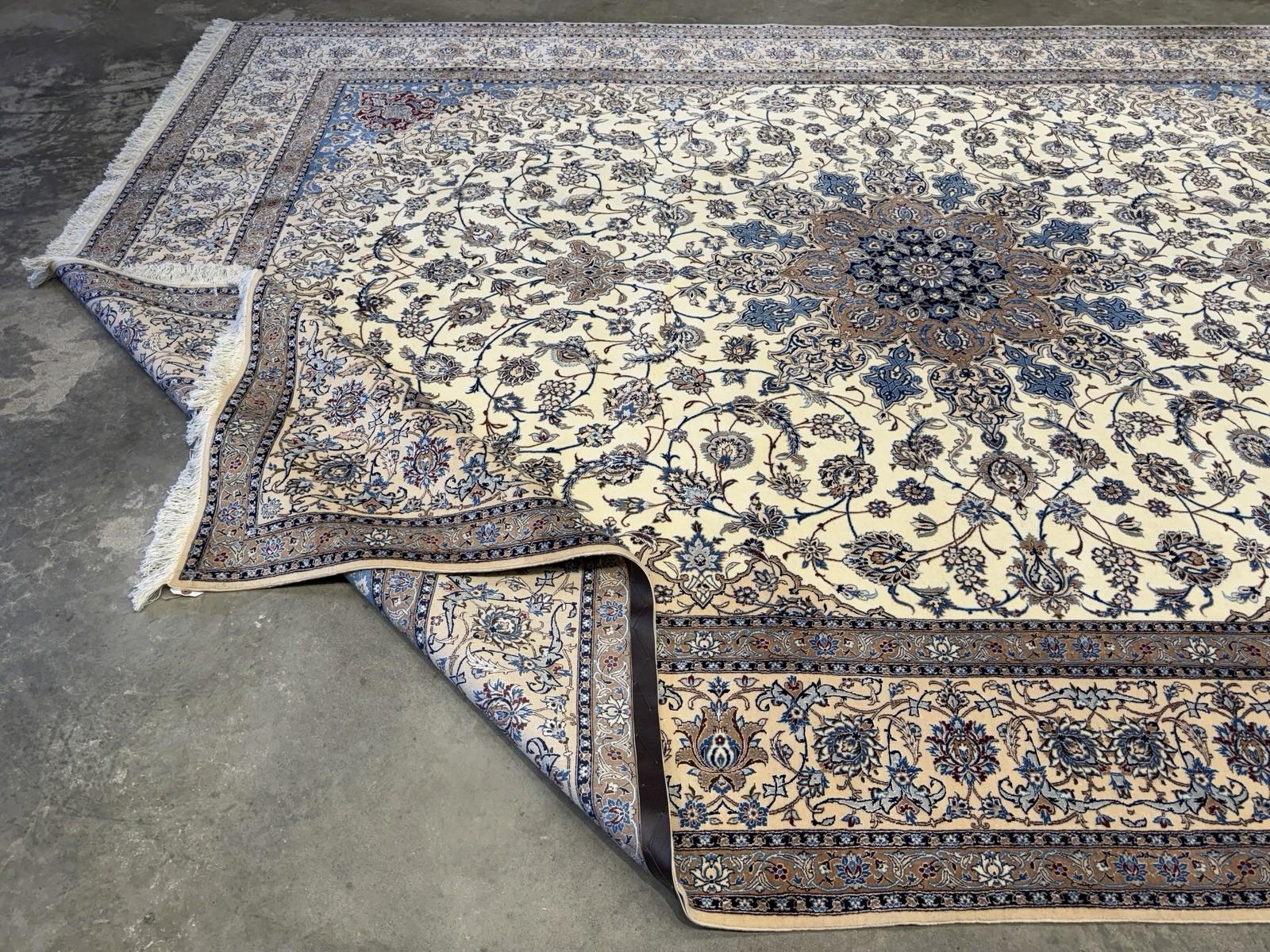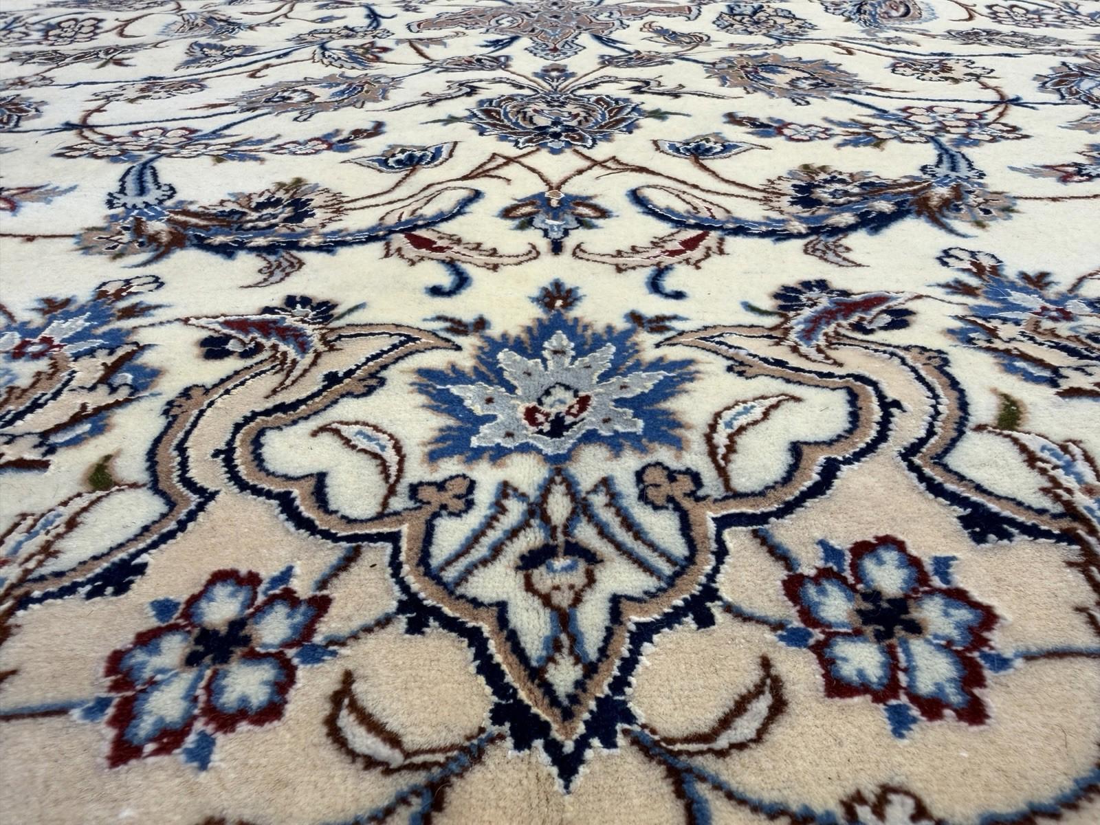 This 8'7" x 12'1" Hand-Knotted Wool & Silk Nain Habibian Area Rug is a traditional, handmade carpet featuring a medallion pattern in beige, brown, and blue colors. The rug is crafted with a wool blend and silk blend material, making it durable, wear-resistant, and moth-resistant. Its pile height is low, and it is suitable for floor heating and is washable, making it a low maintenance option. The rug is perfect for various rooms in the home, such as the bedroom, living room, or hallway, and it adds a touch of elegance and style to any space with its unique design and color palette.