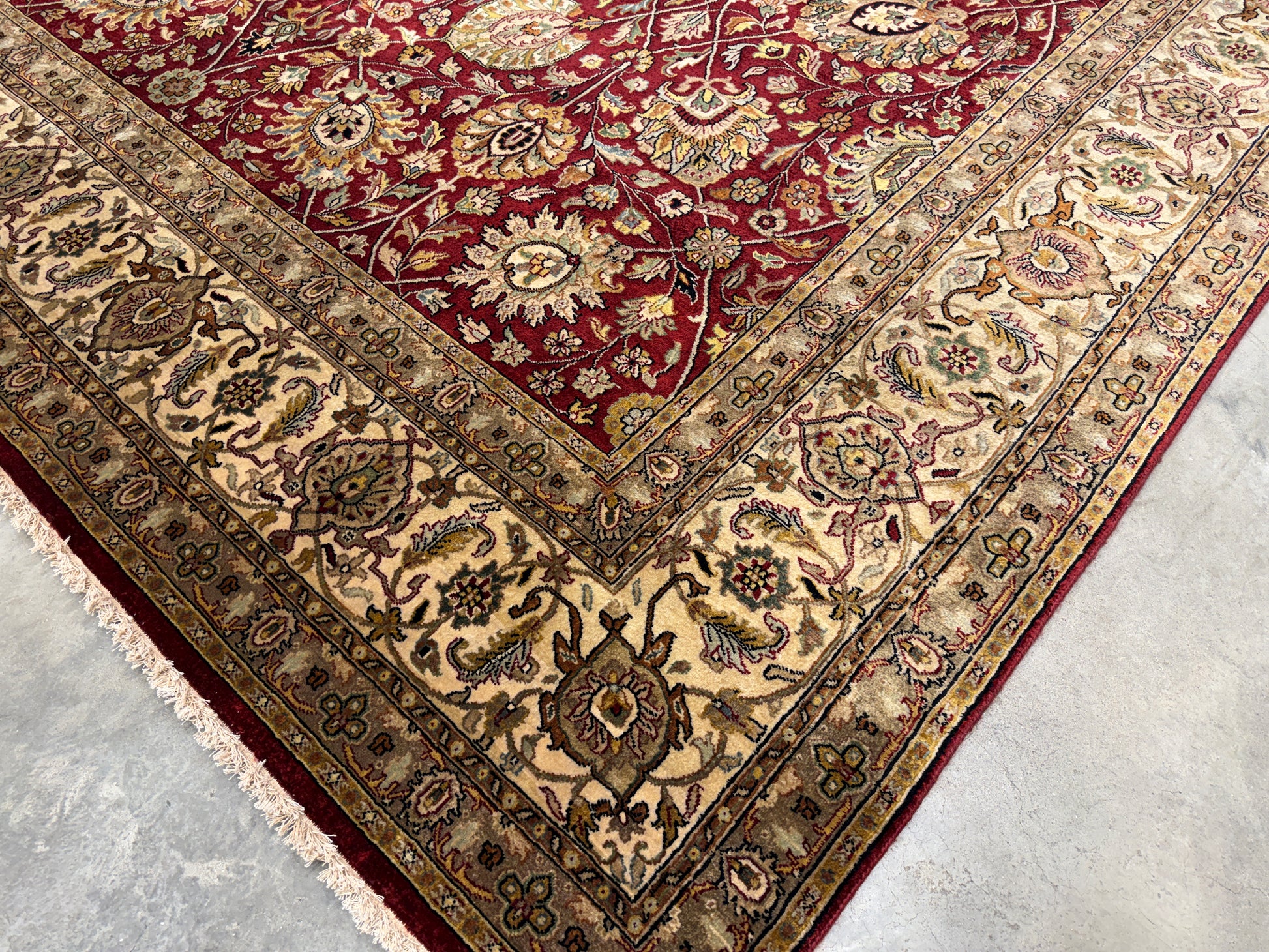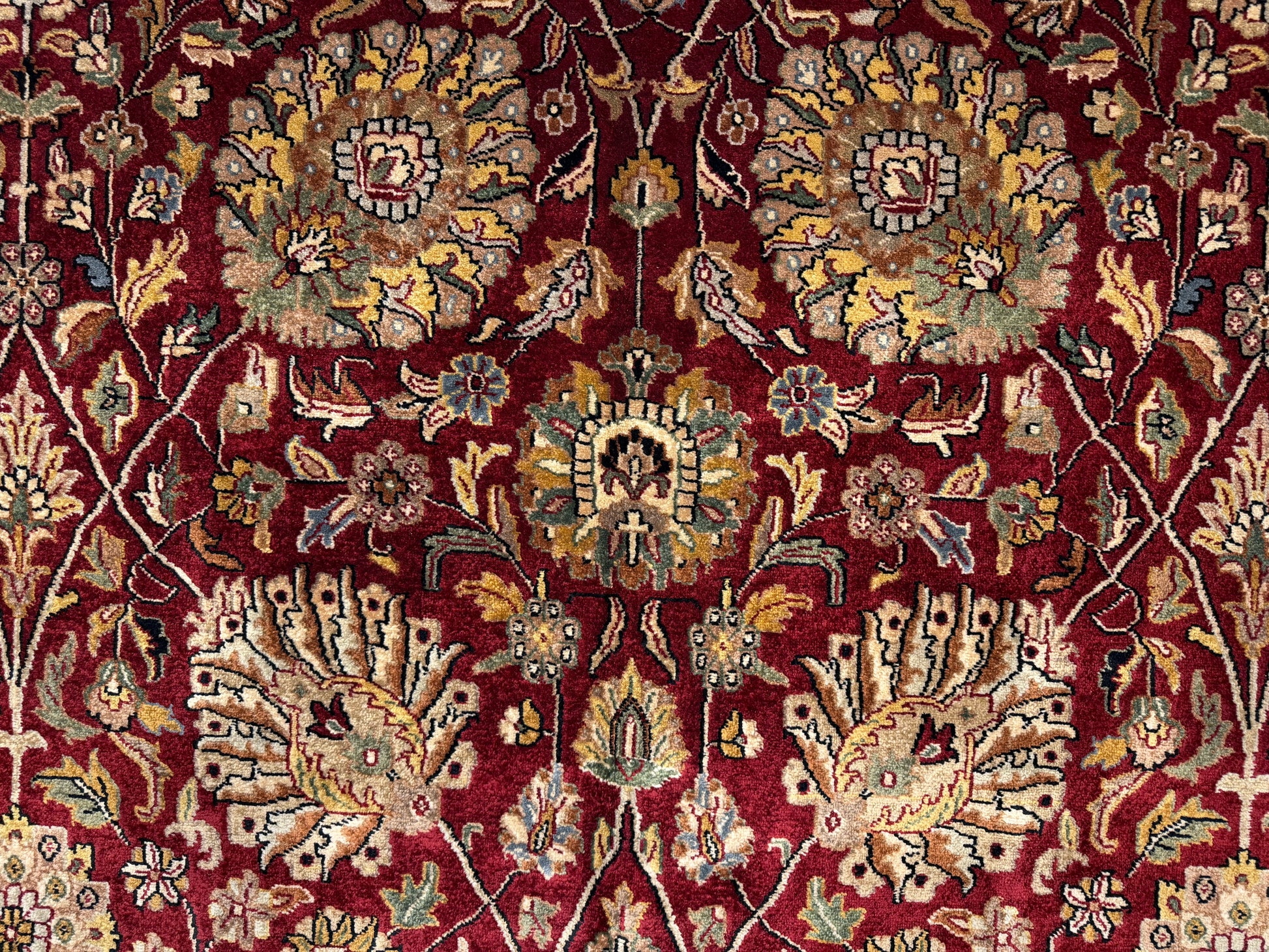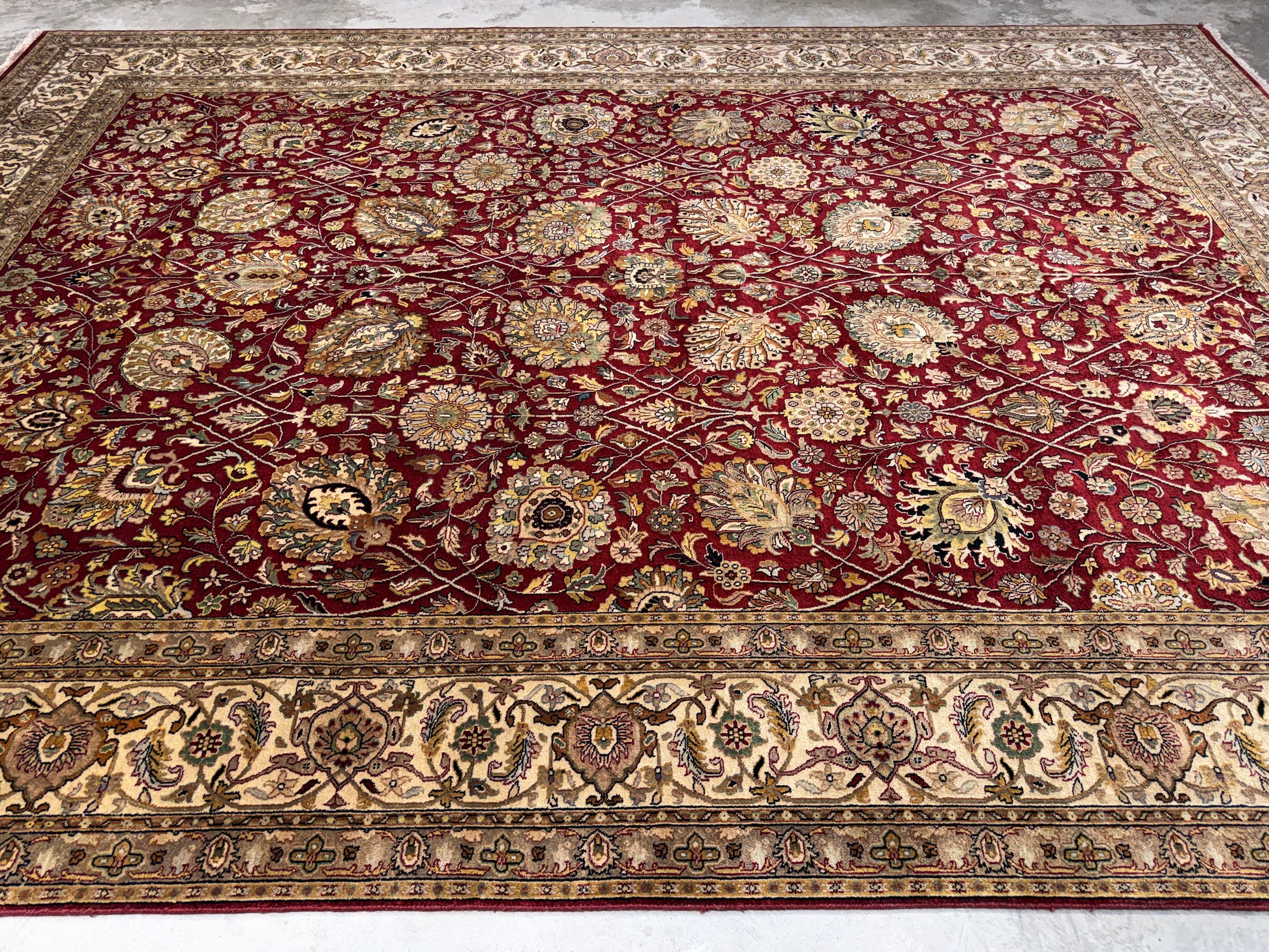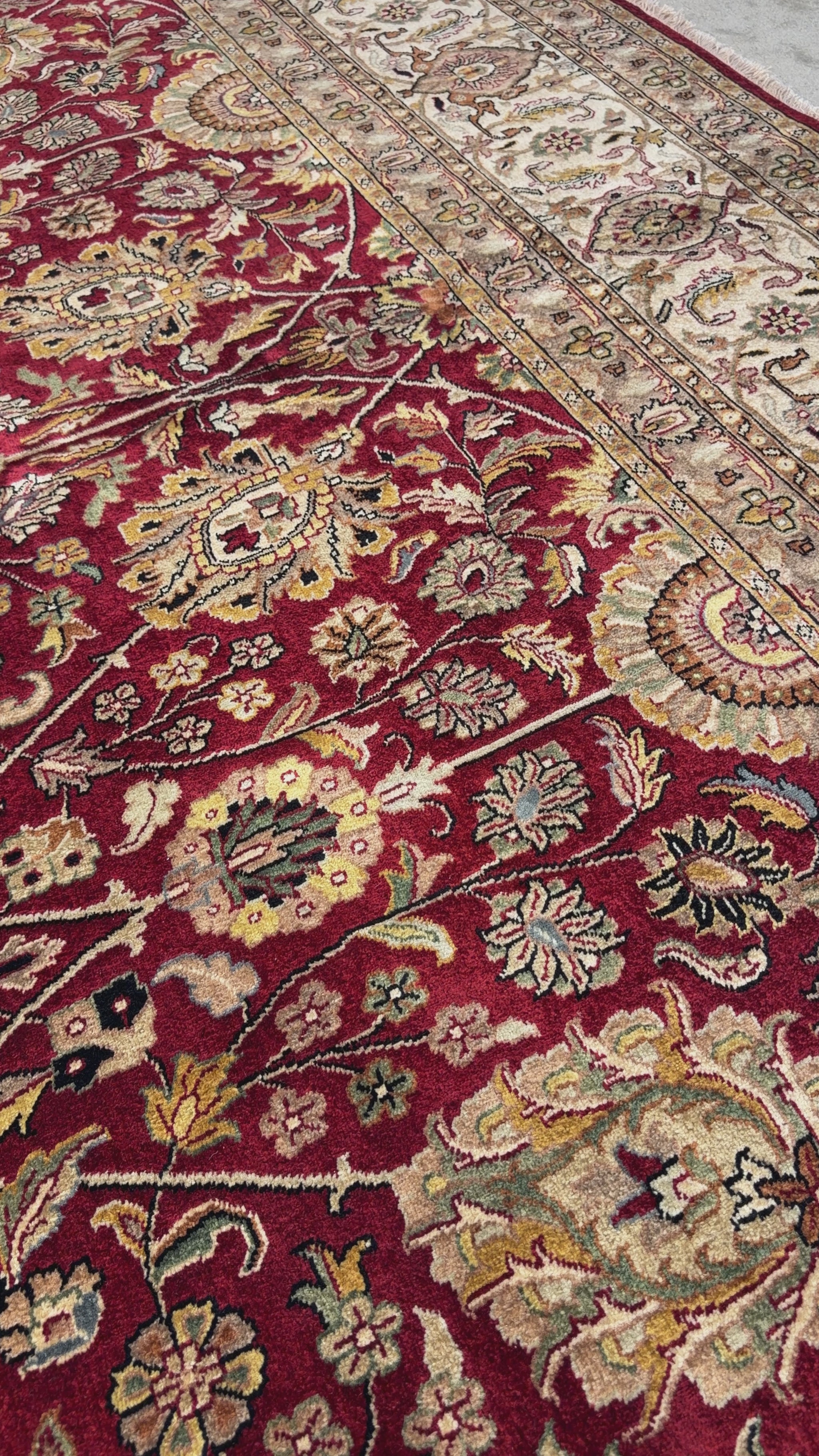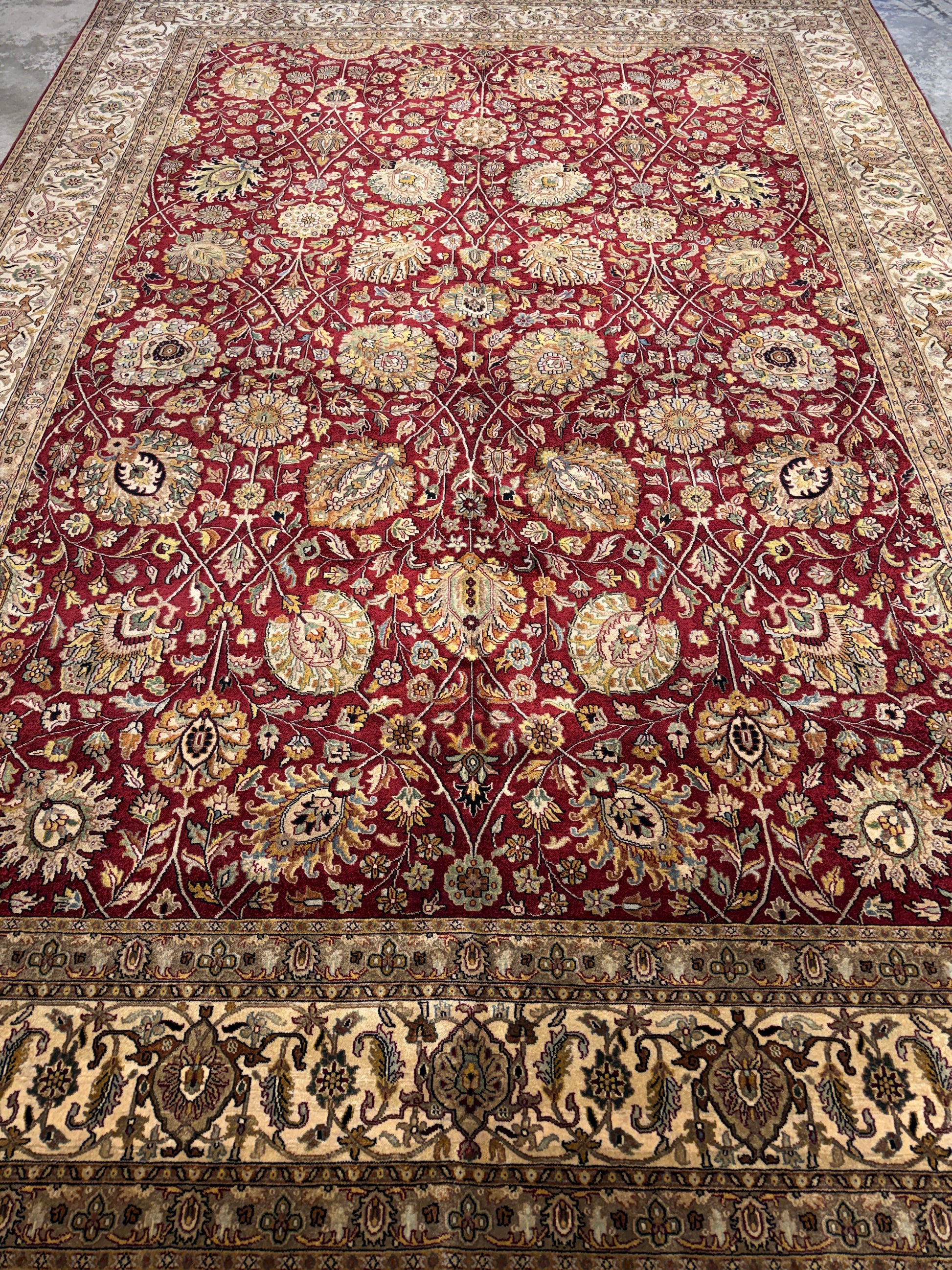 This 11’6” x 16’3” hand-knotted Persian Tabriz area rug is a magnificent example of traditional craftsmanship, featuring an exceptionally fine 60 Raj weave. Its intricate design centers around a balanced medallion motif, surrounded by an elaborate field of floral and vine patterns that flow seamlessly into a richly detailed border. The rug is woven from very fine wool, producing a soft, luxurious texture and a luminous sheen that enhances the depth of its colors. The rich reds, ivories, and accent tones are achieved through natural dyes, giving the piece both vibrancy and enduring beauty.