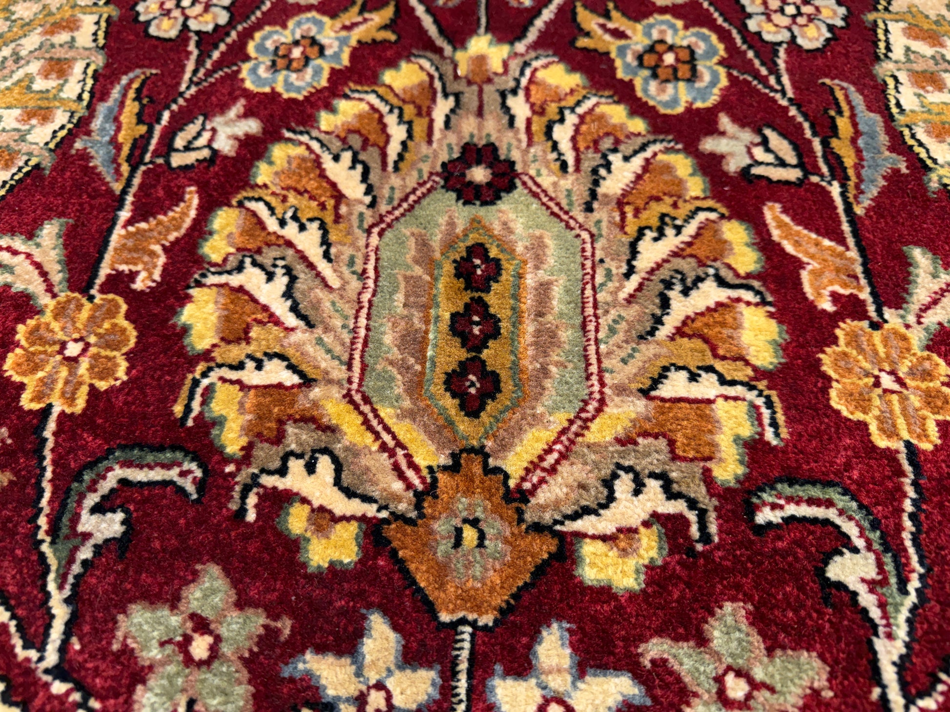 Tabriz rugs are celebrated for their precision and elegance, and this very fine example reflects the legacy of one of Persia’s most renowned weaving centers. The 60 Raj knot density allows for remarkable clarity in the detailed arabesques and motifs, making it as much a work of art as a functional floor covering. Ideal for a formal living space, dining room, or grand foyer, this rug embodies the harmony and sophistication of classic Persian design while offering durability and timeless appeal.