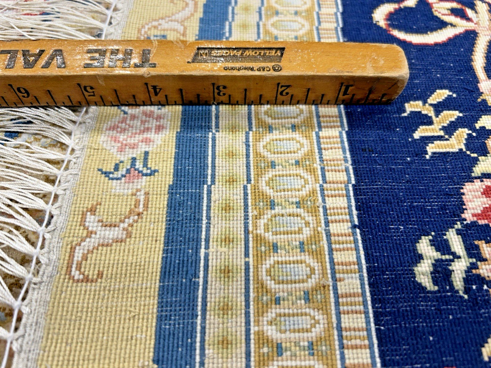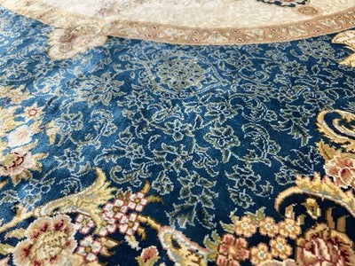 Add luxury and elegance to your home with this hand-knotted round area rug, featuring a traditional medallion pattern in a rich blue tone. Handmade from 100% silk with a low pile height and standard pile type, this one-of-a-kind piece offers both visual sophistication and practical durability—perfect for high-traffic areas like living rooms and bedrooms.