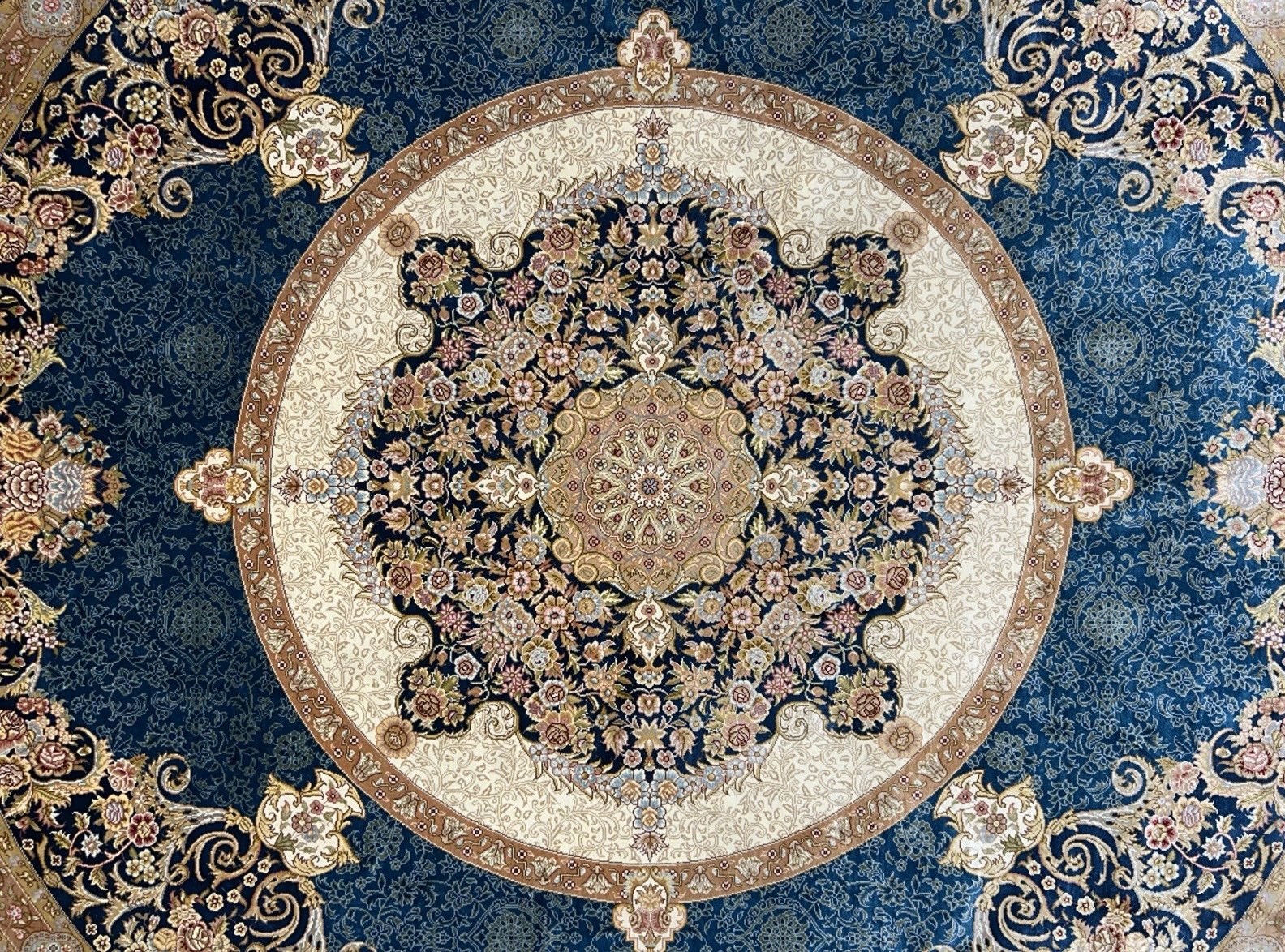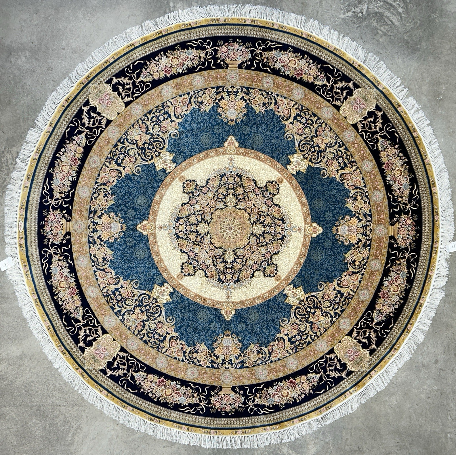 8' Round Hand-Knotted Silk Rug – Blue Medallion Design
