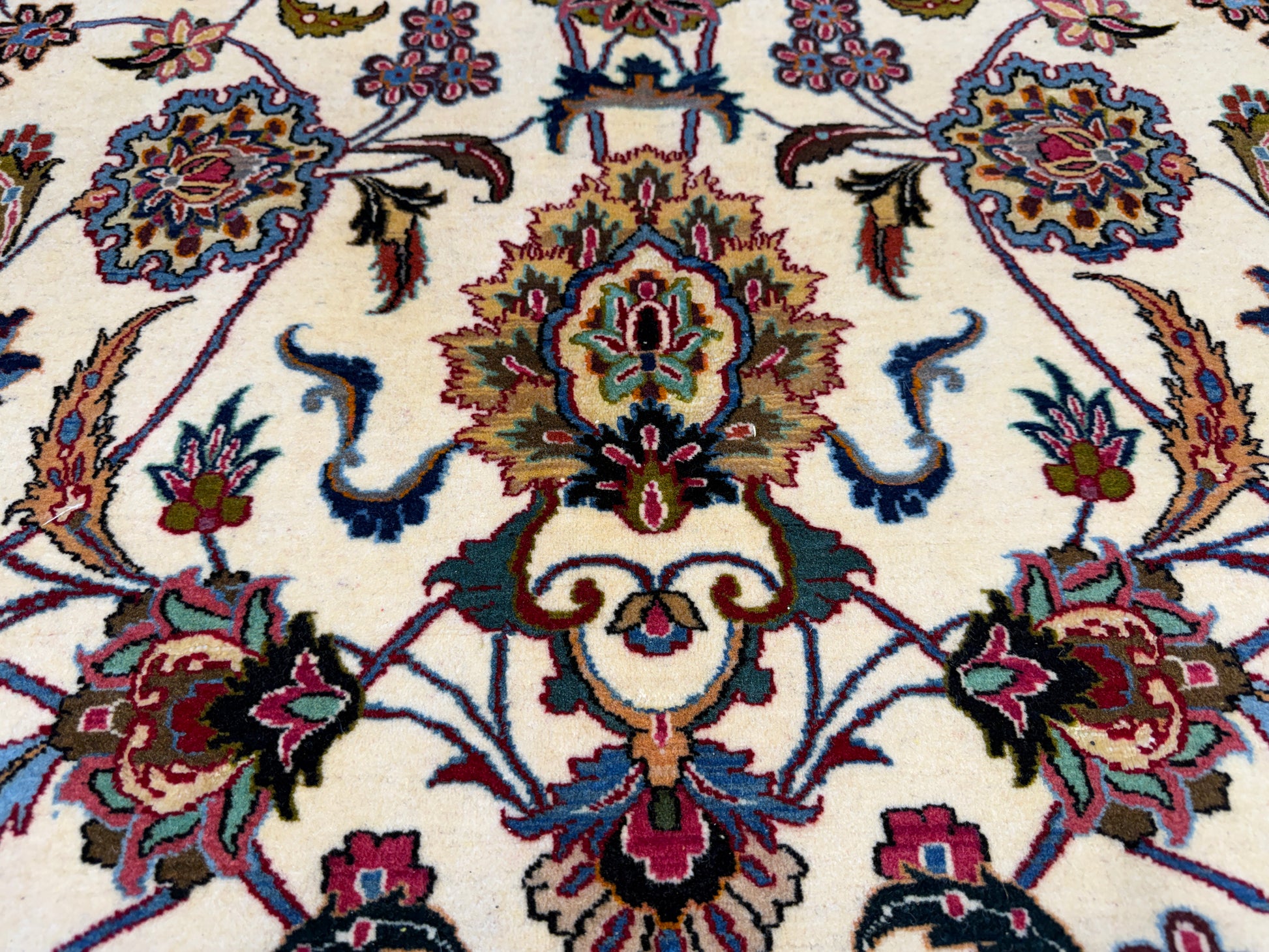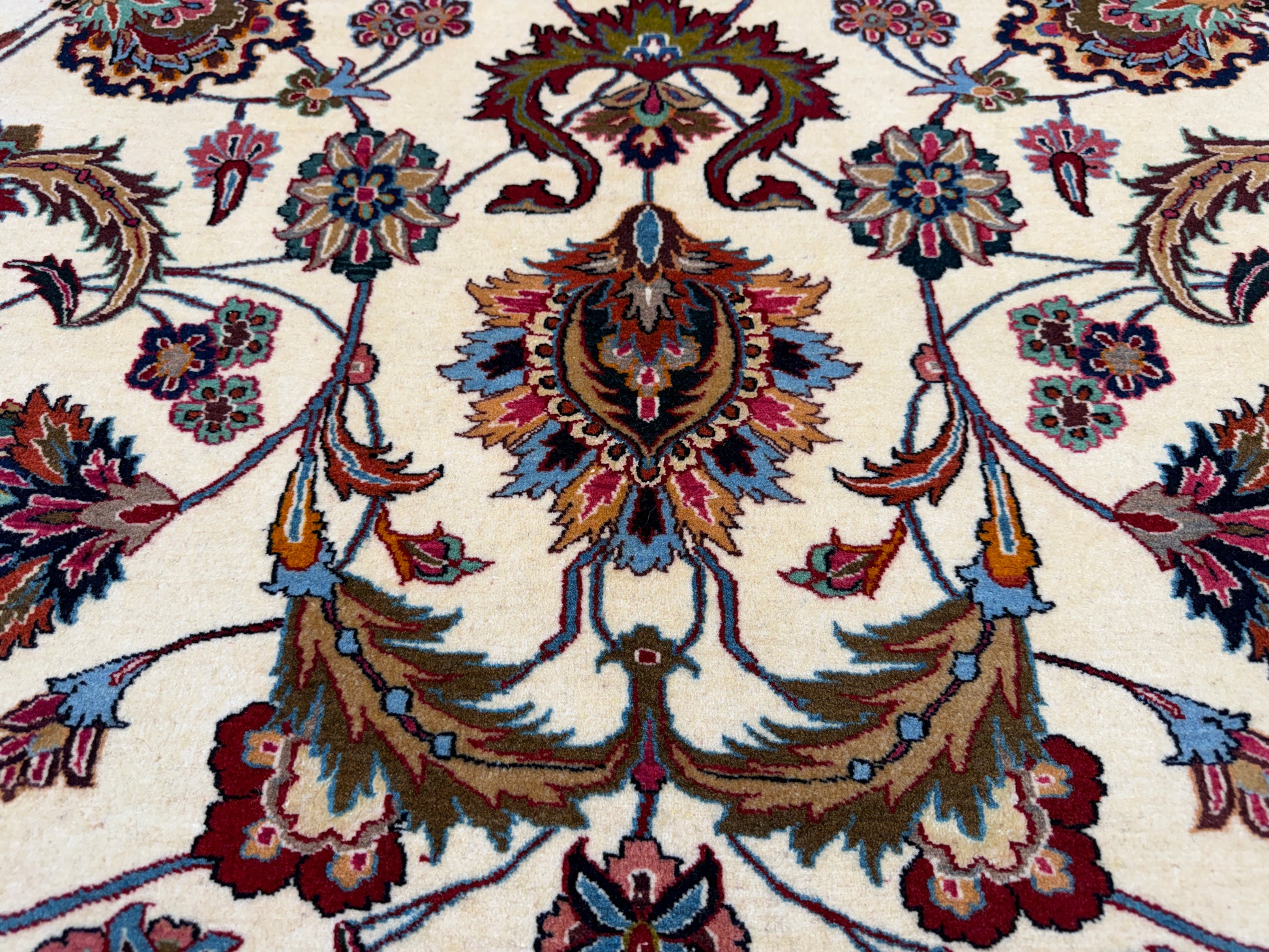 Handwoven from premium wool with silk highlights, this Tabriz rug combines durability with timeless elegance, making it a stunning addition to both traditional and transitional interiors. Measuring 10 feet by 13 feet 6 inches, it provides substantial coverage for a formal living room, dining room, or master suite. Its quality and artistry make it not only a functional floor covering but also a collectible piece of Persian textile art.