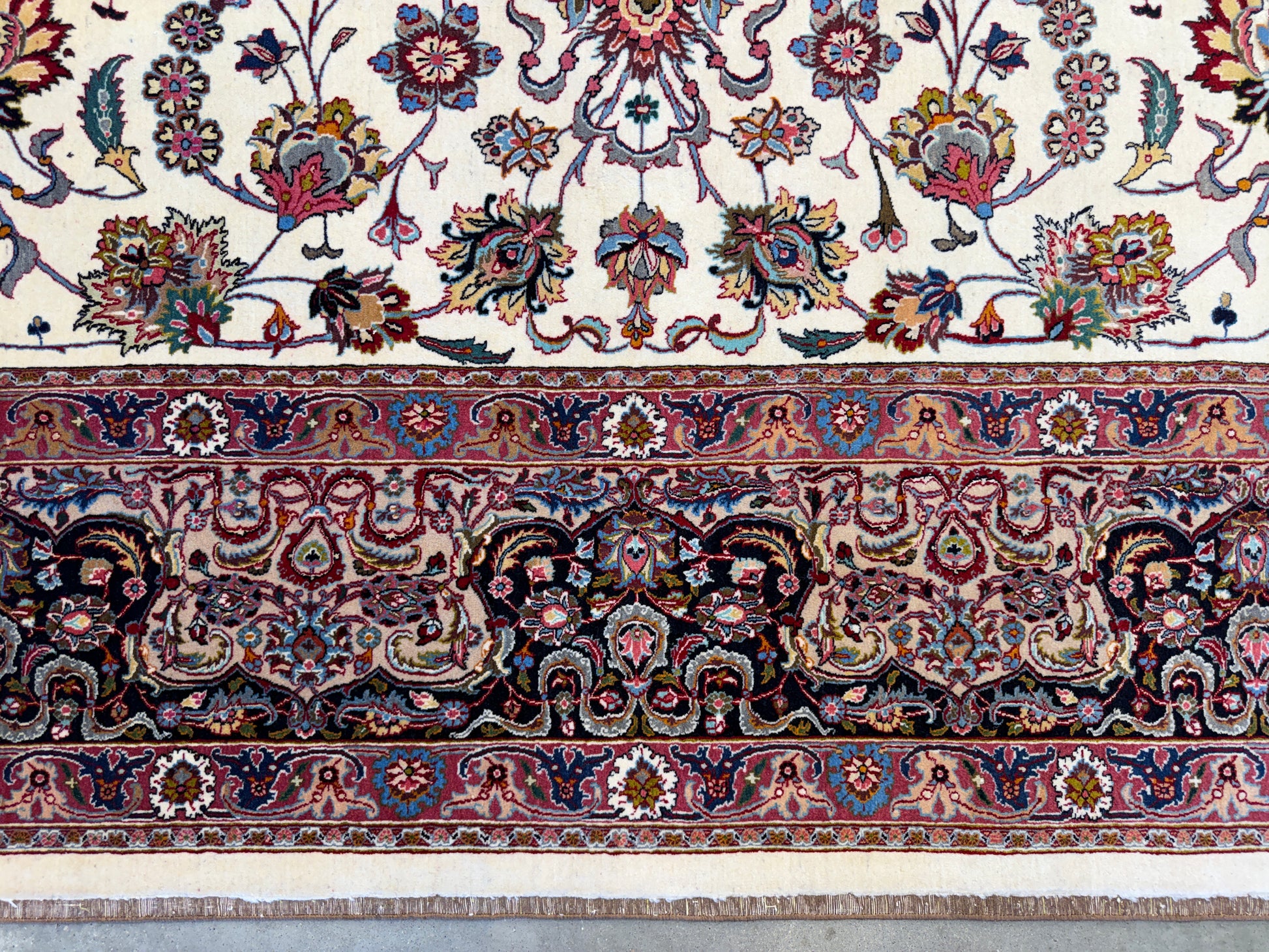 This 10’ x 13’6” Very Fine Hand-Knotted Persian Tabriz 80 Raj Area Rug exemplifies the renowned craftsmanship of Tabriz weaving. Featuring an intricate central medallion surrounded by a field of delicate floral motifs, this rug offers a harmonious palette of soft ivory, blush, and muted coral tones accented with subtle blues and greens. The 80 Raj knot density ensures an exceptionally fine weave, allowing for highly detailed patterns and a smooth, luxurious texture underfoot.