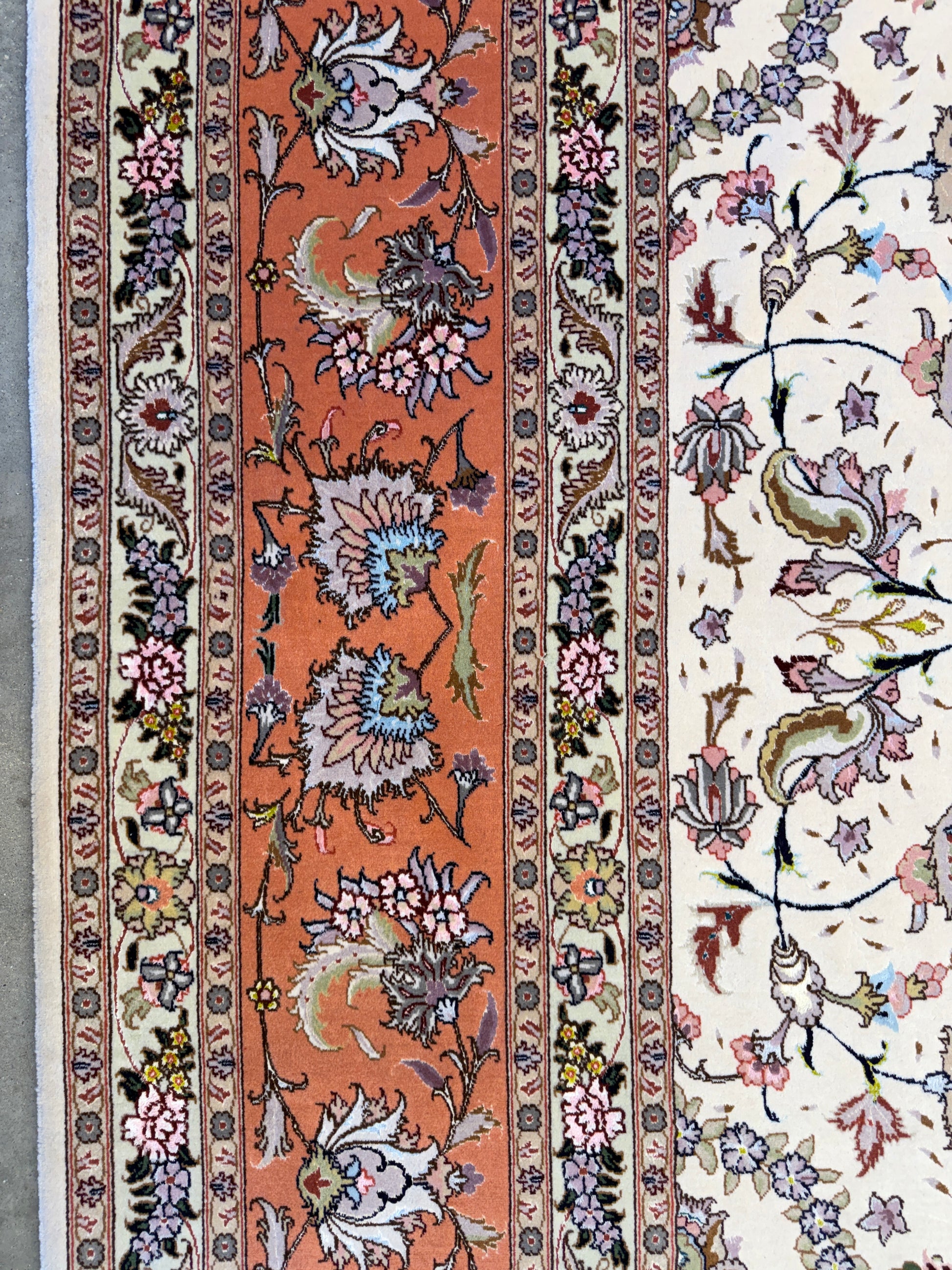 This 9’8” x 13’8” hand-knotted Persian Tabriz 80 Raj area rug is a masterpiece of traditional craftsmanship. Woven with an exceptionally high knot density, the 80 Raj construction allows for precise detailing, resulting in an intricate central medallion framed by flowing floral motifs. Its soft ivory field provides a striking contrast to the rich palette of reds, blues, and subtle earth tones that are characteristic of Tabriz designs, making it a timeless centerpiece for any formal living or dining area.