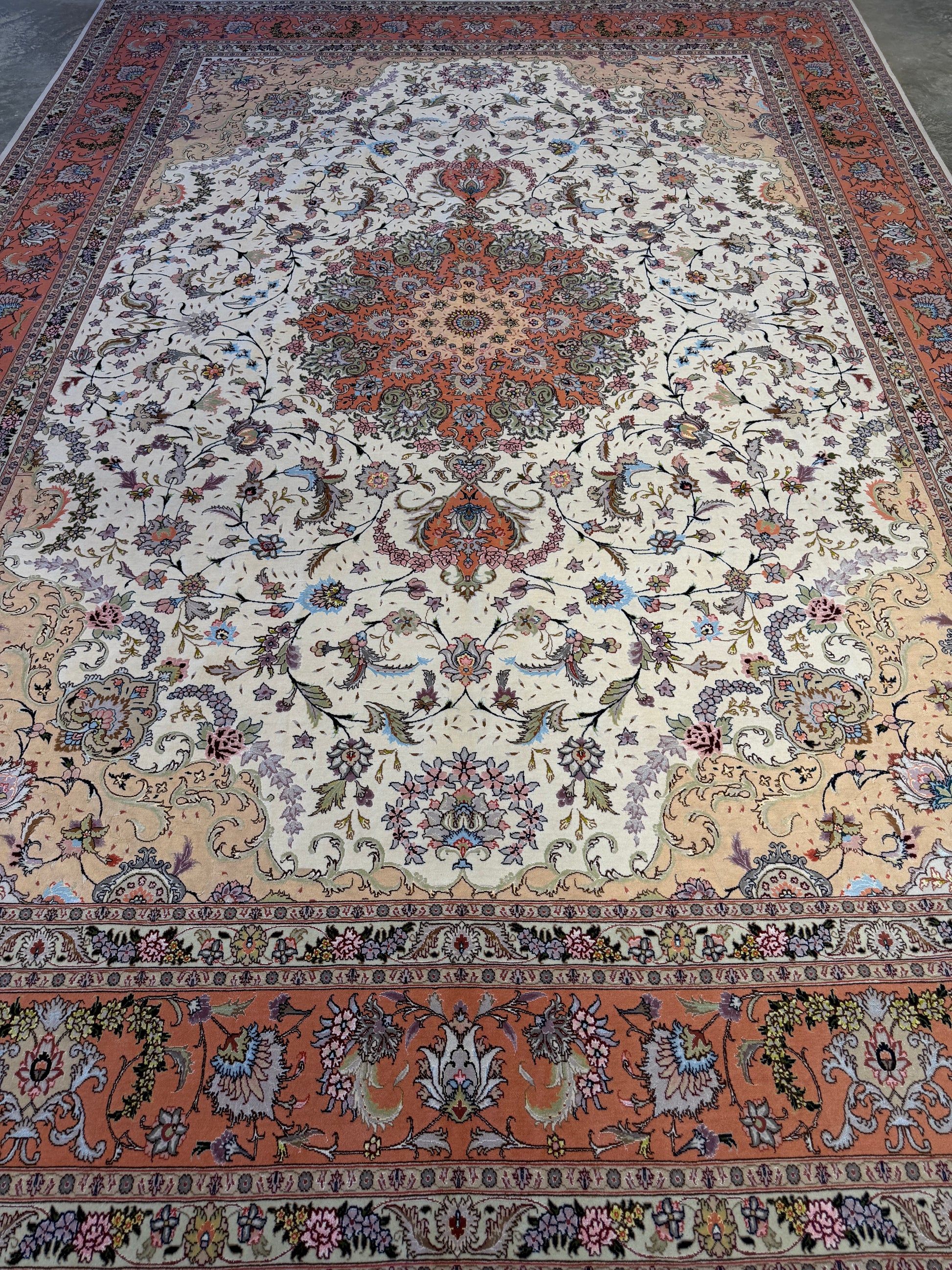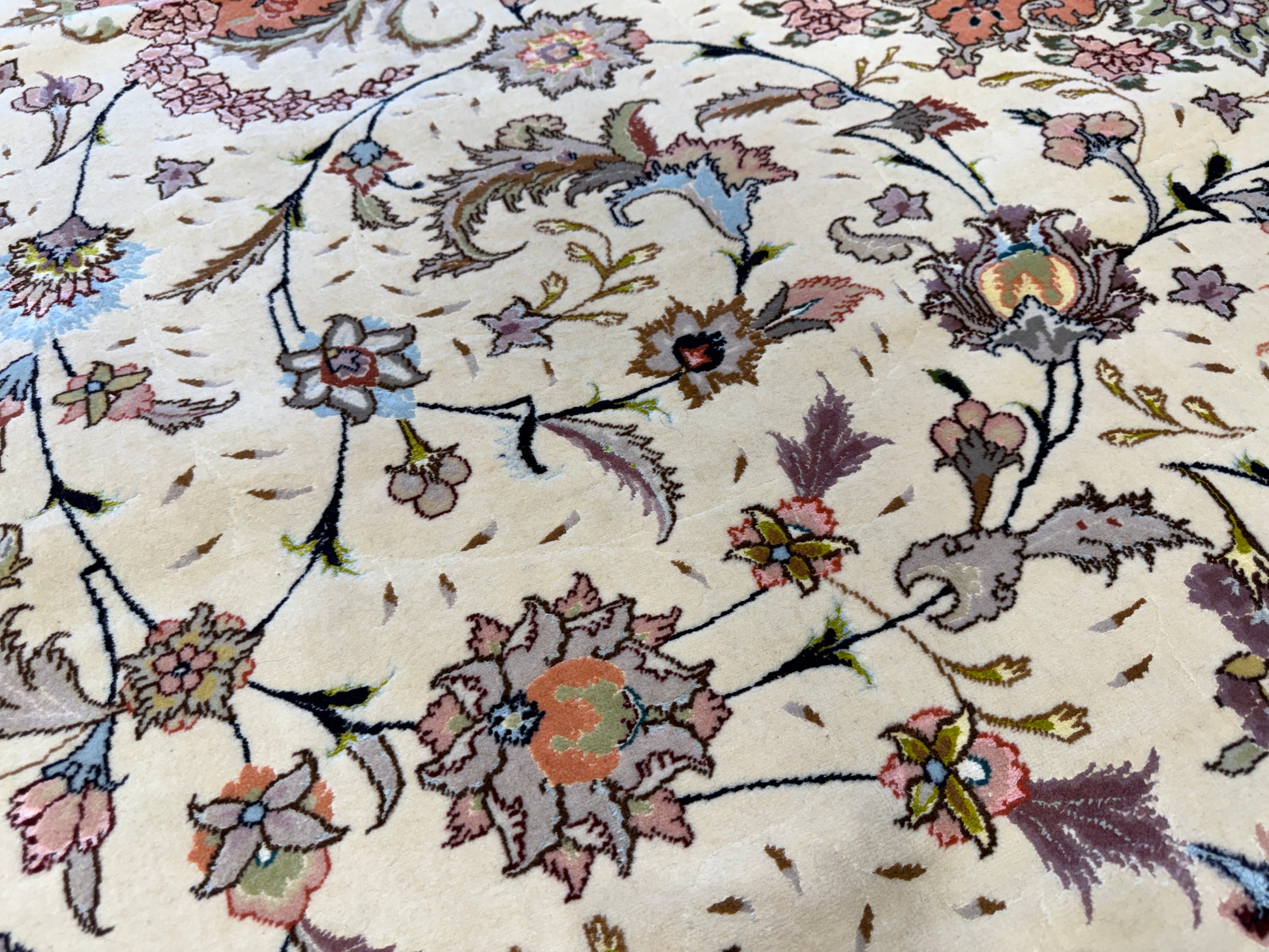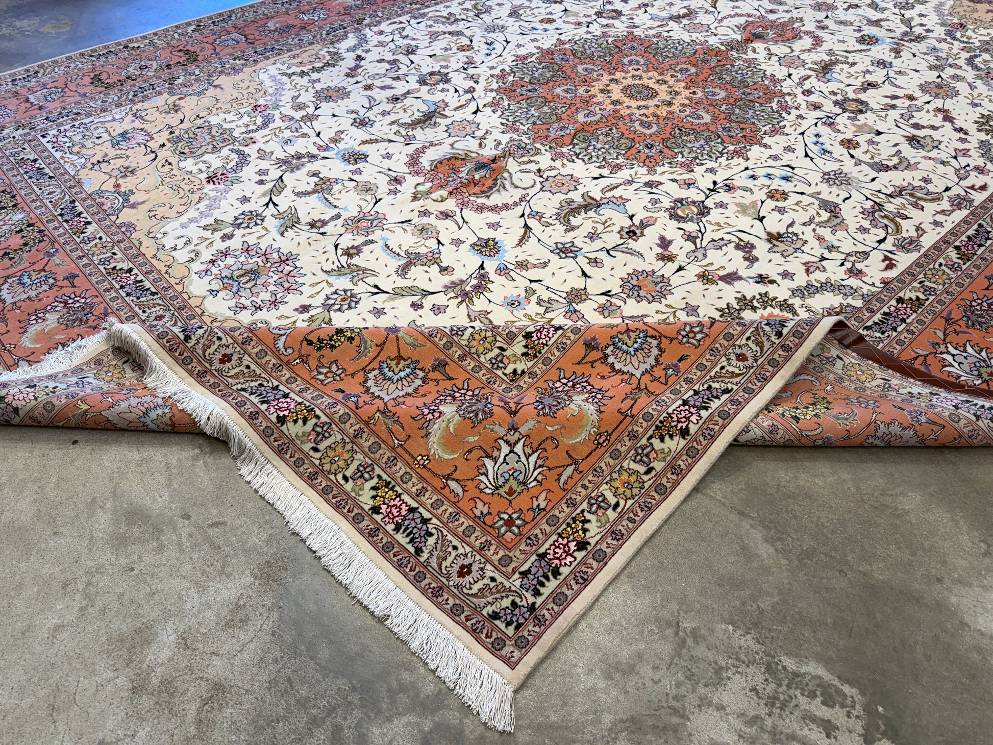 Crafted from the finest wool and silk, this rug offers both durability and a luxurious sheen that enhances its elaborate pattern. Measuring nearly 10 by 14 feet, it is perfectly suited for larger spaces where its artistry can be fully appreciated. Collectors and décor enthusiasts alike will value its combination of elegance, traditional Persian heritage, and exceptional quality, ensuring it remains a prized statement piece for generations.