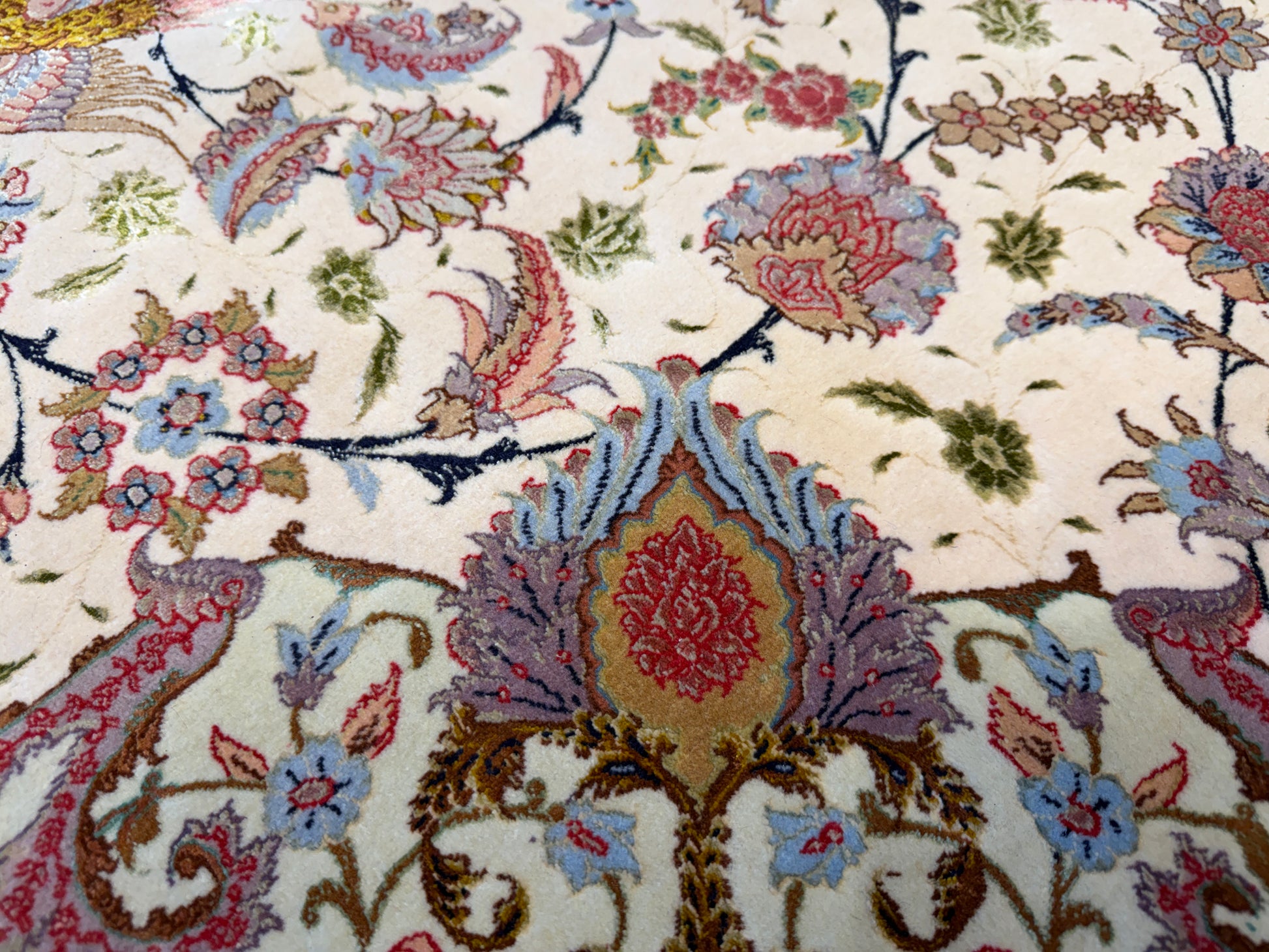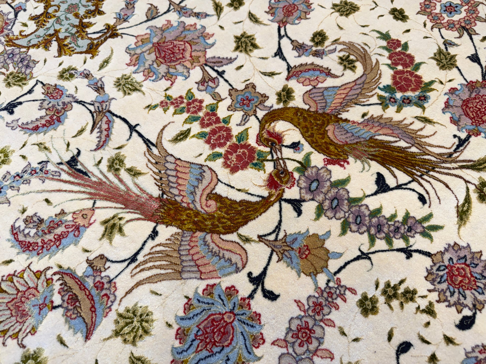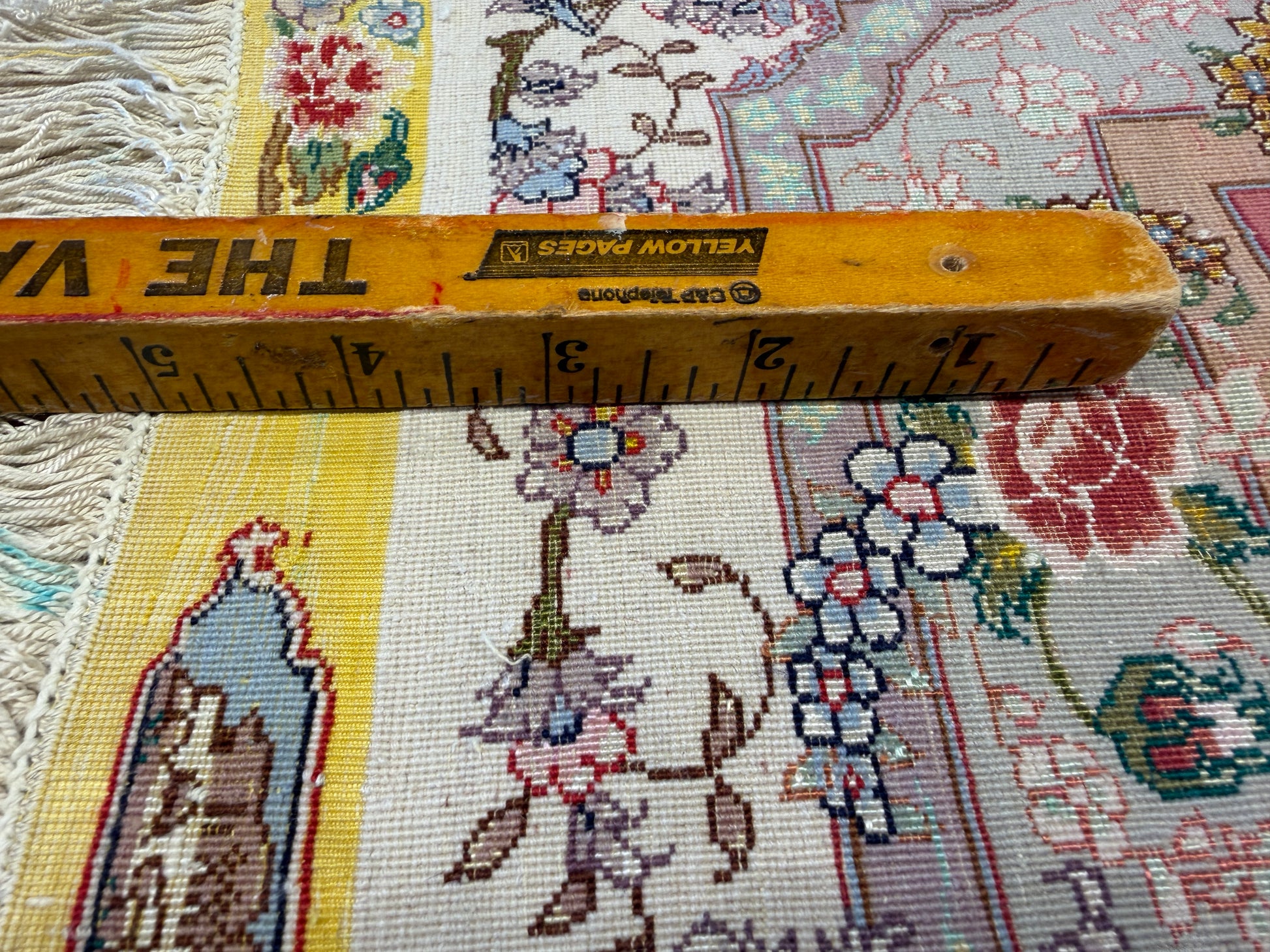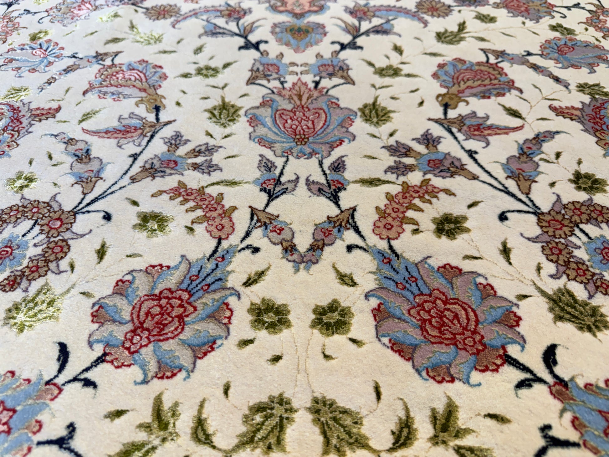 Crafted with premium wool and silk accents, the rug’s vibrant red and ivory palette is framed by richly ornamented borders, enhancing its visual depth and sophistication. Its generous 9’9” x 13’9” size makes it a statement piece, ideal for grand living rooms, dining areas, or formal spaces. This collectible Tabriz rug combines durability with timeless elegance, making it a valuable addition for both interior design and investment purposes.