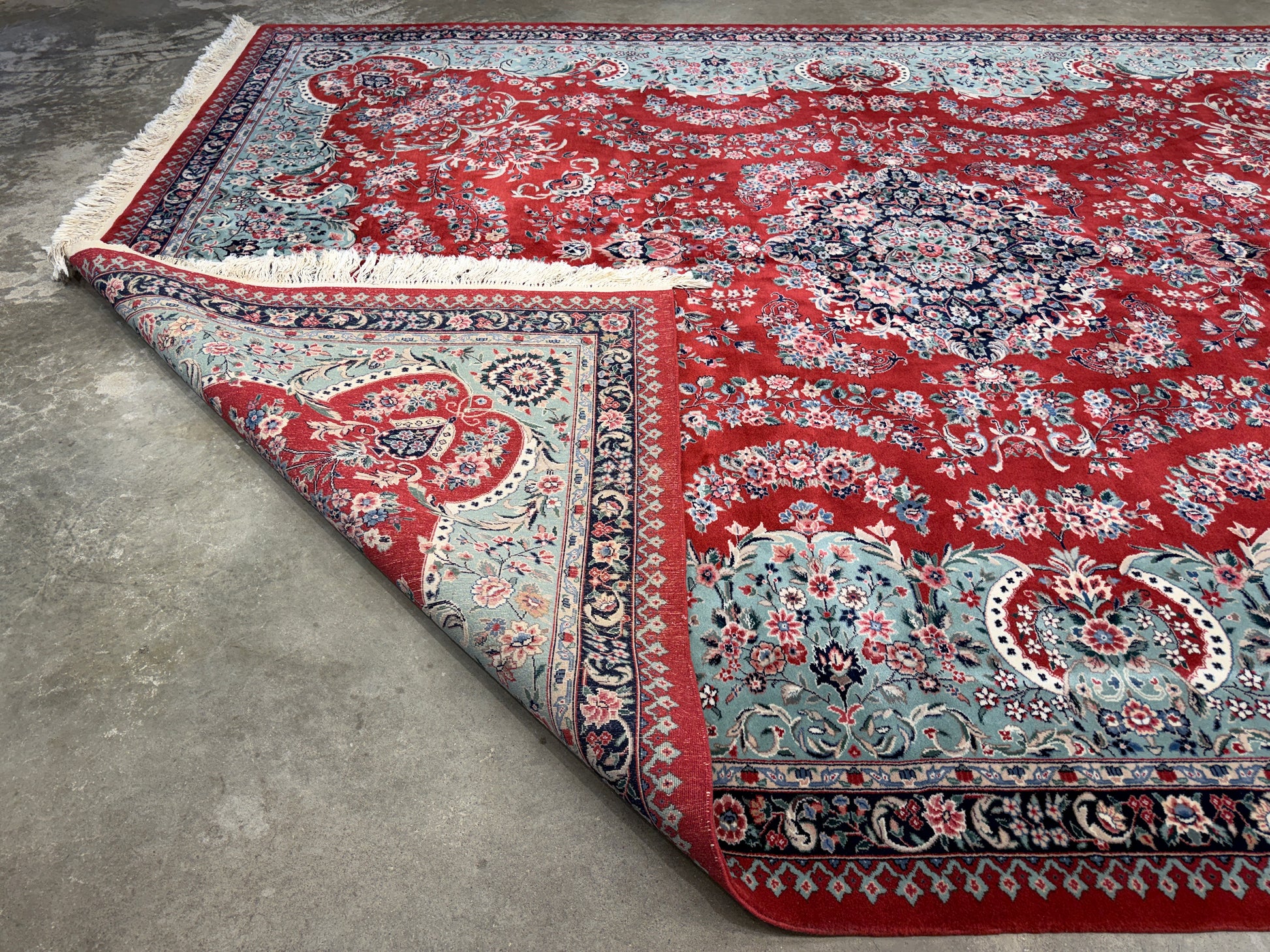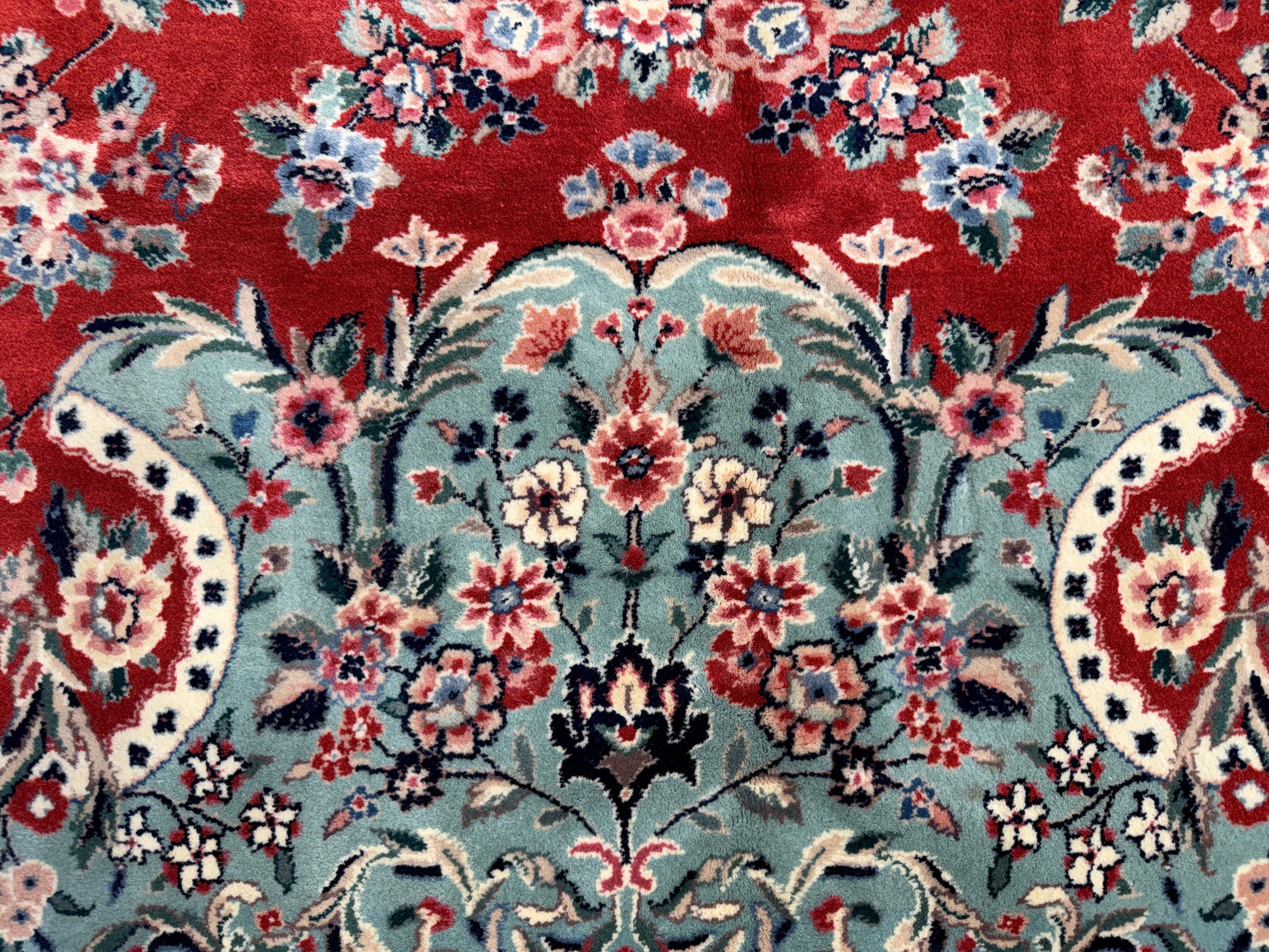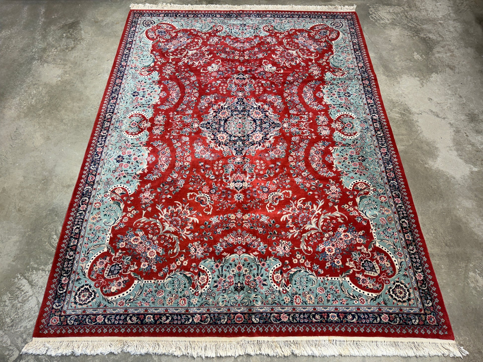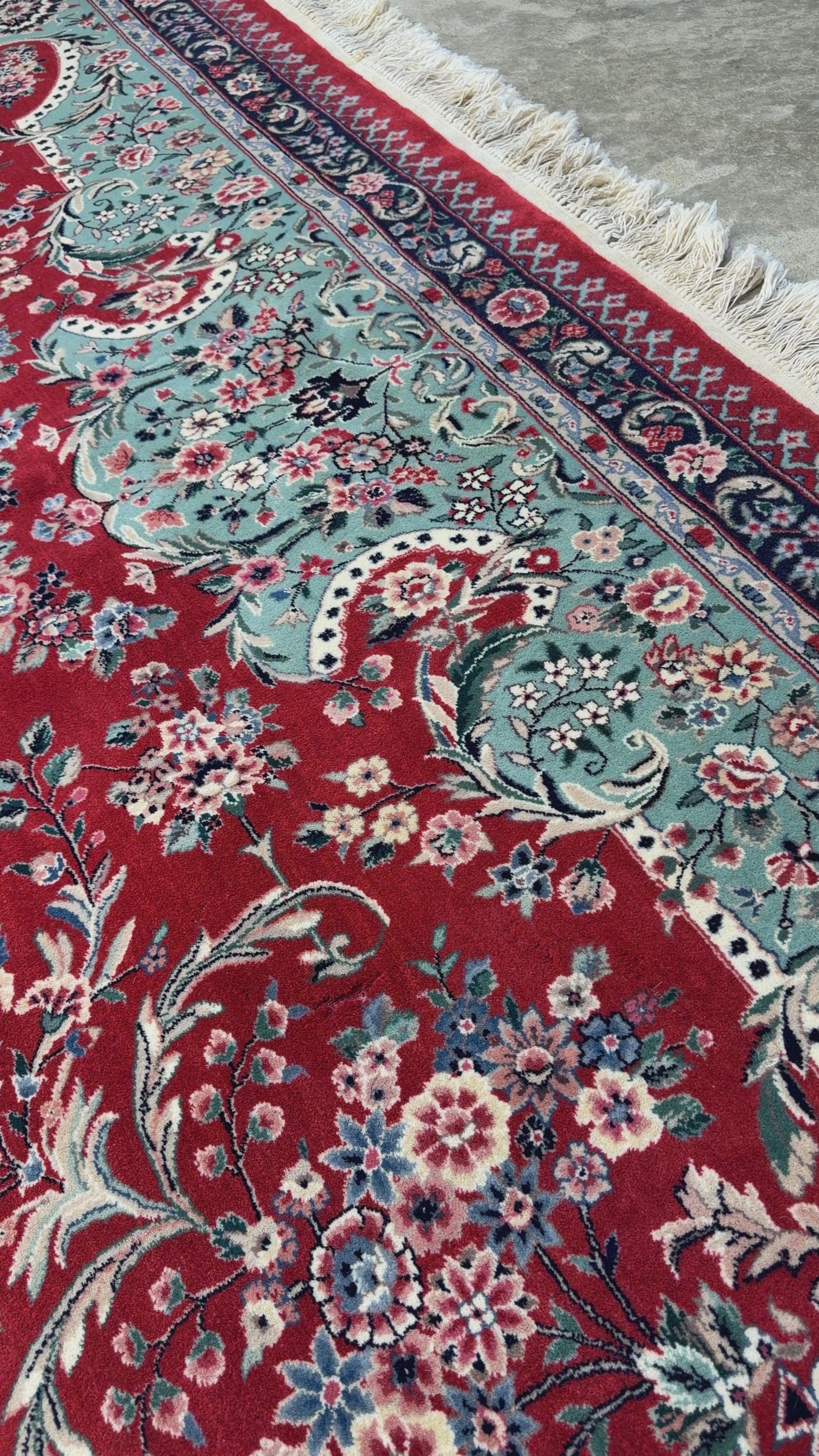 This 9’x12’ hand-knotted Sino-Persian area rug is a striking example of traditional craftsmanship, combining the elegance of Persian motifs with the meticulous technique of Chinese rug-making. Woven from very fine wool, it features a rich red field adorned with intricate floral and vine patterns, surrounding a central medallion that adds depth and symmetry to the design. Delicate blues, creams, and subtle greens accent the flowers and borders, creating a harmonious balance of color and pattern throughout the piece.