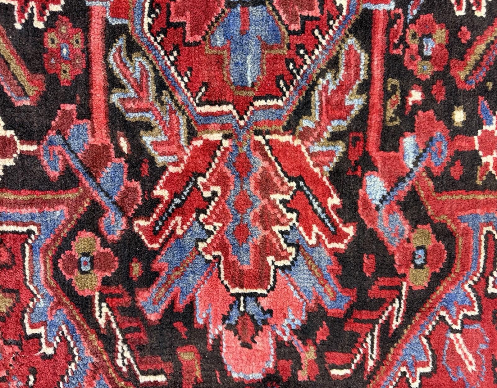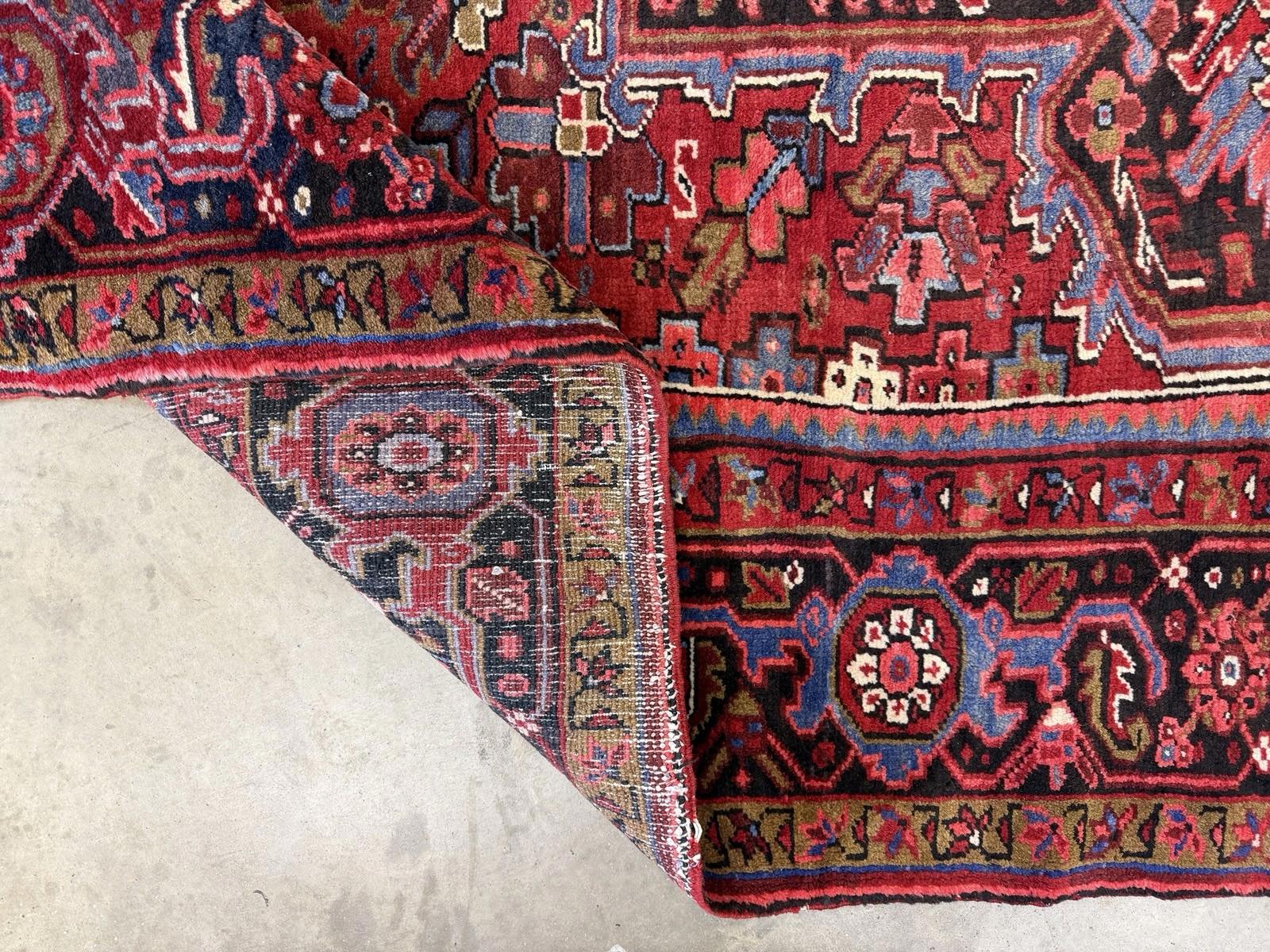 This vintage Herize handmade rug features a beautiful red Oriental geometric design, perfect for adding a touch of traditional elegance to any room in your home. Measuring 9 x 13 ft and hand-knotted with high-quality 100% wool, this area rug is not only stylish but also allergy-friendly, noise-reducing, and easy to clean. Ideal for living areas, bedrooms, and more, this one-of-a-kind rug is eco-friendly, kid-friendly, and suitable for floor heating. Its durable construction and unique medallion pattern make it a standout piece that will last for generations to come.