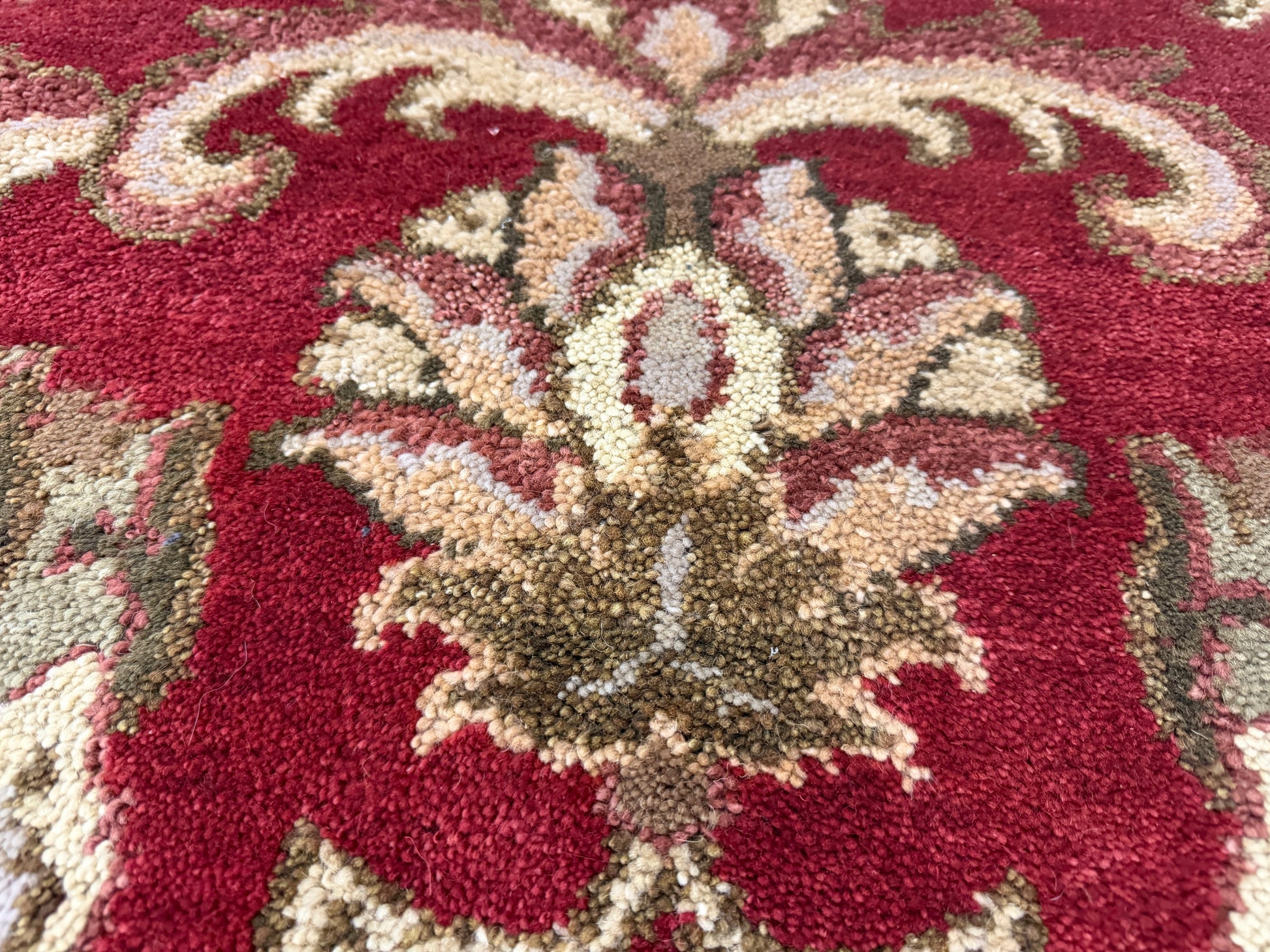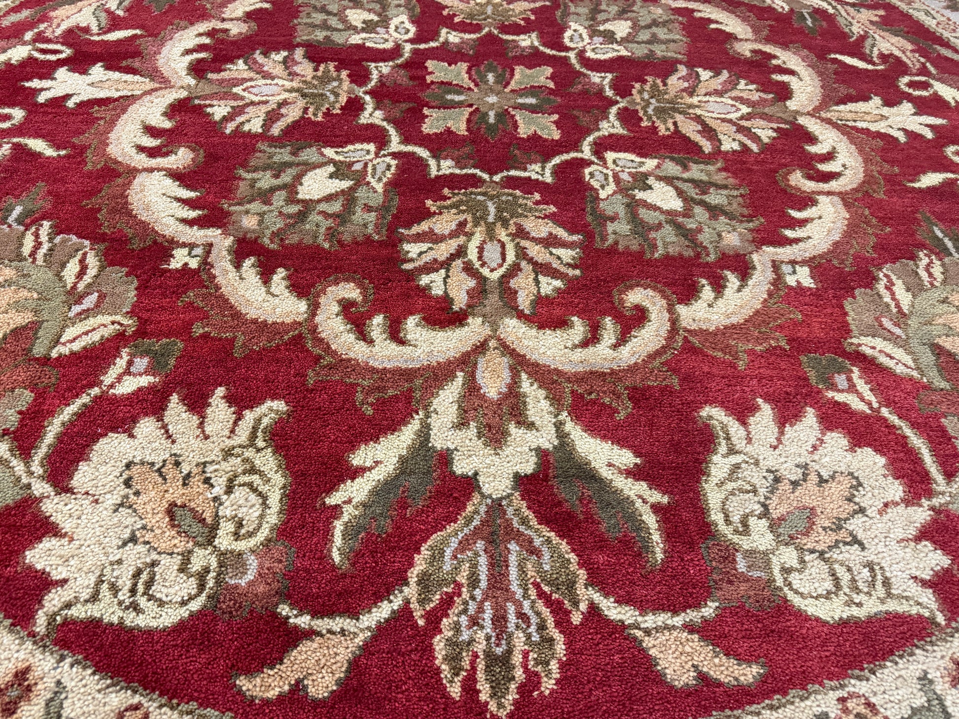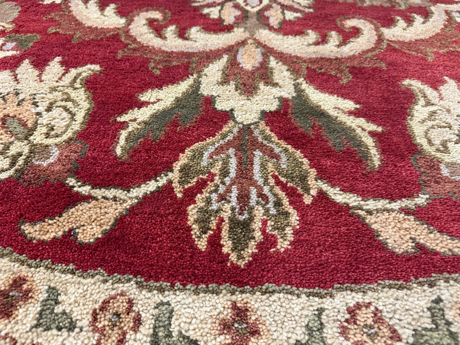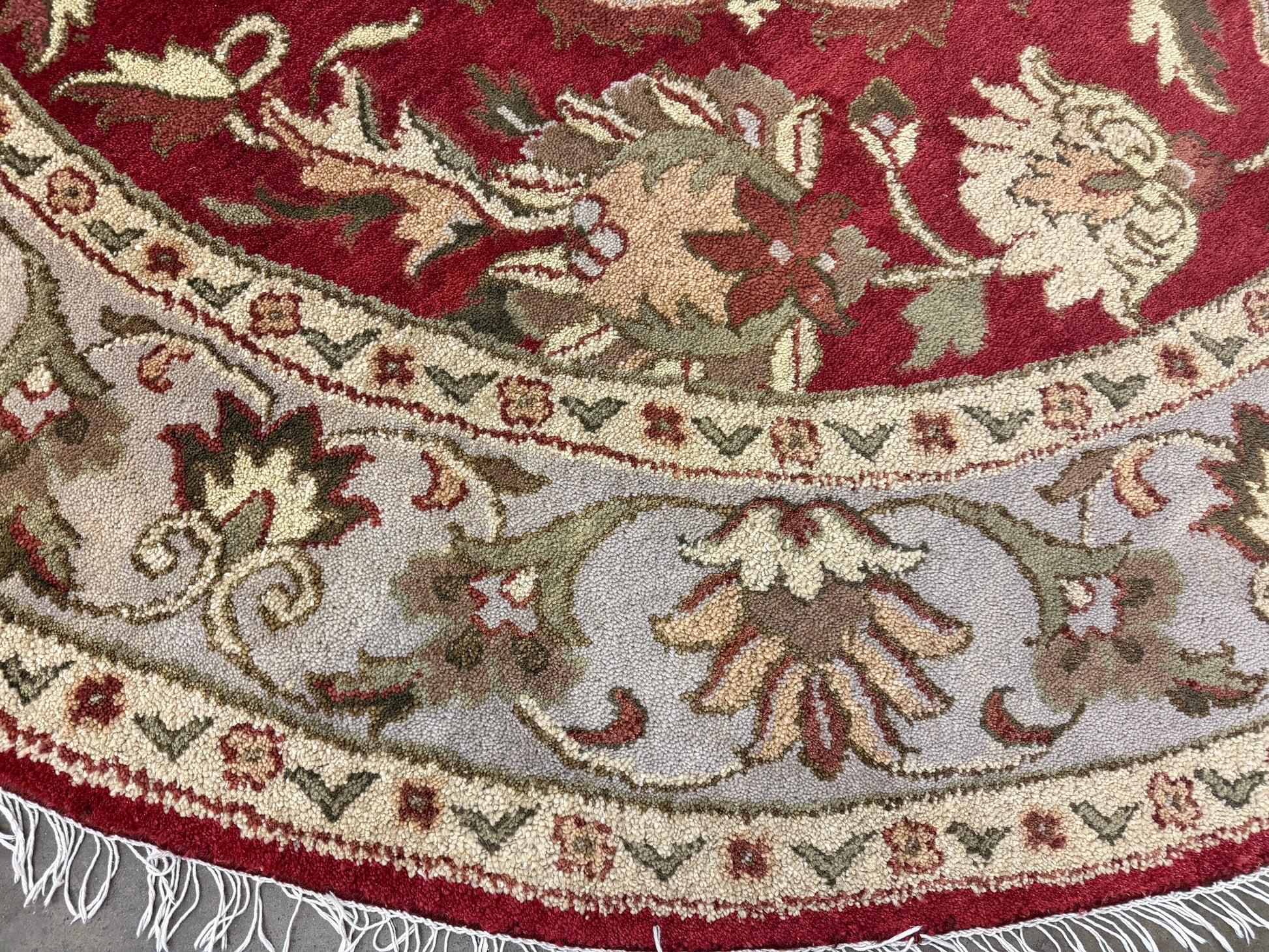 This 8’ diameter exquisite hand-knotted 100% wool pile round oriental rug is a traditional style area rug suitable for any room. The rug features a red all-over pattern, low pile height, and is handmade in India. With features like being antistatic, noise-reducing, allergy-friendly, and easy to clean, this one-of-a-kind rug is not only stylish but also functional for high traffic areas in your home. Its organic and eco-friendly materials make it a great addition to any space, adding a touch of nature and elegance to your decor.