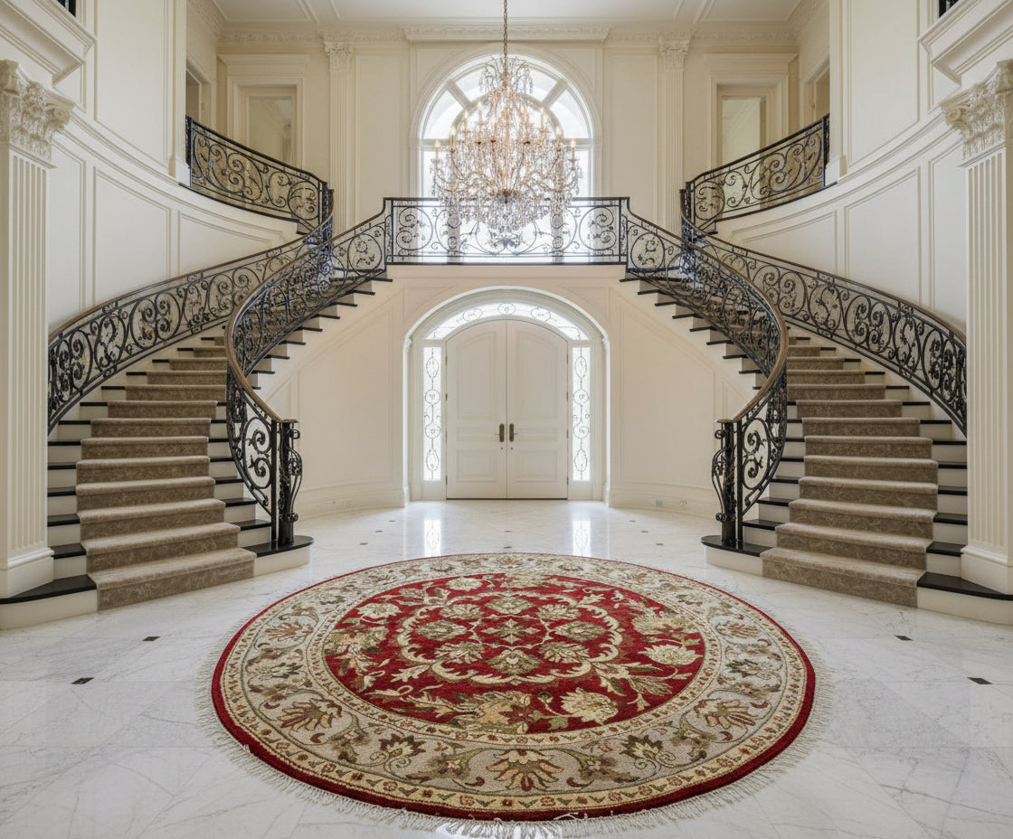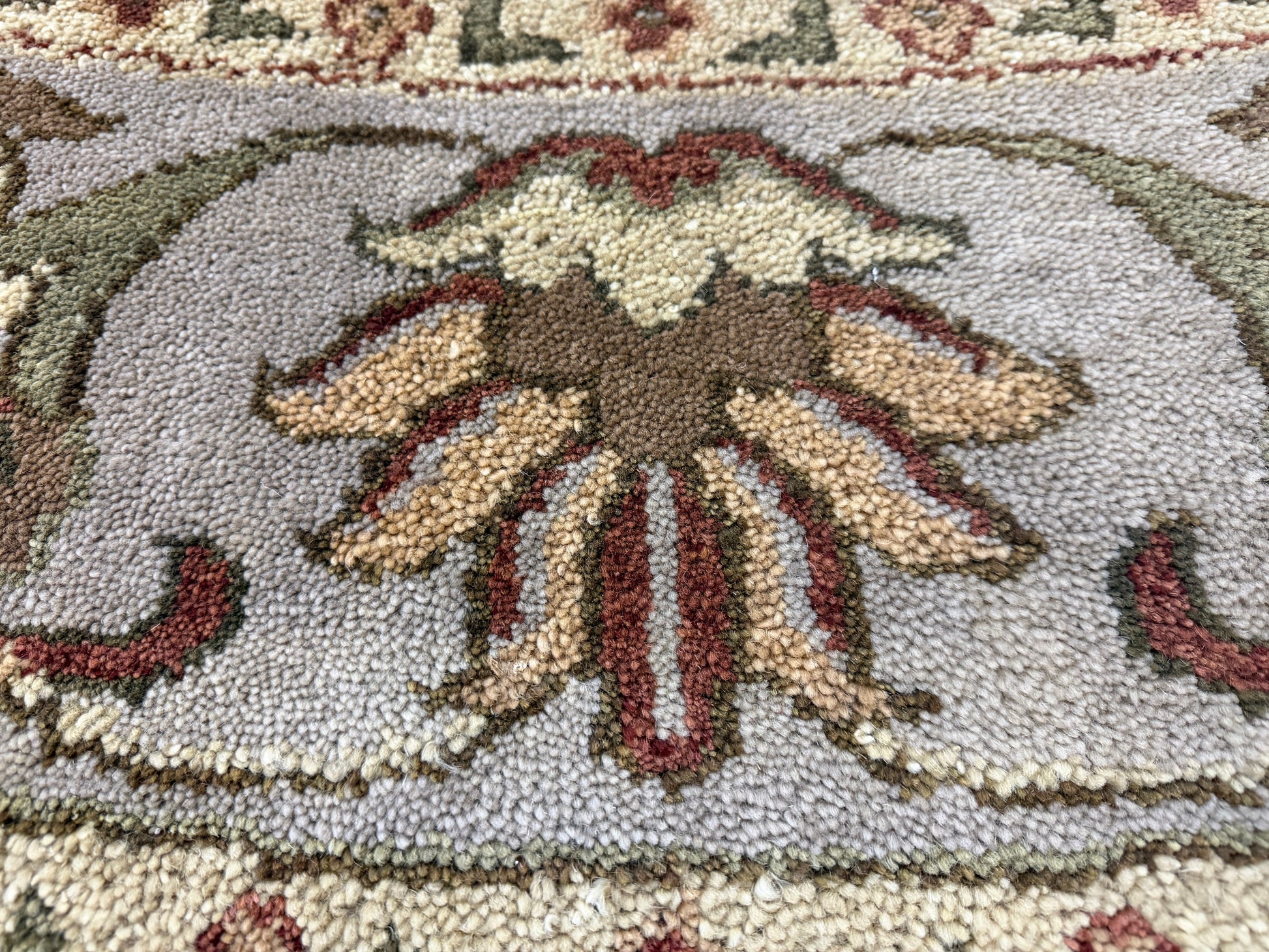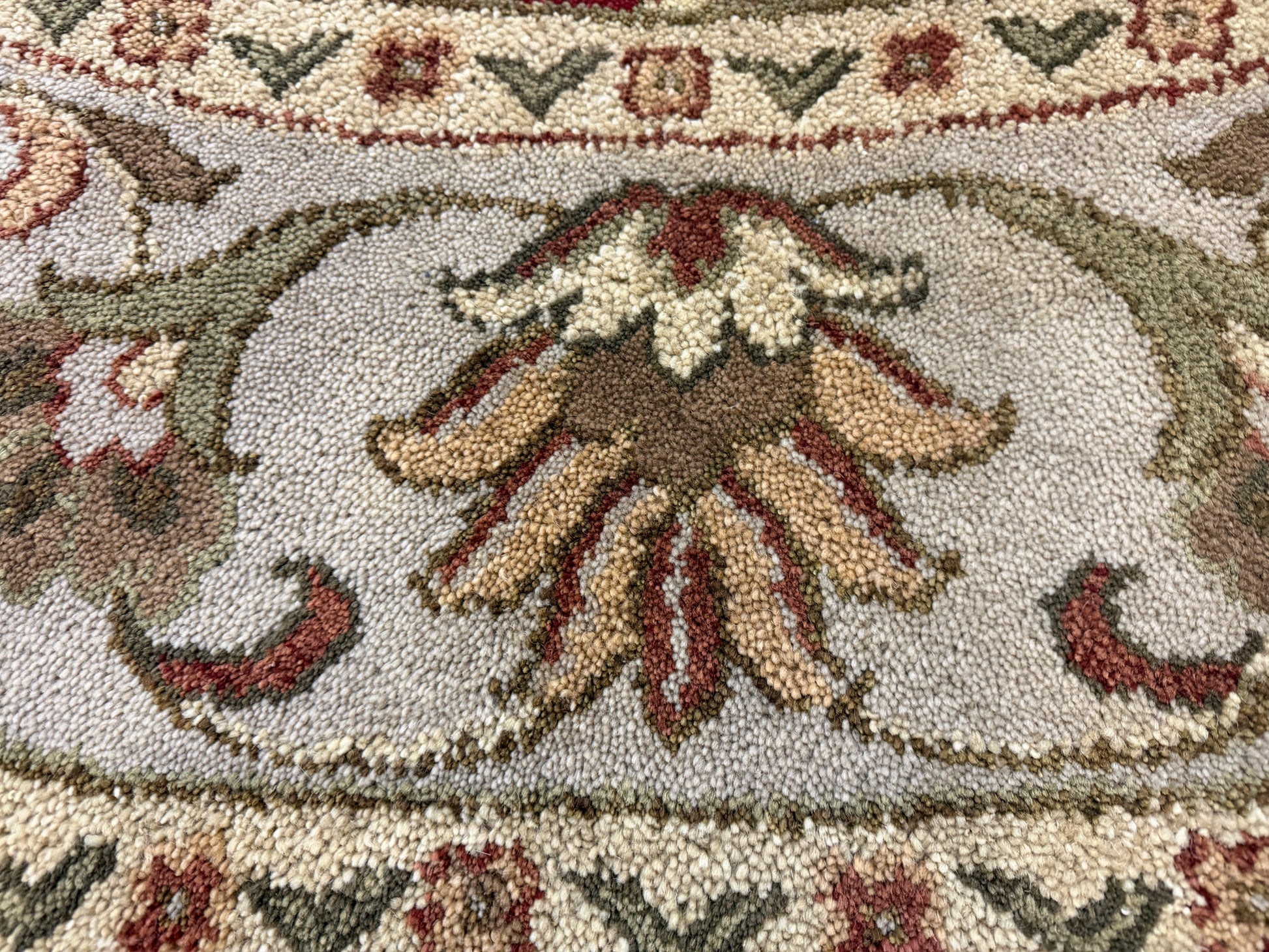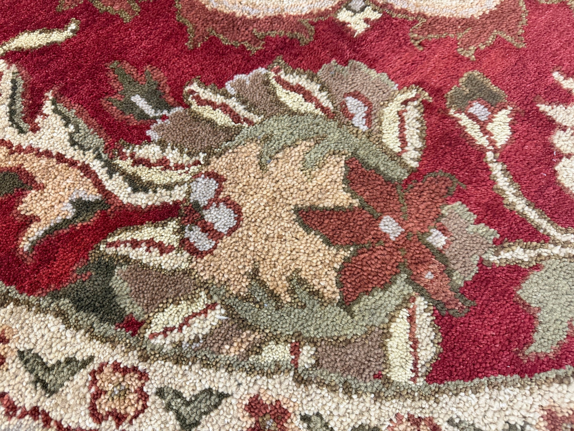 This 8’ diameter exquisite hand-knotted 100% wool pile round oriental rug is a traditional style area rug suitable for any room. The rug features a red all-over pattern, low pile height, and is handmade in India. With features like being antistatic, noise-reducing, allergy-friendly, and easy to clean, this one-of-a-kind rug is not only stylish but also functional for high traffic areas in your home. Its organic and eco-friendly materials make it a great addition to any space, adding a touch of nature and elegance to your decor.